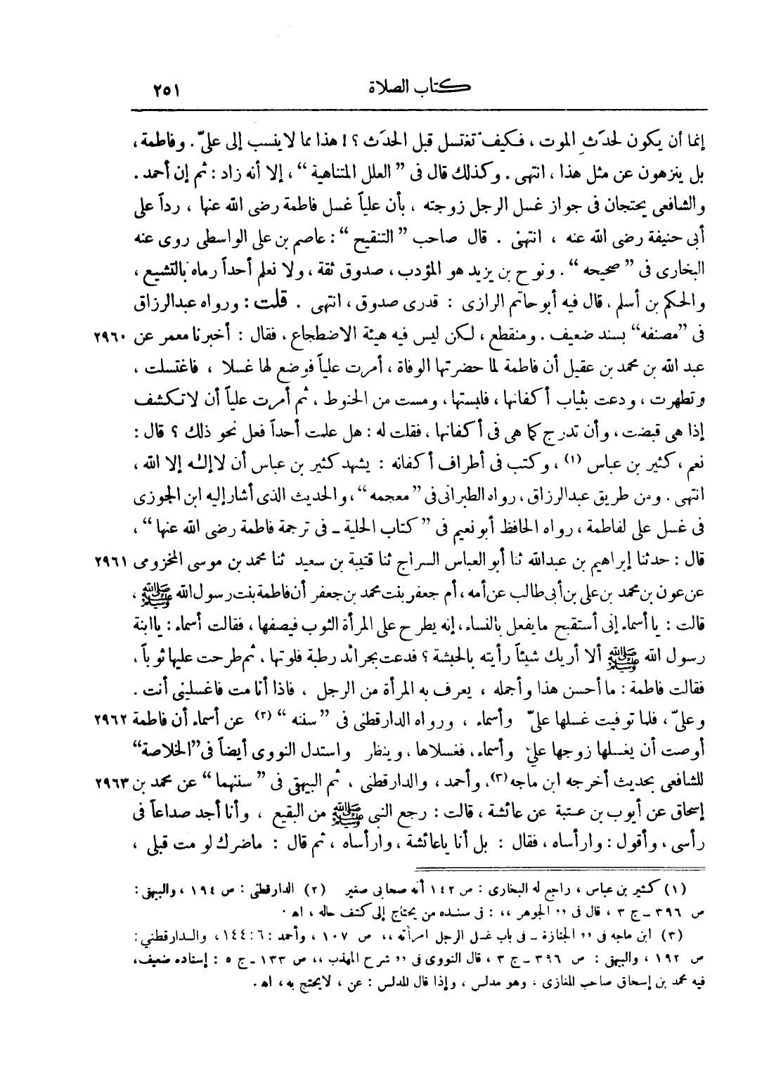 إمَّا أَنْ يَكُونَ لِحَدَثِ الْمَوْتِ، فَكَيْفَ تَغْتَسِلُ قَبْلَ الْحَدَثِ؟! هَذَا مِمَّا لَا يُنْسَبُ إلَى عَلِيٍّ. وَفَاطِمَةَ، بَلْ يُنَزَّهُونَ عَنْ مِثْلِ هَذَا، انْتَهَى. وَكَذَلِكَ قَالَ فِي "الْعِلَلِ الْمُتَنَاهِيَةِ"، إلَّا أَنَّهُ زَادَ: ثُمَّ إنَّ أَحْمَدَ. وَالشَّافِعِيَّ يَحْتَجَّانِ فِي جَوَازِ غُسْلِ الرَّجُلِ زَوْجَتِهِ، بِأَنَّ عَلِيًّا غَسَّلَ فَاطِمَةَ رضي الله عنها، رَدًّا عَلَى أَبِي حَنِيفَةَ رضي الله عنه، انْتَهَى. قَالَ صَاحِبُ "التَّنْقِيحِ": عَاصِمُ بْنُ عَلِيٍّ الْوَاسِطِيُّ رَوَى عَنْهُ الْبُخَارِيُّ فِي "صَحِيحِهِ". وَنُوحُ بْنُ يَزِيدَ هُوَ الْمُؤَدِّبُ، صَدُوقٌ ثِقَةٌ، وَلَا نَعْلَمُ أَحَدًا رَمَاهُ بِالتَّشَيُّعِ، وَالْحَكَمُ بْنُ أَسْلَمَ، قَالَ فِيهِ أَبُو حَاتِمٍ الرَّازِيُّ: قَدَرِيٌّ صَدُوقٌ، انْتَهَى.