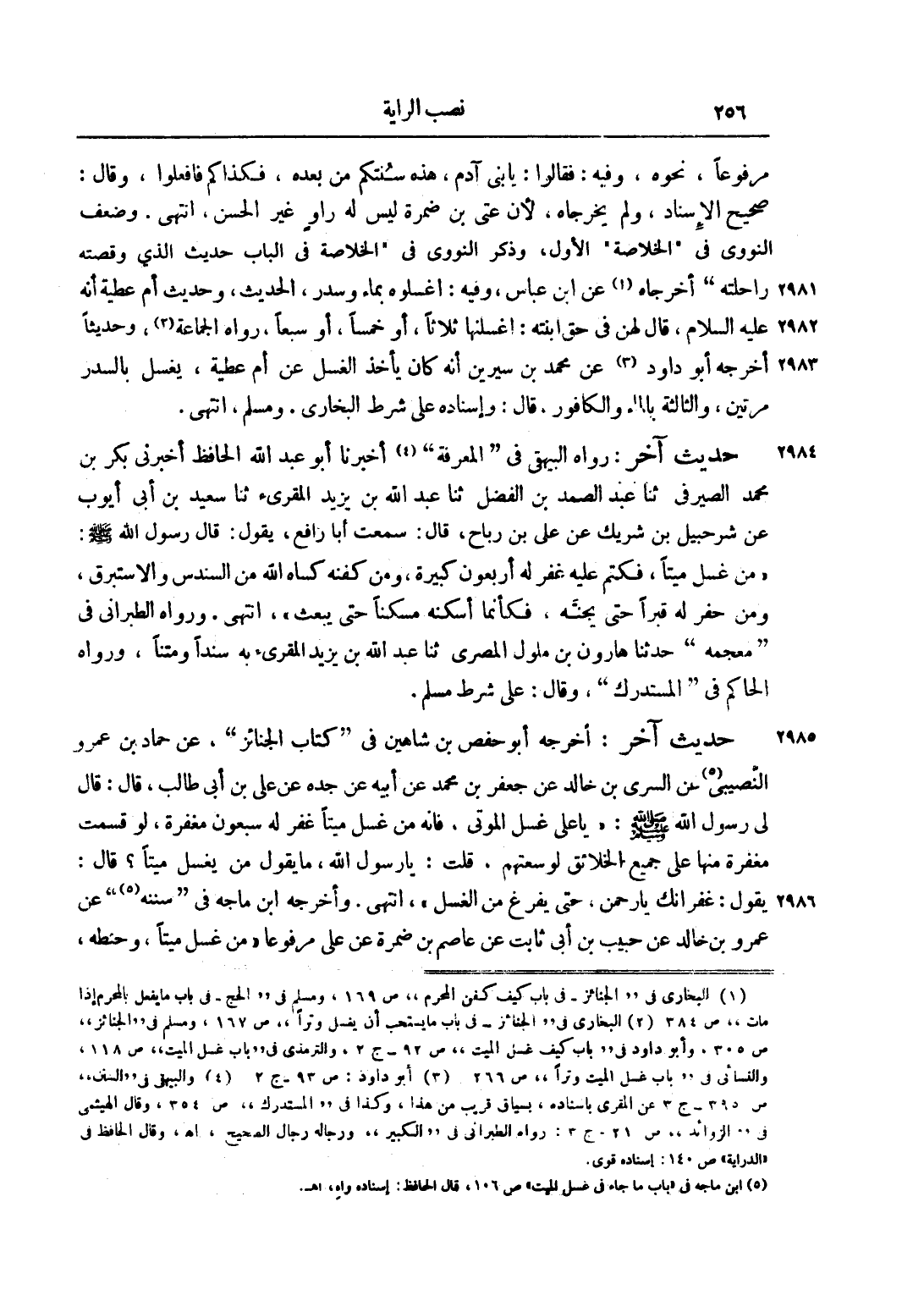 مَرْفُوعًا، نَحْوَهُ، وَفِيهِ: فَقَالُوا: يَا بَنِي آدَمَ، هَذِهِ سُنَّتُكُمْ مِنْ بَعْدِهِ، فَكَذَاكُمْ فَافْعَلُوا، وَقَالَ: صَحِيحُ الْإِسْنَادِ، وَلَمْ يُخْرِجَاهُ، لِأَنَّ عُتَيَّ بْنَ ضَمْرَةَ لَيْسَ لَهُ رَاوٍ غَيْرُ الْحَسَنِ، انْتَهَى. وَضَعَّفَ النَّوَوِيُّ فِي "الْخُلَاصَةِ" الْأَوَّلَ، وَذَكَرَ النَّوَوِيُّ فِي "الْخُلَاصَةِ فِي بَابِ حَدِيثِ الَّذِي وَقَصَتْهُ رَاحِلَتُهُ" أَخْرَجَاهُ1 عَنْ ابْنِ عَبَّاسٍ، وَفِيهِ: اغْسِلُوهُ بِمَاءٍ وَسِدْرٍ، الْحَدِيثَ، وَحَدِيثُ أُمِّ عَطِيَّةَ أَنَّهُ عليه السلام، قَالَ لَهُنَّ فِي حَقِّ ابْنَتِهِ: اغْسِلْنَهَا ثَلَاثًا، أَوْ خَمْسًا، أَوْ سَبْعًا، رَوَاهُ الْجَمَاعَةُ2، وَحَدِيثٌ أَخْرَجَهُ أَبُو دَاوُد3 عَنْ مُحَمَّدِ بْنِ سِيرِينَ أَنَّهُ كَانَ يَأْخُذُ الْغُسْلَ عَنْ أُمِّ عَطِيَّةَ، يُغْسَلُ بِالسِّدْرِ مَرَّتَيْنِ، وَالثَّالِثَةُ بِالْمَاءِ وَالْكَافُورِ، قَالَ: وَإِسْنَادُهُ عَلَى شَرْطِ الْبُخَارِيِّ. وَمُسْلِمٍ، انْتَهَى.