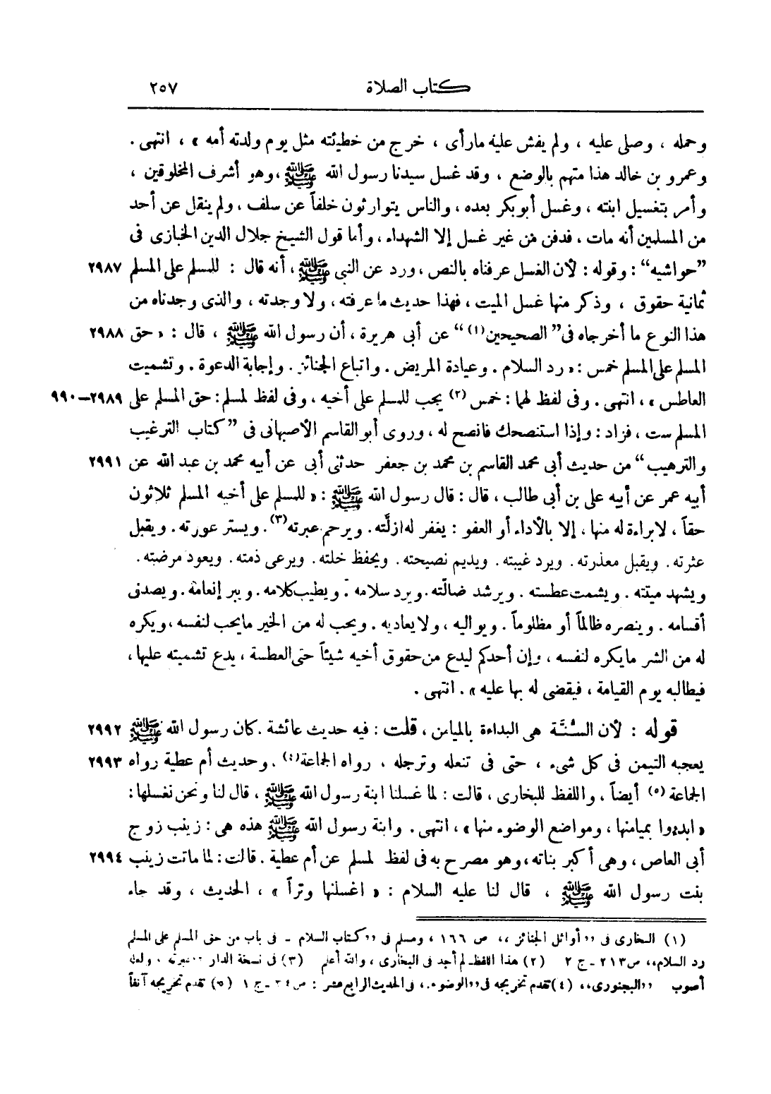 وَحَمَلَهُ، وَصَلَّى عَلَيْهِ، وَلَمْ يُفْشِ عَلَيْهِ مَا رَأَى، خَرَجَ مِنْ خَطِيئَتِهِ مِثْلَ يَوْمِ وَلَدَتْهُ أُمُّهُ"، انْتَهَى. وَعَمْرُو بْنُ خَالِدٍ هَذَا مُتَّهَمٌ بِالْوَضْعِ، وَقَدْ غَسَّلَ سَيِّدُنَا رَسُولُ اللَّهِ صَلَّى اللَّهُ عَلَيْهِ وَسَلَّمَ، وَهُوَ أَشْرَفُ الْمَخْلُوقِينَ، وَأَمَرَ بِتَغْسِيلِ ابْنَتِهِ، وَغَسَّلَ أَبُو بَكْرٍ بَعْدَهُ، وَالنَّاسُ يَتَوَارَثُونَ خَلَفًا عَنْ سَلَفٍ، وَلَمْ يُنْقَلْ عَنْ أَحَدٍ مِنْ الْمُسْلِمِينَ أَنَّهُ مَاتَ، فَدُفِنَ مِنْ غَيْرِ غُسْلٍ إلَّا الشُّهَدَاءَ، وَأَمَّا قَوْلُ الشَّيْخِ جَلَالِ الدِّينِ الْخَبَّازِيِّ فِي "حَوَاشِيهِ": وَقَوْلُهُ: لِأَنَّ الْغُسْلَ عَرَفْنَاهُ بِالنَّصِّ، وَرَدَ عَنْ النَّبِيِّ صَلَّى اللَّهُ عَلَيْهِ وَسَلَّمَ، أَنَّهُ قَالَ: "لِلْمُسْلِمِ عَلَى الْمُسْلِمِ ثَمَانِيَةُ حُقُوقٍ"، وَذَكَرَ مِنْهَا غُسْلَ الْمَيِّتِ، فَهَذَا حَدِيثٌ مَا عَرَفْتُهُ، وَلَا وَجَدْتُهُ، وَاَلَّذِي وَجَدْنَاهُ مِنْ هَذَا النَّوْعِ مَا أَخْرَجَاهُ فِي "الصَّحِيحَيْنِ1" عَنْ أَبِي هُرَيْرَةَ، أَنَّ رَسُولَ اللَّهِ صَلَّى اللَّهُ عَلَيْهِ وَسَلَّمَ، قَالَ: "حَقُّ الْمُسْلِمِ عَلَى الْمُسْلِمِ خَمْسٌ: "رَدُّ السَّلَامِ. وَعِيَادَةُ الْمَرِيضِ. وَاتِّبَاعُ الْجَنَائِزِ. وَإِجَابَةُ الدَّعْوَةِ. وَتَشْمِيتُ الْعَاطِسِ"، انْتَهَى. وَفِي لَفْظٍ لَهُمَا: خَمْسٌ2 يَجِبُ لِلْمُسْلِمِ عَلَى أَخِيهِ، وَفِي لَفْظٍ لِمُسْلِمٍ: "حَقُّ الْمُسْلِمِ عَلَى الْمُسْلِمِ سِتٌّ"، فَزَادَ: وَإِذَا اسْتَنْصَحَك فَانْصَحْ لَهُ، وَرَوَى أَبُو الْقَاسِمِ الْأَصْبَهَانِيُّ فِي "كِتَابِ التَّرْغِيبِ وَالتَّرْهِيبِ" مِنْ حَدِيثِ أَبِي مُحَمَّدٍ الْقَاسِمِ بْنِ مُحَمَّدِ بْنِ جَعْفَرٍ حَدَّثَنِي أَبِي عَنْ أَبِيهِ مُحَمَّدِ بْنِ عَبْدِ اللَّهِ عَنْ أَبِيهِ عُمَرَ عَنْ أَبِيهِ عَلِيِّ بْنِ أَبِي طَالِبٍ، قَالَ: قَالَ رَسُولُ اللَّهِ صَلَّى اللَّهُ عَلَيْهِ وَسَلَّمَ: "لِلْمُسْلِمِ عَلَى أَخِيهِ الْمُسْلِمِ ثَلَاثُونَ حَقًّا، لَا بَرَاءَةَ لَهُ مِنْهَا، إلَّا بِالْأَدَاءِ أَوْ الْعَفْوِ: يغفر له ذلته. وَيَرْحَمُ عِتْرَتَهُ3. وَيَسْتُرُ عَوْرَتَهُ. وَيُقِيلُ عَثْرَتَهُ. وَيَقْبَلُ مَعْذِرَتَهُ. ويرد غيبته. ويديم نصحته. وَيَحْفَظُ خُلَّتَهُ. وَيَرْعَى ذِمَّتَهُ. وَيَعُودُ مَرَضَهُ. وَيَشْهَدُ مِيتَتَهُ. وَيُشَمِّتُ عَطْسَتَهُ. وَيُرْشِدُ ضَالَّتَهُ. وَيَرُدُّ سَلَامَهُ. وَيُطَيِّبُ كَلَامَهُ. وَيَبَرُّ إنْعَامَهُ. وَيُصَدِّقُ إقْسَامَهُ. وَيَنْصُرُهُ ظَالِمًا أَوْ مَظْلُومًا. وَيُوَالِيهِ. وَلَا يُعَادِيهِ. وَيُحِبُّ لَهُ مِنْ الْخَيْرِ مَا يُحِبُّ لِنَفْسِهِ، وَيَكْرَهُ لَهُ مِنْ الشَّرِّ مَا يَكْرَهُ لِنَفْسِهِ، وَإِنَّ أَحَدَكُمْ لَيَدَعُ مِنْ حُقُوقِ أَخِيهِ شَيْئًا حَتَّى الْعَطْسَةَ، يَدَعُ تَشْمِيتَهُ عَلَيْهَا، فَيُطَالِبُهُ يَوْمَ الْقِيَامَةِ، فَيُقْضَى لَهُ بِهَا عَلَيْهِ"، انْتَهَى.