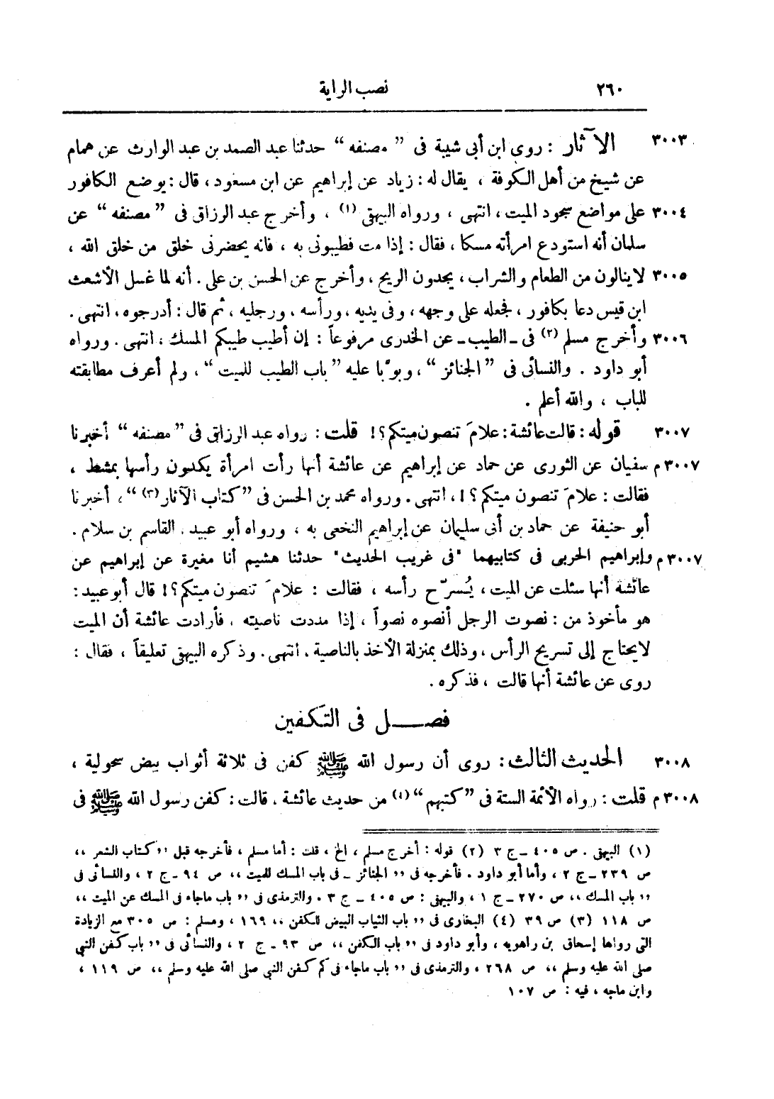 قَوْلُهُ: قَالَتْ عَائِشَةُ: عَلَامَ تَنُصُّونَ مَيِّتَكُمْ؟!، قُلْت: رَوَاهُ عَبْدُ الرَّزَّاقِ فِي "مُصَنَّفِهِ" أَخْبَرَنَا سُفْيَانُ عَنْ الثَّوْرِيِّ عَنْ حَمَّادٍ عَنْ إبْرَاهِيمَ عَنْ عَائِشَةَ أَنَّهَا رَأَتْ امْرَأَةً يَكُدُّونَ رَأْسَهَا بِمُشْطٍ، فَقَالَتْ: عَلَامَ تَنُصُّونَ مَيِّتَكُمْ؟!، انْتَهَى. وَرَوَاهُ مُحَمَّدُ بْنُ الْحَسَنِ فِي "كِتَابِ الْآثَارِ3"، أَخْبَرَنَا أَبُو حَنِيفَةَ عَنْ حَمَّادِ بْنِ أَبِي سُلَيْمَانَ عَنْ إبْرَاهِيمَ النَّخَعِيّ بِهِ، وَرَوَاهُ أَبُو عُبَيْدٍ، الْقَاسِمُ بْنُ سَلَّامٍ. وَإِبْرَاهِيمُ الْحَرْبِيُّ فِي "كِتَابَيْهِمَا فِي غَرِيبِ الْحَدِيثِ" حَدَّثَنَا هشيم أخبرنا مُغِيرَةُ عَنْ إبْرَاهِيمَ عَنْ عَائِشَةَ أَنَّهَا سُئِلَتْ عَنْ الْمَيِّتِ، يُسَرَّحُ رَأْسُهُ، فَقَالَتْ: عَلَامَ تَنُصُّونَ مَيِّتَكُمْ؟! قَالَ أَبُو عُبَيْدٍ: هُوَ مَأْخُوذٌ مِنْ: نَصَوْت الرَّجُلَ أَنْصُوهُ نَصْوًا، إذَا مَدَدْت نَاصِيَتَهُ، فَأَرَادَتْ عَائِشَةُ أَنَّ الْمَيِّتَ لَا يَحْتَاجُ إلَى تَسْرِيحِ الرَّأْسِ، وَذَلِكَ بِمَنْزِلَةِ الْأَخْذِ بِالنَّاصِيَةِ، انْتَهَى. وَذَكَرَهُ الْبَيْهَقِيُّ تَعْلِيقًا، فَقَالَ: رُوِيَ عَنْ عَائِشَةَ أَنَّهَا قَالَتْ، فَذَكَرَهُ.