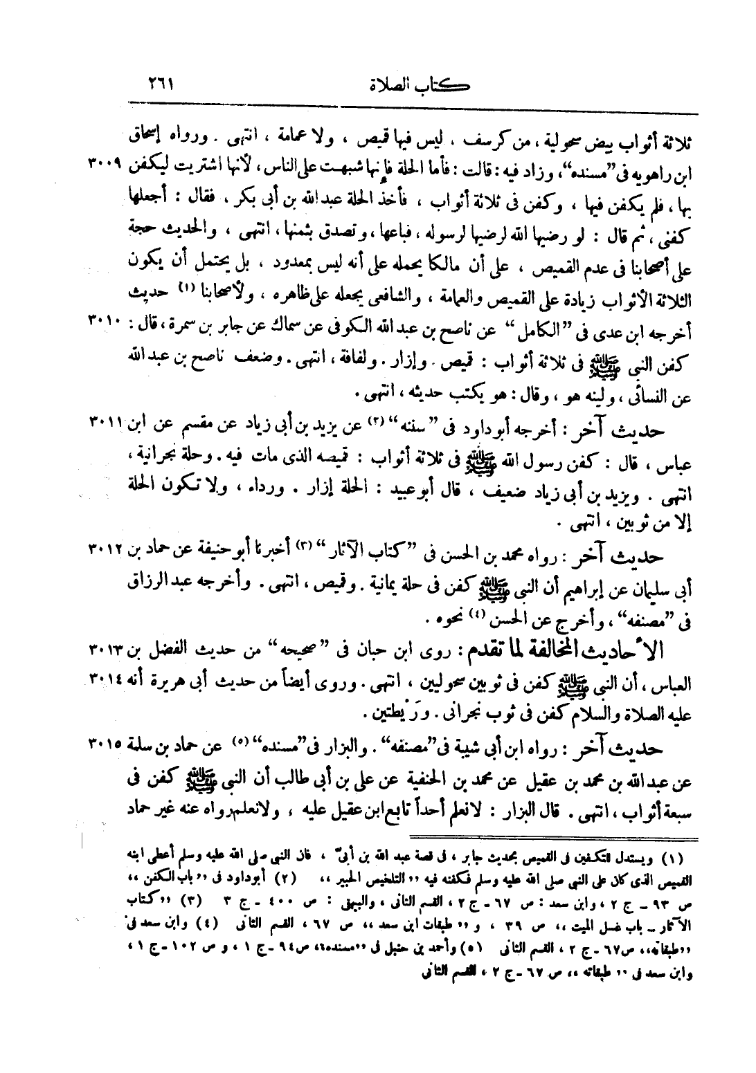 ثَلَاثَةِ أَثْوَابٍ بِيضٍ سَحُولِيَّةٍ، مِنْ كُرْسُفٍ، لَيْسَ فِيهَا قَمِيصٌ، وَلَا عِمَامَةٌ، انْتَهَى. وَرَوَاهُ إسْحَاقُ بْنُ رَاهْوَيْهِ فِي "مُسْنَدِهِ"، وَزَادَ فِيهِ: قَالَتْ: فَأَمَّا الْحُلَّةُ فَإِنَّهَا اشْتَبَهَتْ عَلَى النَّاسِ، لِأَنَّهَا اُشْتُرِيَتْ لِيُكَفَّنَ بِهَا، فَلَمْ يُكَفَّنْ فِيهَا، وَكُفِّنَ فِي ثَلَاثَةِ أَثْوَابٍ، فَأَخَذَ الْحُلَّةَ عَبْدُ اللَّهِ بْنُ أَبِي بَكْرٍ، فَقَالَ: أَجْعَلُهَا كَفَنِي، ثُمَّ قَالَ: لَوْ رَضِيَهَا اللَّهُ لَرَضِيَهَا لِرَسُولِهِ، فَبَاعَهَا، وَتَصَدَّقَ بِثَمَنِهَا، انْتَهَى. وَالْحَدِيثُ حُجَّةٌ عَلَى أَصْحَابِنَا فِي عَدَمِ الْقَمِيصِ، عَلَى أَنَّ مَالِكًا يَحْمِلُهُ عَلَى أَنَّهُ لَيْسَ بِمَعْدُودٍ، بَلْ يُحْتَمَلُ أَنْ يَكُونَ الثَّلَاثَةُ الْأَثْوَابُ زِيَادَةً عَلَى الْقَمِيصِ وَالْعِمَامَةِ، وَالشَّافِعِيُّ يَجْعَلُهُ عَلَى ظَاهِرِهِ، وَلِأَصْحَابِنَا1 حَدِيثٌ أَخْرَجَهُ ابْنُ عَدِيٍّ فِي "الْكَامِلِ" عَنْ نَاصِحِ بْنِ عَبْدِ اللَّهِ الْكُوفِيِّ عَنْ سِمَاكٍ عَنْ جَابِرِ بْنِ سَمُرَةَ، قَالَ: كُفِّنَ النَّبِيُّ صَلَّى اللَّهُ عَلَيْهِ وَسَلَّمَ فِي ثَلَاثَةِ أَثْوَابٍ: قَمِيصٍ. وَإِزَارٍ. وَلِفَافَةٍ، انْتَهَى. وَضُعِّفَ نَاصِحُ بْنُ عَبْدِ اللَّهِ عَنْ النَّسَائِيّ، وَلَيَّنَهُ هُوَ، وَقَالَ: هُوَ يُكْتَبُ حَدِيثُهُ، انْتَهَى.