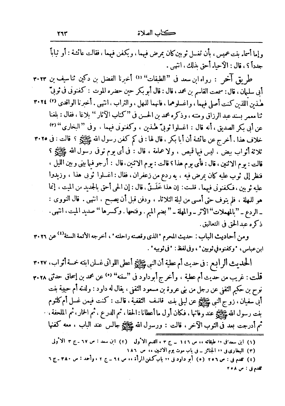 طَرِيقٌ آخَرُ: رَوَاهُ ابْنُ سَعْدٍ فِي "الطَّبَقَاتِ"1 أَخْبَرَنَا الْفَضْلُ بْنُ دُكَيْنٍ ثَنَا سَيْفُ بْنُ أَبِي سُلَيْمَانَ، قَالَ: سَمِعْت الْقَاسِمَ بْنَ مُحَمَّدٍ، قَالَ: قَالَ أَبُو بَكْرٍ حِينَ حَضَرَهُ الْمَوْتُ: كَفِّنُونِي فِي ثَوْبَيَّ هَذَيْنِ اللَّذَيْنِ كُنْت أُصَلِّي فِيهِمَا، وَاغْسِلُوهُمَا، فَإِنَّهُمَا لِلْمُهْلِ، وَالتُّرَابِ، انْتَهَى. أَخْبَرَنَا الْوَاقِدِيُّ2 ثَنَا مَعْمَرٌ بِسَنَدِ عَبْدِ الرَّزَّاقِ وَمَتْنِهِ، وَذَكَرَهُ مُحَمَّدُ بْنُ الْحَسَنِ فِي "كِتَابِ الْآثَارِ" بَلَاغًا، فَقَالَ: بَلَغَنَا عَنْ أَبِي بَكْرٍ الصِّدِّيقِ، أَنَّهُ قَالَ: اغْسِلُوا ثَوْبَيَّ هَذَيْنِ، وَكَفِّنُونِي فِيهِمَا، وَفِي "الْبُخَارِيِّ"3 خِلَافُ هَذَا، أَخْرَجَ عَنْ عَائِشَةَ أَنَّ أَبَا بَكْرٍ، قَالَ لَهَا: فِي كَمْ كُفِّنَ رَسُولُ اللَّهِ صَلَّى اللَّهُ عَلَيْهِ وَسَلَّمَ؟ قَالَتْ: فِي ثَلَاثَةِ أَثْوَابٍ بِيضٍ، لَيْسَ فِيهَا قَمِيصٌ، وَلَا عِمَامَةٌ، قَالَ: فِي أَيِّ يَوْمٍ تُوُفِّيَ رَسُولُ اللَّهِ صَلَّى اللَّهُ عَلَيْهِ وَسَلَّمَ؟ قَالَتْ: يَوْمِ الِاثْنَيْنِ، قَالَ: فَأَيُّ يَوْمٍ هَذَا؟ قَالَتْ: يَوْمُ الِاثْنَيْنِ، قَالَ: أَرْجُو فِيمَا بَيْنِي وَبَيْنَ اللَّيْلِ، فَنَظَرَ إلَى ثَوْبٍ عَلَيْهِ كَانَ يُمَرَّضُ فِيهِ، بِهِ رَدْعٌ مِنْ زَعْفَرَانٍ، فَقَالَ: اغْسِلُوا ثَوْبِي هَذَا، وَزِيدُوا عَلَيْهِ ثَوْبَيْنِ، فَكَفِّنُونِي فِيهِمَا، قَالَتْ: إنَّ هَذَا خَلَقٌ، قَالَ: إنَّ الْحَيَّ أَحَقُّ بِالْجَدِيدِ مِنْ الْمَيِّتِ، إنَّمَا هُوَ لِلْمُهْلَةِ، فَلَمْ يُتَوَفَّ حَتَّى أَمْسَى مِنْ لَيْلَةِ الثُّلَاثَاءِ، وَدُفِنَ قَبْلَ أَنْ يُصْبِحَ، انْتَهَى. قَالَ النَّوَوِيُّ: الردع "بالمهملات" الأثر والمهلمة "بِضَمِّ الْمِيمِ. وَفَتْحِهَا. وَكَسْرِهَا" صَدِيدُ الْمَيِّتِ، انْتَهَى. ذَكَرَهُ عَبْدُ الْحَقِّ فِي "التَّعَالِيقِ".