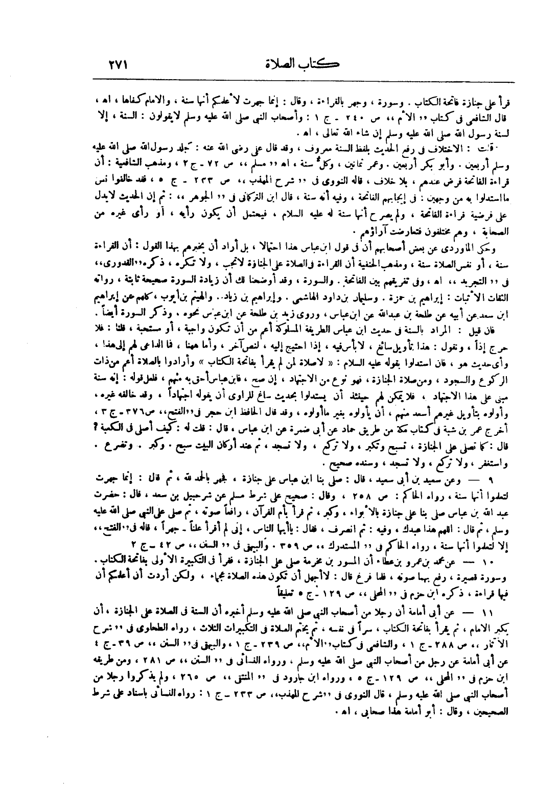 11 عن أبي أمامة أن رجلاً من أصحاب النبي صَلَّى اللَّهُ عَلَيْهِ وَسَلَّمَ أخبره أن السنة في الصلاة على الجنازة، أن يكبر الإمام، ثم يقرأ بفاتحة الكتاب، سراً في نفسه، ثم يختم الصلاة في التكبيرات الثلاث، رواه الطحاوي في "شرح الآثار" ص 288 ج 1، والشافعي في كتاب "الأم" ص 239 ج 1، والبيهقي في "السنن" ص 39 ج 4 عن أبي أمامة عن رجل من أصحاب النبي صَلَّى اللَّهُ عَلَيْهِ وَسَلَّمَ، ورواه النسائي في "السنن" ص 281، ومن طريقه ابن حزم في "المحلى" ص 129 ج 5، ورواه ابن جارود في "المنتقى" ص 265، ولم يذكروا رجلاً من أصحاب النبي صَلَّى اللَّهُ عَلَيْهِ وَسَلَّمَ، قال النووي في "شرح المهذب" ص 233 ج 1: رواه النسائي بإسناد على شرط الصحيحين، وقال: أبو أمامة هذا صحابي، اهـ.