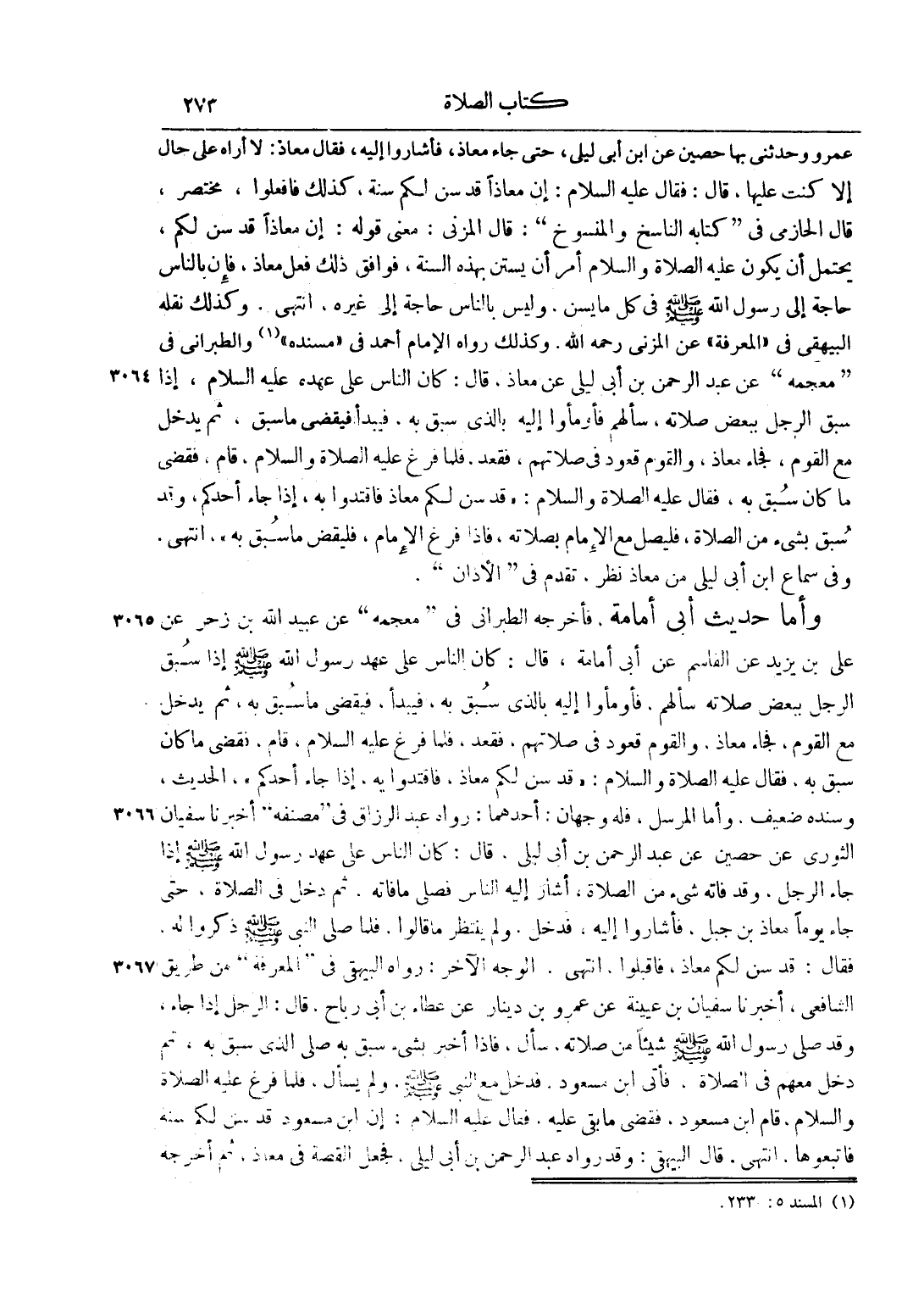 عَمْرٌو: وَحَدَّثَنِي بِهَا حُصَيْنٌ عَنْ ابْنِ أَبِي لَيْلَى، حَتَّى جاء معاذ، فأشاروا إلَيْهِ، فَقَالَ مُعَاذٌ: لَا أَرَاهُ عَلَى حَالٍ إلَّا كُنْت عَلَيْهَا، قَالَ: فَقَالَ عليه السلام: "إنَّ مُعَاذًا قَدْ سَنَّ لَكُمْ سُنَّةً، كَذَلِكَ فَافْعَلُوا"، مُخْتَصَرٌ، قَالَ الْحَازِمِيُّ فِي "كِتَابِهِ النَّاسِخِ وَالْمَنْسُوخِ": قَالَ الْمُزَنِيّ: مَعْنَى قَوْلِهِ: إنَّ مُعَاذًا قَدْ سَنَّ لَكُمْ، يُحْتَمَلُ أَنْ يَكُونَ عليه الصلاة والسلام أَمَرَ أَنْ يُسْتَنَّ بِهَذِهِ السُّنَّةِ، فَوَافَقَ ذَلِكَ فِعْلَ مُعَاذٍ، فَإِنَّ بِالنَّاسِ حَاجَةً إلَى رَسُولِ اللَّهِ صَلَّى اللَّهُ عَلَيْهِ وَسَلَّمَ فِي كُلِّ مَا يُسَنُّ، وَلَيْسَ بِالنَّاسِ حَاجَةٌ إلَى غَيْرِهِ، انْتَهَى. وَكَذَلِكَ نَقَلَهُ الْبَيْهَقِيُّ فِي "الْمَعْرِفَةِ" عَنْ الْمُزَنِيّ رحمه الله، وَكَذَلِكَ رَوَاهُ الْإِمَامُ أَحْمَدُ فِي "مُسْنَدِهِ"1. وَالطَّبَرَانِيُّ فِي "مُعْجَمِهِ" عَنْ عَبْدِ الرَّحْمَنِ بْنِ أَبِي لَيْلَى عَنْ مُعَاذٍ، قَالَ: كَانَ النَّاسُ عَلَى عَهْدِهِ عليه السلام، إذَا سُبِقَ الرَّجُلُ بِبَعْضِ صَلَاتِهِ، سَأَلَهُمْ فأومأوا إلَيْهِ بِاَلَّذِي سُبِقَ بِهِ، فَيَبْدَأُ لِيَقْضِيَ مَا سَبَقَ، ثُمَّ يَدْخُلُ مَعَ الْقَوْمِ، فَجَاءَ مُعَاذٌ، وَالْقَوْمُ قُعُودٌ فِي صَلَاتِهِمْ، فَقَعَدَ، فَلَمَّا فَرَغَ عليه الصلاة والسلام، قَامَ، فَقَضَى مَا كَانَ سُبِقَ بِهِ، فَقَالَ عليه الصلاة والسلام: "قَدْ سَنَّ لَكُمْ مُعَاذٌ فَاقْتَدُوا بِهِ، إذَا جَاءَ أَحَدُكُمْ، وَقَدْ سُبِقَ بِشَيْءٍ مِنْ الصَّلَاةِ، فَلْيُصَلِّ مَعَ الْإِمَامِ بِصَلَاتِهِ، فَإِذَا فَرَغَ الْإِمَامُ، فَلْيَقْضِ مَا سُبِقَ بِهِ"، انْتَهَى. وَفِي سَمَاعِ ابْنِ أَبِي لَيْلَى مِنْ مُعَاذٍ نَظَرٌ، تَقَدَّمَ فِي "الْأَذَانِ".