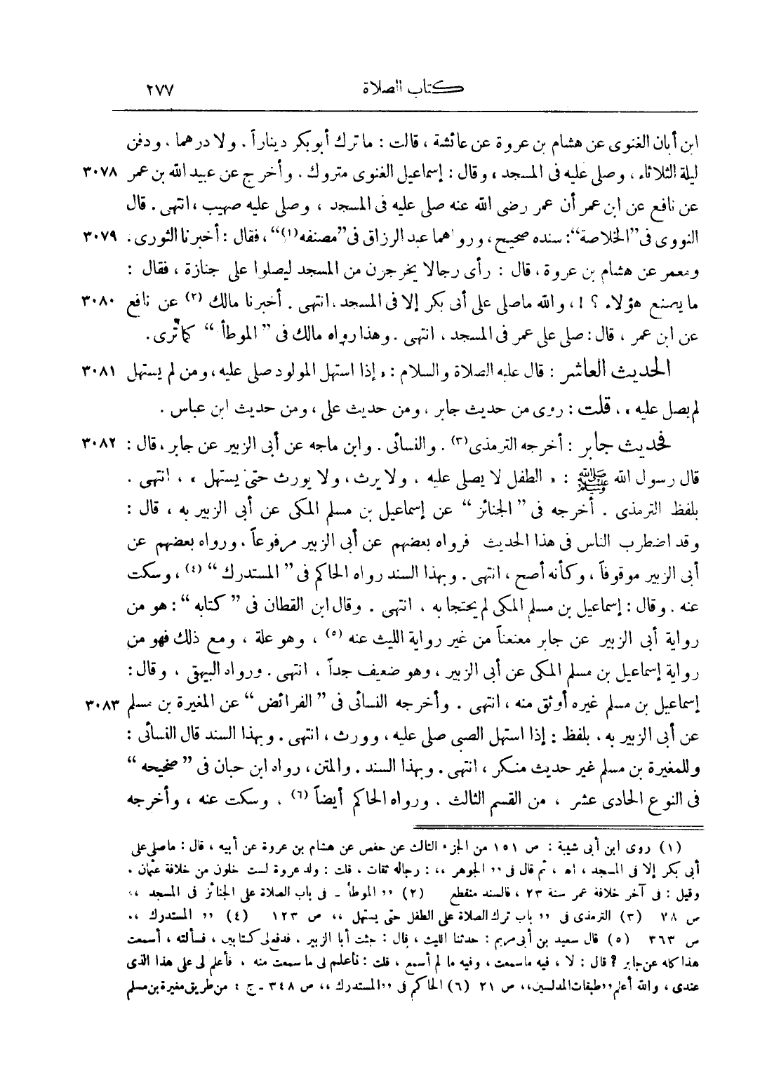 1 روى ابن أبي شيبة: ص 151 من الجزء الثالث عن حفص عن هشام بن عروة عن أبيه، قال: ما صلي على أبي بكر إلا في المسجد، اهـ، ثم قال في "الجوهر": رجاله ثقات، قلت: ولد عروة لست خلون من خلافة عثمان، وقيل: في آخر خلافة عمر سنة 23، فالسند منقطع