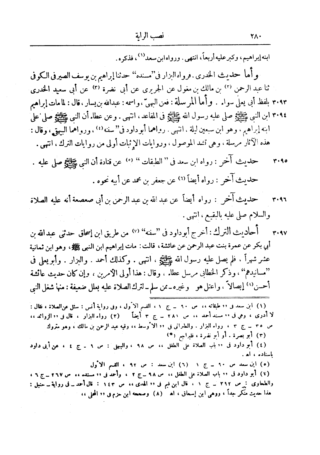 وَأَمَّا حَدِيثُ الْخُدْرِيِّ، فَرَوَاهُ الْبَزَّارُ فِي "مُسْنَدِهِ" حَدَّثَنَا إبْرَاهِيمُ بْنُ يُوسُفَ الصَّيْرَفِيُّ الْكُوفِيُّ ثَنَا عَبْدُ الرَّحْمَنِ2 بْنُ مَالِكِ بْنِ مِغْوَلٍ عَنْ الْجَرِيرِيِّ عَنْ أبي بصرة3 عَنْ أَبِي سَعِيدٍ الْخُدْرِيِّ بِلَفْظِ أَبِي يَعْلَى سَوَاءً. وَأَمَّا الْمُرْسَلَةُ: فَعَنْ الْبَهِيِّ، وَاسْمُهُ: عَبْدُ اللَّهِ بْنُ يَسَارٍ، قَالَ: لَمَّا مَاتَ إبْرَاهِيمُ ابْنُ النَّبِيِّ صَلَّى اللَّهُ عَلَيْهِ وَسَلَّمَ صَلَّى عَلَيْهِ رَسُولُ اللَّهِ صَلَّى اللَّهُ عَلَيْهِ وَسَلَّمَ فِي الْمَقَاعِدِ، انْتَهَى. وَعَنْ عَطَاءٍ أَنَّ النَّبِيَّ صَلَّى اللَّهُ عَلَيْهِ وَسَلَّمَ صَلَّى عَلَى ابْنِهِ إبْرَاهِيمَ، وَهُوَ ابْنُ سَبْعِينَ لَيْلَةً، انْتَهَى. رَوَاهُمَا أَبُو دَاوُد فِي "سُنَنِهِ4"، وَرَوَاهُمَا الْبَيْهَقِيُّ، وَقَالَ: هَذِهِ الْآثَارُ مُرْسَلَةٌ، وَهِيَ تَشُدُّ الْمَوْصُولَ، وَرِوَايَاتُ الْإِثْبَاتِ أَوْلَى مِنْ رِوَايَاتِ التَّرْكِ، انْتَهَى.