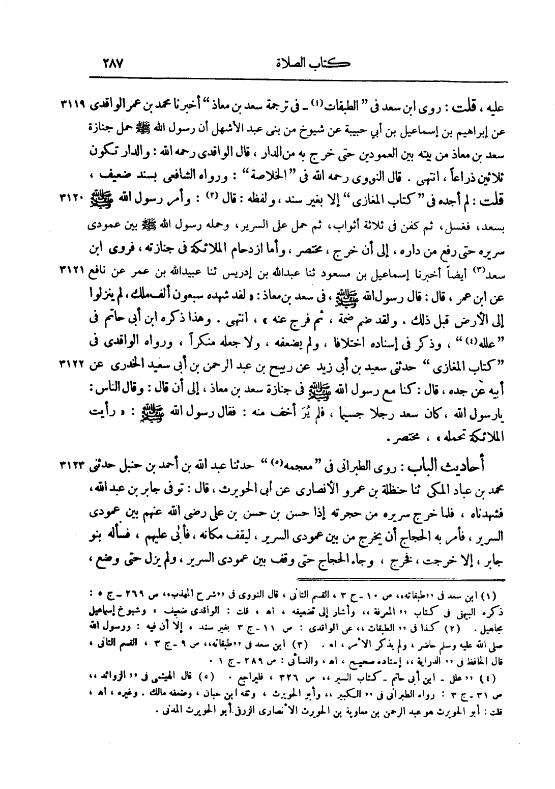عَلَيْهِ، قُلْت: رَوَى ابْنُ سَعْدٍ فِي "الطَّبَقَاتِ1 فِي تَرْجَمَةِ سَعْدِ بْنِ مُعَاذٍ" أَخْبَرَنَا مُحَمَّدُ بْنُ عُمَرَ الْوَاقِدِيُّ عَنْ إبْرَاهِيمَ بْنِ إسْمَاعِيلَ بْنِ أَبِي حَبِيبَةَ عَنْ شُيُوخٍ مِنْ بَنِي الْأَشْهَلِ أَنَّ رَسُولَ اللَّهِ صَلَّى اللَّهُ عَلَيْهِ وَسَلَّمَ حَمَلَ جِنَازَةَ سَعْدِ بْنِ مُعَاذٍ مِنْ بَيْتِهِ بَيْنَ الْعَمُودَيْنِ حَتَّى خَرَجَ بِهِ مِنْ الدَّارِ، قَالَ الْوَاقِدِيُّ رحمه الله: وَالدَّارُ تَكُونُ ثَلَاثِينَ ذِرَاعًا، انْتَهَى. قَالَ النَّوَوِيُّ رحمه الله فِي "الْخُلَاصَةِ": وَرَوَاهُ الشَّافِعِيُّ بِسَنَدٍ ضَعِيفٍ، قُلْت: لَمْ أَجِدْهُ فِي "كِتَابِ الْمَغَازِي" إلَّا بِغَيْرِ سَنَدٍ، وَلَفْظُهُ: قَالَ2: وَأَمَرَ رَسُولُ اللَّهِ صَلَّى اللَّهُ عَلَيْهِ وَسَلَّمَ بِسَعْدٍ، فَغُسِّلَ، ثُمَّ كُفِّنَ فِي ثَلَاثَةِ أَثْوَابٍ، ثُمَّ حُمِلَ عَلَى السَّرِيرِ، حَمَلَهُ رَسُولُ اللَّهِ صَلَّى اللَّهُ عَلَيْهِ وَسَلَّمَ بَيْنَ عَمُودَيْ سَرِيرِهِ حَتَّى رُفِعَ مِنْ دَارِهِ، إلَى أَنْ خَرَجَ، مُخْتَصَرٌ. وَأَمَّا ازْدِحَامُ الْمَلَائِكَةِ فِي جِنَازَتِهِ، فَرَوَى ابْنُ سَعْدٍ3 أَيْضًا أَخْبَرَنَا إسْمَاعِيلُ بْنُ أَبِي مَسْعُودٍ ثَنَا عَبْدُ اللَّهِ بْنُ إدْرِيسَ ثَنَا عُبَيْدُ اللَّهِ بْنُ عُمَرَ عَنْ نَافِعٍ عَنْ ابْنِ عُمَرَ، قَالَ: قَالَ رَسُولُ اللَّهِ صَلَّى اللَّهُ عَلَيْهِ وَسَلَّمَ، فِي سَعْدِ بْنِ مُعَاذٍ: "لَقَدْ شَهِدَهُ سَبْعُونَ أَلْفَ مَلَكٍ، لَمْ يَنْزِلُوا إلَى الْأَرْضِ قَبْلَ ذَلِكَ، وَلَقَدْ ضُمَّ ضَمَّةً، ثُمَّ فُرِّجَ عَنْهُ"، انْتَهَى. وَهَذَا ذَكَرَهُ ابْنُ أَبِي حَاتِمٍ فِي "عِلَلِهِ4"، وَذَكَرَ فِي إسْنَادِهِ اخْتِلَافًا، وَلَمْ يُضَعِّفْهُ، وَلَا جَعَلَهُ مُنْكَرًا، وَرَوَاهُ الْوَاقِدِيُّ فِي "كِتَابِ الْمَغَازِي" حَدَّثَنِي سَعِيدُ بْنُ أَبِي زَيْدٍ عَنْ رُبَيْحِ بْنِ عَبْدِ الرَّحْمَنِ بْنِ أَبِي سَعِيدٍ الْخُدْرِيِّ عَنْ أَبِيهِ عَنْ جَدِّهِ، قَالَ: كُنَّا مَعَ رَسُولِ اللَّهِ صَلَّى اللَّهُ عَلَيْهِ وَسَلَّمَ فِي جِنَازَةِ سَعْدِ بْنِ مُعَاذٍ، إلَى أَنْ قَالَ: وَقَالَ النَّاسُ: يَا رَسُولَ اللَّهِ، كَانَ سَعْدٌ رَجُلًا جَسِيمًا، فَلَمْ نَرَ أَخَفَّ مِنْهُ: فَقَالَ رَسُولُ اللَّهِ صَلَّى اللَّهُ عَلَيْهِ وَسَلَّمَ: "رَأَيْتُ الْمَلَائِكَةَ تَحْمِلُهُ"، مُخْتَصَرٌ.