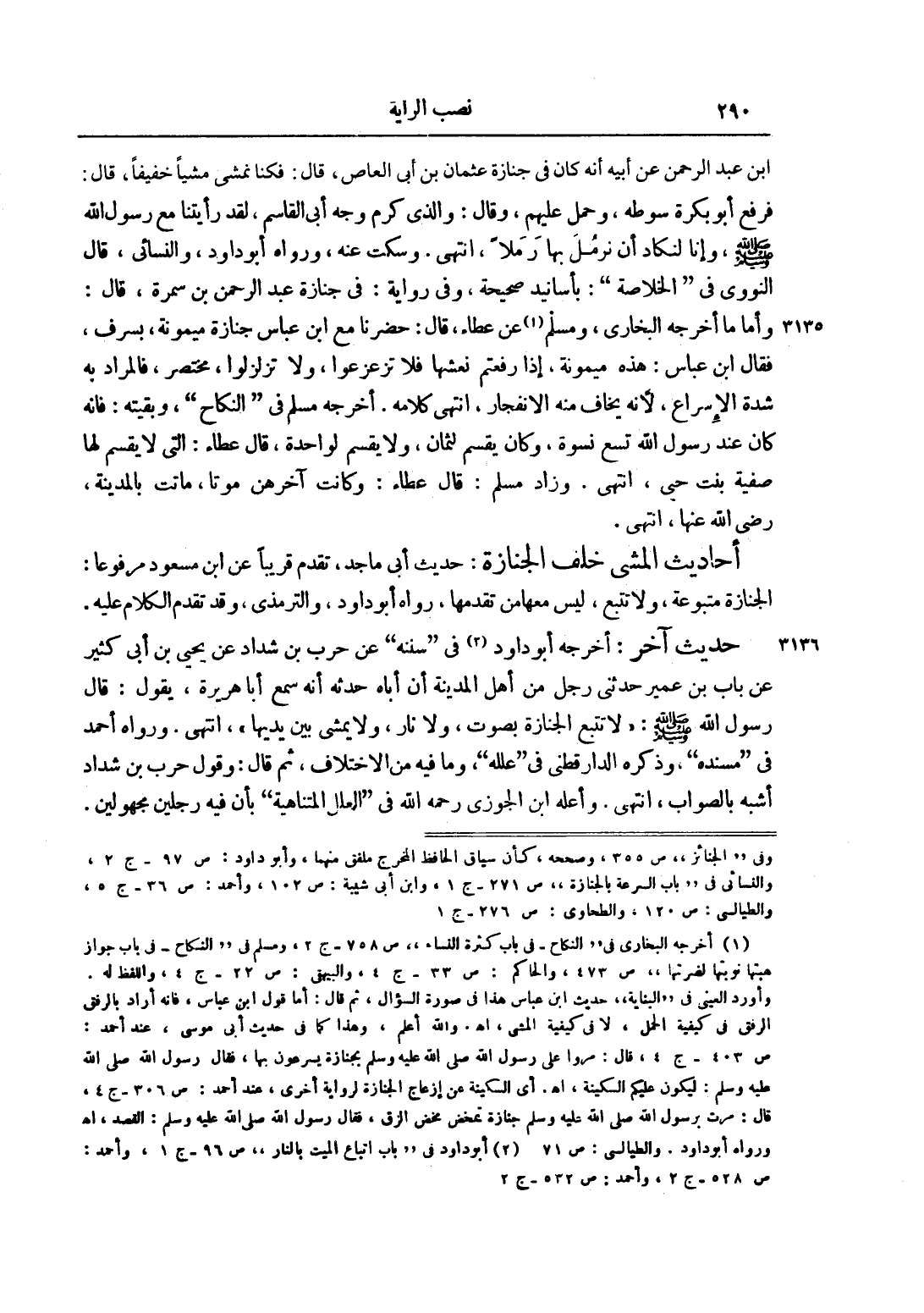 بْنِ عَبْدِ الرَّحْمَنِ عَنْ أَبِيهِ أَنَّهُ كَانَ فِي جِنَازَةِ عُثْمَانَ بْنِ الْعَاصِ، قَالَ: فَكُنَّا نَمْشِي مَشْيًا خَفِيفًا، قَالَ: فَرَفَعَ أَبُو بَكْرَةَ سَوْطَهُ، وَحَمَلَ عَلَيْهِمْ، وَقَالَ: وَاَلَّذِي كَرَّمَ وَجْهَ أَبِي الْقَاسِمِ، لَقَدْ رَأَيْتُنَا مَعَ رَسُولِ اللَّهِ صَلَّى اللَّهُ عَلَيْهِ وَسَلَّمَ، وَإِنَّا لَنَكَادُ أَنْ نَرْمُلَ بِهَا رَمَلًا، انْتَهَى. وَسَكَتَ عَنْهُ، وَرَوَاهُ أَبُو دَاوُد، وَالنَّسَائِيُّ، قَالَ النَّوَوِيُّ فِي "الْخُلَاصَةِ": بِأَسَانِيدَ صَحِيحَةٍ، وَفِي رِوَايَةٍ: فِي جِنَازَةِ عَبْدِ الرَّحْمَنِ بْنِ سَمُرَةَ، قَالَ: وَأَمَّا مَا أَخْرَجَهُ الْبُخَارِيُّ، وَمُسْلِمٌ1 عَنْ عَطَاءٍ، قَالَ: حَضَرْنَا مَعَ ابْنِ عَبَّاسٍ جِنَازَةَ مَيْمُونَةَ، بِسَرِفٍ، فَقَالَ ابْنُ عَبَّاسٍ: هَذِهِ مَيْمُونَةُ، إذَا رَفَعْتُمْ نَعْشَهَا فَلَا تُزَعْزِعُوا، وَلَا تُزَلْزِلُوا، مُخْتَصَرٌ، فَالْمُرَادُ بِهِ شِدَّةُ الْإِسْرَاعِ، لِأَنَّهُ يُخَافُ مِنْهُ الِانْفِجَارُ، انْتَهَى كَلَامُهُ. أَخْرَجَهُ مُسْلِمٌ فِي "النِّكَاحِ"، وَبَقِيَّتُهُ: فَإِنَّهُ كَانَ عِنْدَ رَسُولِ اللَّهِ تِسْعُ نِسْوَةٍ، وَكَانَ يَقْسِمُ لِثَمَانٍ، وَلَا يَقْسِمُ لِوَاحِدَةٍ، قَالَ عَطَاءٌ: الَّتِي لَا يَقْسِمُ لَهَا صفية بنت حبي، انْتَهَى. وَزَادَ مُسْلِمٌ: قَالَ عَطَاءٌ: وَكَانَتْ آخِرَهُنَّ مَوْتًا، مَاتَتْ بِالْمَدِينَةِ، رضي الله عنها، انْتَهَى.