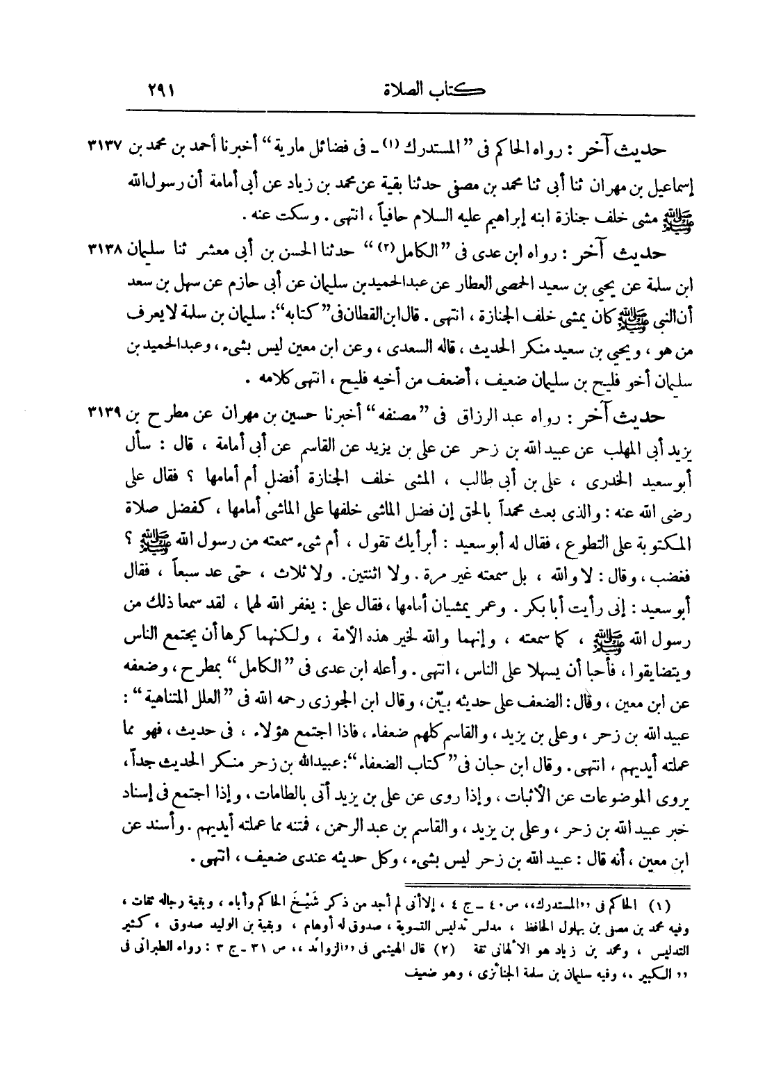 حَدِيثٌ آخَرُ: رَوَاهُ عَبْدُ الرَّزَّاقِ فِي "مُصَنَّفِهِ" أَخْبَرَنَا حُسَيْنُ بْنُ مِهْرَانَ عَنْ مُطَّرِحِ بْنِ يَزِيدَ أَبِي الْمُهَلَّبِ عَنْ عُبَيْدِ اللَّهِ بْنِ زَحْرٍ عَنْ علي بن زيد عَنْ الْقَاسِمِ عَنْ أَبِي أُمَامَةَ، قَالَ: سَأَلَ أَبُو سَعِيدٍ الْخُدْرِيِّ، عَلِيَّ بْنَ أَبِي طَالِبٍ، الْمَشْيُ خَلْفَ الْجِنَازَةِ أَفْضَلُ أَمْ أَمَامَهَا؟ فَقَالَ عَلِيٌّ رضي الله عنه: وَاَلَّذِي بَعَثَ مُحَمَّدًا بِالْحَقِّ إنَّ فَضْلَ الْمَاشِي خَلْفَهَا عَلَى الْمَاشِي أَمَامَهَا، كَفَضْلِ صَلَاةِ الْمَكْتُوبَةِ عَلَى التطوع، فقال أَبُو سَعِيدٍ: أَبِرَأْيِك تَقُولُ، أَمْ شَيْءٍ سَمِعْته مِنْ رَسُولِ اللَّهِ صَلَّى اللَّهُ عَلَيْهِ وَسَلَّمَ؟ فَغَضِبَ، وَقَالَ: لَا وَاَللَّهِ، بَلْ سَمِعْتُهُ غَيْرَ مَرَّةٍ. وَلَا اثْنَيْنِ، وَلَا ثَلَاثٍ، حَتَّى عَدَّ سَبْعًا، فَقَالَ أَبُو سَعِيدٍ: إنِّي رَأَيْت أَبَا بَكْرٍ. وَعُمَرَ يَمْشِيَانِ أَمَامَهَا، فَقَالَ عَلِيٌّ: يَغْفِرُ اللَّهُ لَهُمَا، لَقَدْ سَمِعَا ذَلِكَ مِنْ رَسُولِ اللَّهِ صَلَّى اللَّهُ عَلَيْهِ وَسَلَّمَ، كَمَا سَمِعْتُهُ، وَإِنَّهُمَا وَاَللَّهِ لَخَيْرُ هَذِهِ الْأُمَّةِ، وَلَكِنَّهُمَا كَرِهَا أَنْ يَجْتَمِعَ النَّاسُ وَيَتَضَايَقُوا، فَأَحَبَّا أَنْ يُسَهِّلَا عَلَى النَّاسِ، انْتَهَى. وَأَعَلَّهُ ابْنُ عَدِيٍّ فِي "الْكَامِلِ" بِمُطَّرِحٍ، وَضَعَّفَهُ عَنْ ابْنِ مَعِينٍ، وَقَالَ: الضَّعْفُ عَلَى حَدِيثِهِ بَيِّنٌ، وَقَالَ ابْنُ الْجَوْزِيِّ رحمه الله فِي "الْعِلَل الْمُتَنَاهِيَةِ": عُبَيْدُ اللَّهِ بْنُ زَحْرٍ، وَعَلِيُّ بْنُ يَزِيدَ، وَالْقَاسِمُ كُلُّهُمْ ضُعَفَاءُ، فَإِذَا اجْتَمَعَ هَؤُلَاءِ، فِي حَدِيثٍ، فَهُوَ مِمَّا عَمِلَتْهُ أَيْدِيهِمْ، انْتَهَى. وَقَالَ ابْنُ حِبَّانَ فِي "كتاب الضعفاء": عبد اللَّهِ بْنُ زَحْرٍ مُنْكَرُ