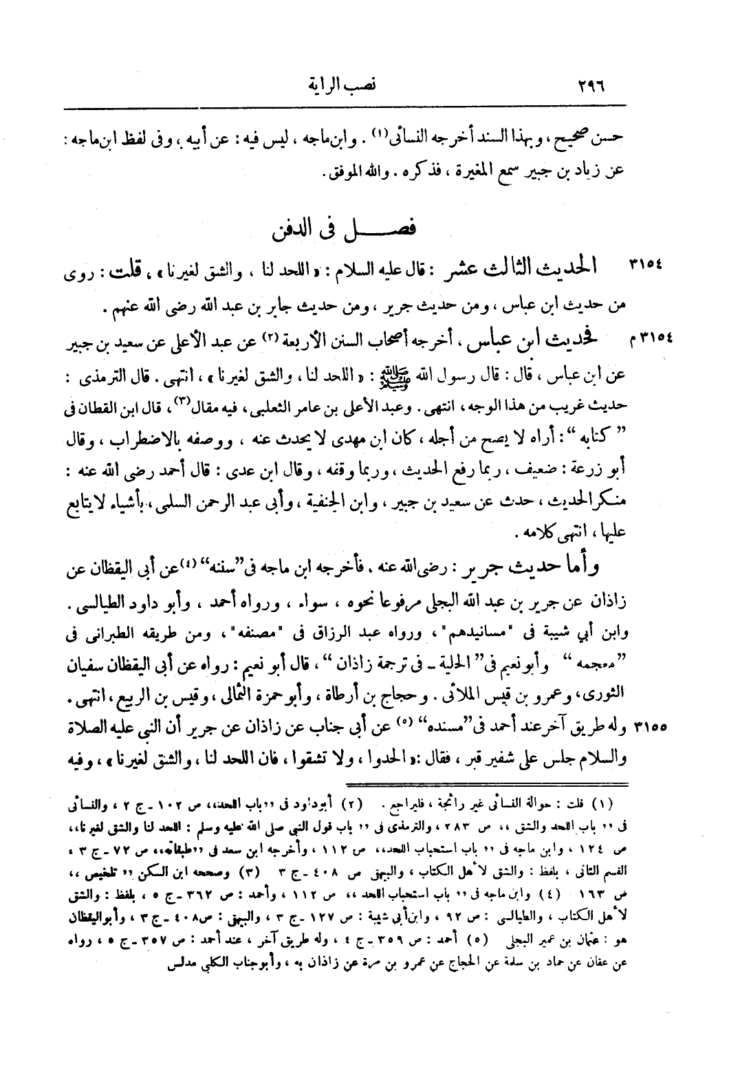 وَأَمَّا حَدِيثُ جَرِيرٍ: رضي الله عنه، فَأَخْرَجَهُ ابْنُ مَاجَهْ فِي "سُنَنِهِ"4 عَنْ أَبِي الْيَقْظَانِ عَنْ زَاذَانَ عَنْ جَرِيرِ بْنِ عَبْدِ اللَّهِ الْبَجَلِيِّ مَرْفُوعًا نَحْوَهُ، سَوَاءً، وَرَوَاهُ أَحْمَدُ، وَأَبُو دَاوُد الطَّيَالِسِيُّ. وَابْنُ أَبِي شَيْبَةَ فِي "مَسَانِيدِهِمْ"، وَرَوَاهُ عَنْ عَبْدِ الرَّزَّاقِ فِي "مُصَنَّفِهِ"، وَمِنْ طَرِيقِهِ الطَّبَرَانِيُّ فِي "مُعْجَمِهِ". وَأَبُو نُعَيْمٍ فِي "الْحِلْيَةِ فِي تَرْجَمَةِ زَاذَانَ"، قَالَ أَبُو نُعَيْمٍ: رَوَاهُ عَنْ أَبِي الْيَقْظَانِ سُفْيَانُ النوري، وَعَمْرُو بْنُ قَيْسٍ الْمُلَائِيُّ. وَحَجَّاجُ بْنُ أَرْطَاةَ، وَأَبُو حَمْزَةَ الثُّمَالِيُّ، وَقَيْسُ بْنُ الرَّبِيعِ، انْتَهَى. وَلَهُ طَرِيقٌ آخَرُ عِنْدَ أَحْمَدَ فِي "مُسْنَدِهِ"5 عَنْ أَبِي جَنَابٍ عَنْ زَاذَانَ عَنْ جَرِيرٍ أَنَّ النَّبِيَّ عليه الصلاة والسلام جَلَسَ عَلَى شَفِيرِ قَبْرٍ، فَقَالَ: "أَلْحِدُوا، وَلَا تَشُقُّوا، فَإِنَّ اللَّحْدَ لَنَا، وَالشَّقَّ لِغَيْرِنَا"، وَفِيهِ