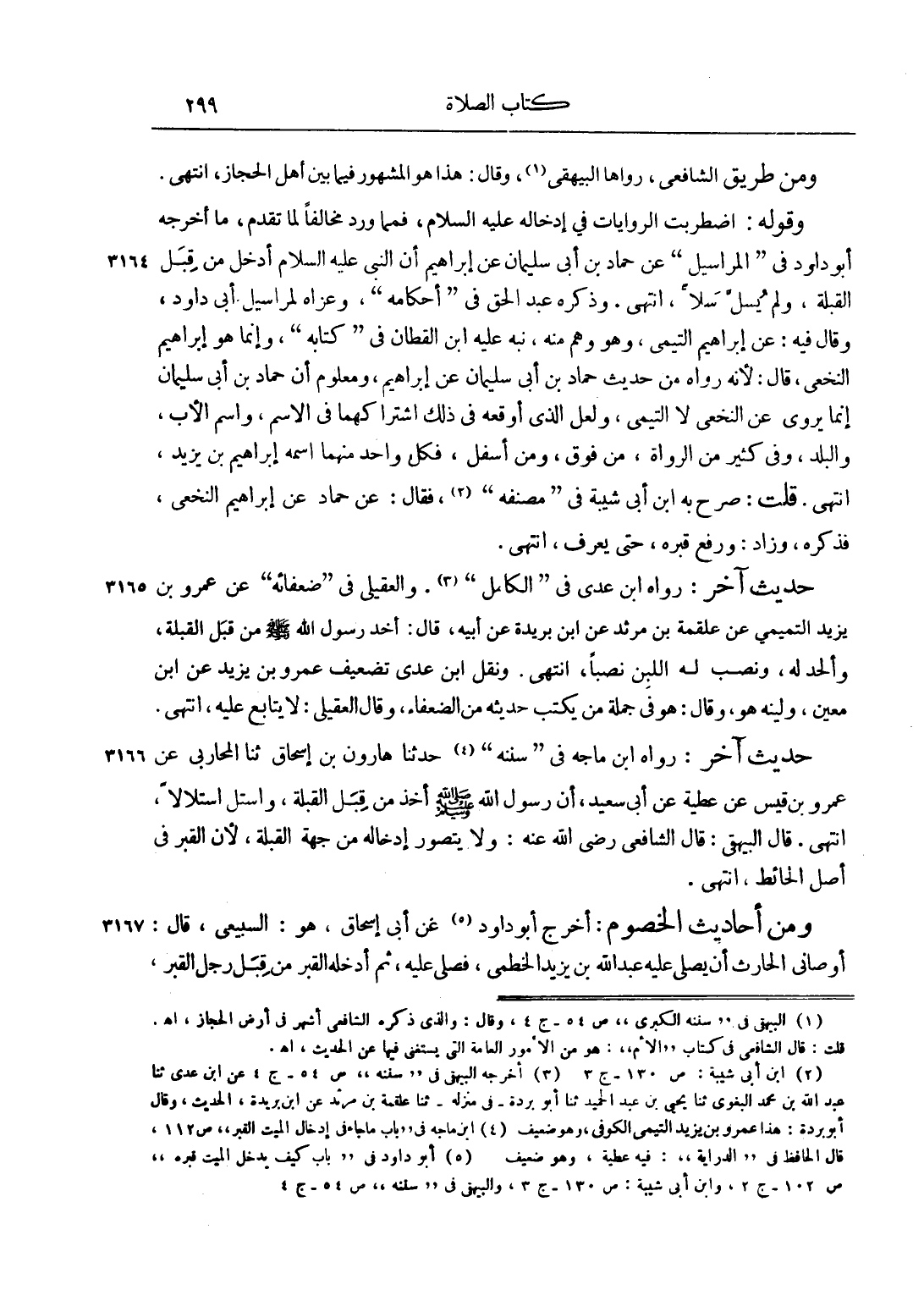 وَمِنْ طريق الشافعي، رواه الْبَيْهَقِيُّ1، وَقَالَ: هَذَا هُوَ الْمَشْهُورُ فِيمَا بَيْنَ أَهْلِ الْحِجَازِ، انْتَهَى. وَقَوْلُهُ: اضْطَرَبَتْ الرِّوَايَاتُ فِي إدْخَالِهِ عليه السلام، فَمِمَّا وَرَدَ مُخَالِفًا لِمَا تَقَدَّمَ، مَا أَخْرَجَهُ أَبُو دَاوُد فِي "الْمَرَاسِيلِ" عَنْ حَمَّادِ بْنِ أَبِي سُلَيْمَانَ عَنْ إبْرَاهِيمَ أَنَّ النَّبِيَّ عليه السلام أُدْخِلَ مِنْ قِبَلِ الْقِبْلَةِ، وَلَمْ يُسَلَّ سَلًّا، انْتَهَى. وَذَكَرَهُ عَبْدُ الْحَقِّ فِي "أَحْكَامِهِ"، وَعَزَاهُ لِمَرَاسِيلِ أَبِي دَاوُد، وَقَالَ فِيهِ: عَنْ إبْرَاهِيمَ التَّيْمِيِّ، وَهُوَ وَهْمٌ مِنْهُ، نَبَّهَ عَلَيْهِ ابْنُ الْقَطَّانِ فِي "كِتَابِهِ"، وَإِنَّمَا هُوَ إبْرَاهِيمُ النَّخَعِيّ، قَالَ: لِأَنَّهُ رَوَاهُ مِنْ حَدِيثِ حَمَّادِ بْنِ أَبِي سُلَيْمَانَ عَنْ إبْرَاهِيمَ، وَمَعْلُومٌ أَنَّ حَمَّادَ بْنَ أَبِي سُلَيْمَانَ إنَّمَا يَرْوِي عَنْ النَّخَعِيّ لَا التَّيْمِيِّ، وَلَعَلَّ الَّذِي أَوْقَعَهُ فِي ذَلِكَ اشْتِرَاكُهُمَا فِي الِاسْمِ، وَاسْمِ الْأَبِ، وَالْبَلَدِ، وَفِي كَثِيرٍ مِنْ الرُّوَاةِ، مِنْ فَوْقٍ، وَمِنْ أَسْفَلَ، فَكُلُّ وَاحِدٍ مِنْهُمَا اسْمُهُ إبْرَاهِيمُ بْنُ يَزِيدَ، انْتَهَى. قُلْت: صَرَّحَ بِهِ ابْنُ أَبِي شَيْبَةَ فِي "مُصَنَّفِهِ"2، فَقَالَ: عَنْ حَمَّادٍ عَنْ إبْرَاهِيمَ النَّخَعِيّ، فَذَكَرَهُ، وَزَادَ: وَرُفِعَ قَبْرُهُ، حَتَّى يُعْرَفَ، انْتَهَى.