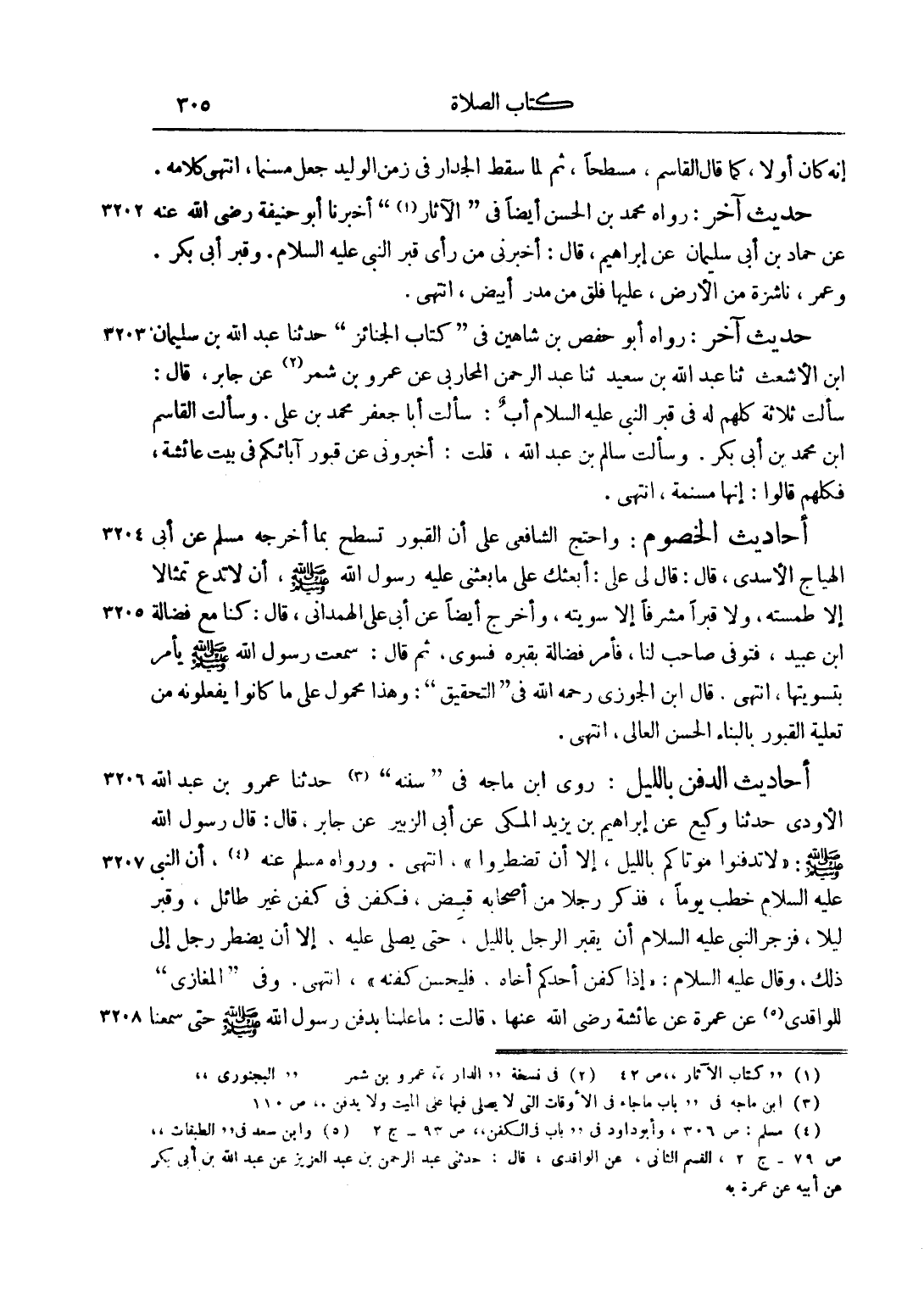 حَدِيثٌ آخَرُ: رَوَاهُ مُحَمَّدُ بْنُ الْحَسَنِ أَيْضًا فِي "الْآثَارِ1" أَخْبَرَنَا أَبُو حَنِيفَةَ رضي الله عنه عَنْ حَمَّادِ بْنِ أَبِي سُلَيْمَانَ عَنْ إبْرَاهِيمَ، قَالَ: أَخْبَرَنِي مَنْ رَأَى قَبْرَ النَّبِيِّ عليه السلام. وَقَبْرَ أَبِي بَكْرٍ. وَعُمَرَ، نَاشِزَةً مِنْ الْأَرْضِ، عَلَيْهَا فَلْقٌ مِنْ مَدَرٍ أَبْيَضَ، انْتَهَى.