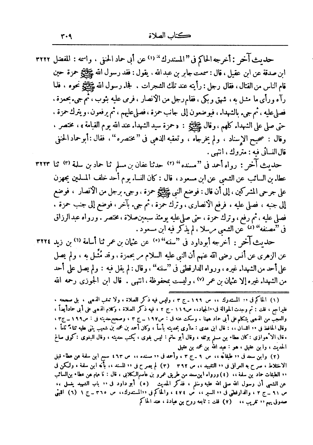 حَدِيثٌ آخَرُ: رَوَاهُ أَحْمَدُ فِي "مُسْنَدِهِ"2 حَدَّثَنَا عَفَّانَ بْنُ مُسْلِمٍ ثَنَا حَمَّادُ بْنُ سَلَمَةَ3 ثَنَا عَطَاءُ بْنُ السَّائِبِ عَنْ الشَّعْبِيِّ عَنْ ابْنِ مَسْعُودٍ، قَالَ: كَانَ النِّسَاءُ يَوْمَ أُحُدٍ خَلْفَ الْمُسْلِمِينَ يُجْهِزْنَ عَلَى جَرْحَى الْمُشْرِكِينَ، إلَى أَنْ قَالَ: فَوَضَعَ النَّبِيُّ صَلَّى اللَّهُ عَلَيْهِ وَسَلَّمَ حَمْزَةَ، وَجِيءَ بِرَجُلٍ مِنْ الْأَنْصَارِ، فَوُضِعَ إلَى جَنْبِهِ، فَصَلَّى عَلَيْهِ، فَرُفِعَ الْأَنْصَارِيُّ، وَتُرِكَ حَمْزَةُ، ثُمَّ جِيءَ بِآخَرَ، فَوُضِعَ إلَى جَنْبِ حَمْزَةَ، فَصَلَّى عَلَيْهِ، ثُمَّ رُفِعَ، وَتُرِكَ حَمْزَةُ، حَتَّى صَلَّى عَلَيْهِ يَوْمَئِذٍ سَبْعِينَ صَلَاةً، مُخْتَصَرٌ. وَرَوَاهُ عَبْدُ الرَّزَّاقِ فِي "مُصَنَّفِهِ"4 عَنْ الشَّعْبِيِّ مُرْسَلًا، لَمْ يَذْكُرْ فِيهِ ابْنَ مَسْعُودٍ.