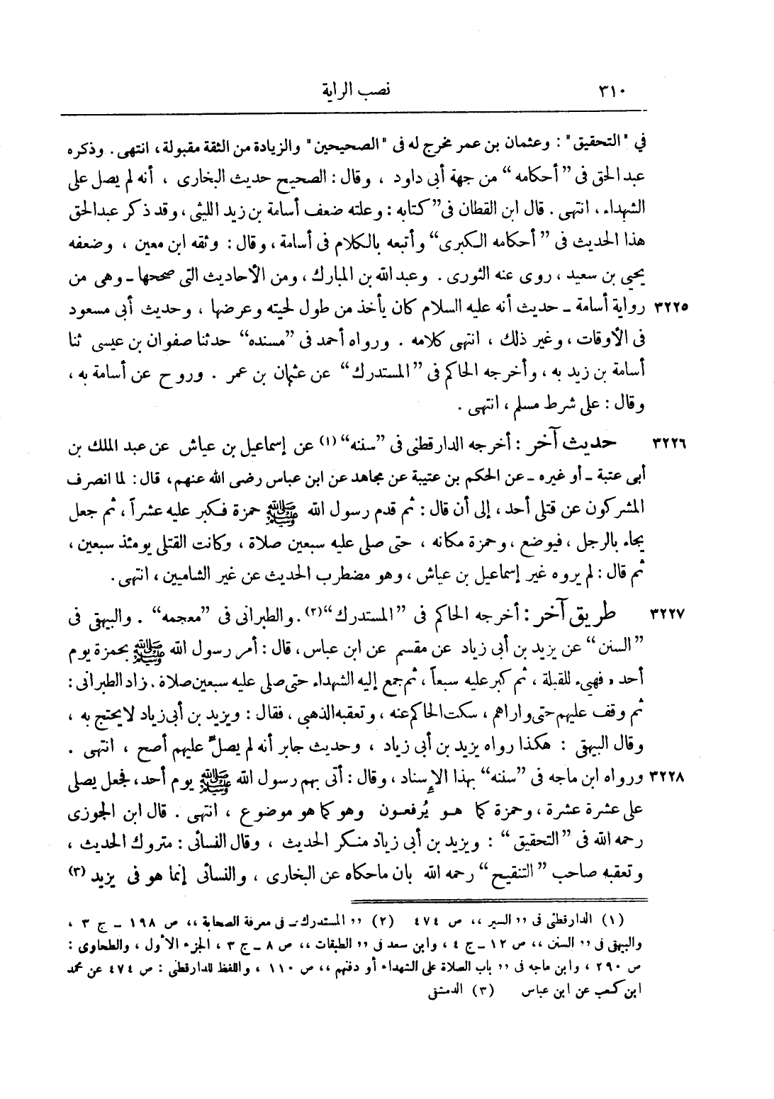 فِي "التَّحْقِيقِ": وَعُثْمَانُ بْنُ عُمَرَ مُخَرَّجٌ لَهُ فِي "الصَّحِيحَيْنِ" وَزِيَادَةٌ مِنْ الثِّقَةِ مَقْبُولَةٌ، انْتَهَى. وَذَكَرَهُ عَبْدُ الْحَقِّ فِي "أَحْكَامِهِ" من جهة أبو دَاوُد، وَقَالَ: الصَّحِيحُ حَدِيثُ الْبُخَارِيِّ، أَنَّهُ لَمْ يُصَلِّ عَلَى الشُّهَدَاءِ، انْتَهَى. قَالَ ابْنُ الْقَطَّانِ فِي "كِتَابِهِ: وَعِلَّتُهُ ضَعْفُ أُسَامَةَ بْنِ زَيْدٍ اللَّيْثِيِّ، وَقَدْ ذَكَرَ عَبْدُ الْحَقِّ هَذَا الْحَدِيثَ فِي "أَحْكَامِهِ الْكُبْرَى" وَأَتْبَعَهُ بِالْكَلَامِ فِي أُسَامَةَ، وَقَالَ: وَثَّقَهُ ابْنُ مَعِينٍ، وَضَعَّفَهُ يَحْيَى بْنُ سَعِيدٍ، رَوَى عَنْهُ الثَّوْرِيُّ. وَعَبْدُ اللَّهِ بْنُ الْمُبَارَكِ، وَمِنْ الْأَحَادِيثِ الَّتِي صَحَّحَهَا وَهِيَ مِنْ رِوَايَةِ أُسَامَةَ حَدِيثُ أَنَّهُ عليه السلام كَانَ يَأْخُذُ مِنْ طُولِ لِحْيَتِهِ وَعَرْضِهَا، وَحَدِيثُ أَبِي مَسْعُودٍ فِي الْأَوْقَاتِ، وَغَيْرُ ذَلِكَ، انْتَهَى كَلَامُهُ. وَرَوَاهُ أَحْمَدُ فِي "مُسْنَدِهِ" حَدَّثَنَا صَفْوَانُ بْنُ عِيسَى ثَنَا أُسَامَةُ بْنُ زَيْدٍ بِهِ، وَأَخْرَجَهُ الْحَاكِمُ فِي "الْمُسْتَدْرَكِ" عَنْ عُثْمَانَ بْنِ عُمَرَ. وَرَوْحٍ عَنْ أُسَامَةَ بِهِ، وَقَالَ: عَلَى شَرْطِ مُسْلِمٍ، انْتَهَى.