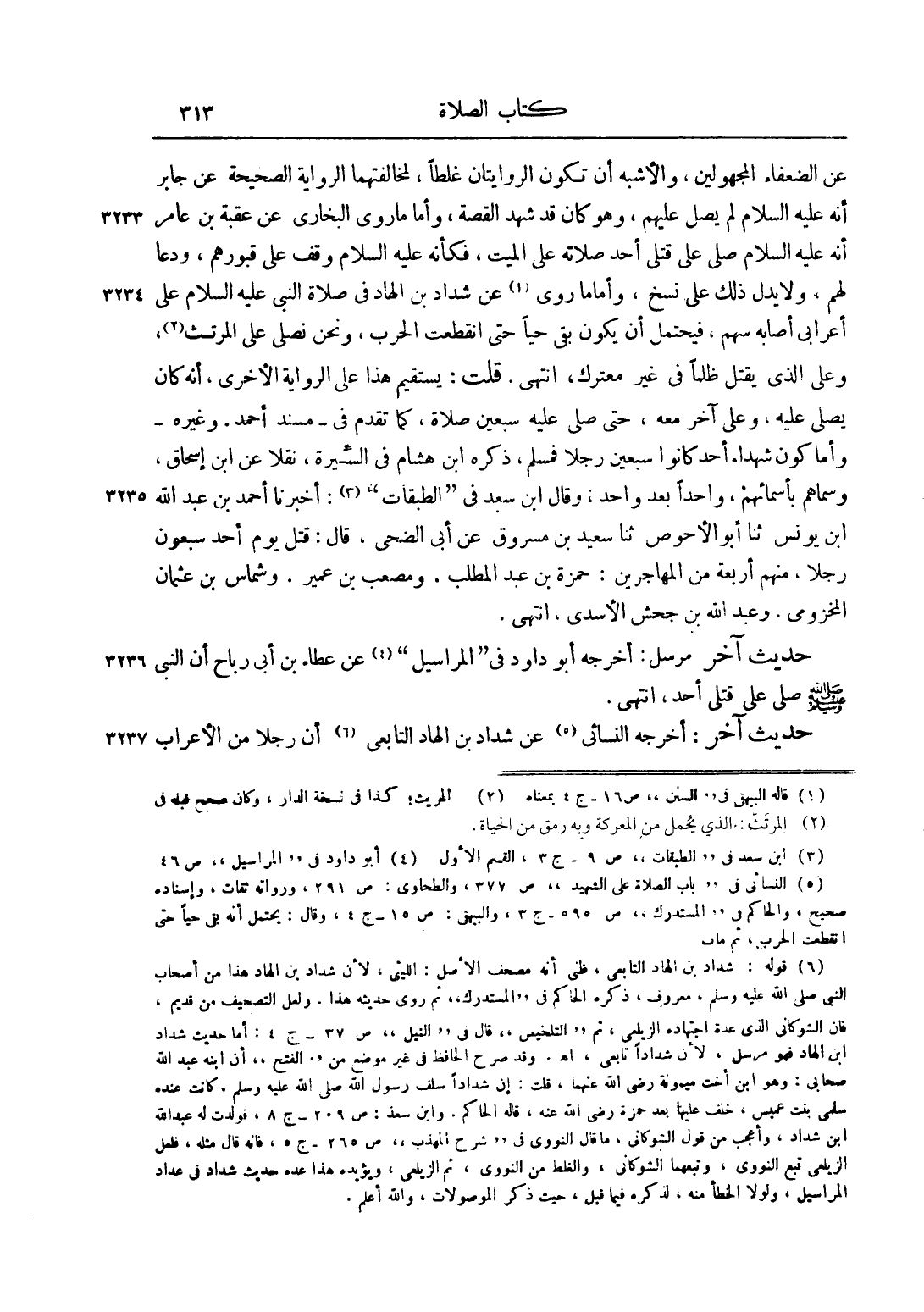 عَنْ الضُّعَفَاءِ الْمَجْهُولِينَ، وَالْأَشْبَهُ أَنْ تَكُونَ الرِّوَايَتَانِ غَلَطًا، لِمُخَالَفَتِهِمَا الرِّوَايَةَ الصَّحِيحَةَ عَنْ جَابِرٍ أَنَّهُ عليه السلام لَمْ يُصَلِّ عَلَيْهِمْ، وَهُوَ كَانَ قَدْ شَهِدَ الْقِصَّةَ، وَأَمَّا مَا رَوَى الْبُخَارِيُّ عَنْ عُقْبَةَ بْنِ عَامِرٍ أَنَّهُ عليه السلام صَلَّى عَلَى قَتْلَى أُحُدٍ صَلَاتَهُ عَلَى الْمَيِّتِ، فَكَأَنَّهُ عليه السلام وَقَفَ عَلَى قُبُورِهِمْ، وَدَعَا لَهُمْ، وَلَا يَدُلُّ ذَلِكَ عَلَى نَسْخٍ، وَأَمَّا مَا رُوِيَ1 عَنْ شَدَّادِ بْنِ الْهَادِ فِي صَلَاةِ النَّبِيِّ عليه السلام عَلَى أَعْرَابِيٍّ أَصَابَهُ سَهْمٌ، فَيُحْتَمَلُ أَنْ يَكُونَ بَقِيَ حَيًّا حَتَّى انْقَطَعَتْ الْحَرْبُ، وَنَحْنُ نُصَلِّي عَلَى الْمُرَيَّثِ2، وَعَلَى الَّذِي يُقْتَلُ ظُلْمًا فِي غَيْرِ مَعْرَكٍ، انْتَهَى. قُلْت: يَسْتَقِيمُ هَذَا عَلَى الرِّوَايَةِ الْأُخْرَى، أَنَّهُ كَانَ يُصَلِّي عَلَيْهِ، وَعَلَى آخَرَ مَعَهُ، حَتَّى صَلَّى عَلَيْهِ سَبْعِينَ صَلَاةً، كَمَا تَقَدَّمَ فِي مُسْنَدِ أَحْمَدَ. وَغَيْرِهِ وَأَمَّا كَوْنُ شُهَدَاءِ أُحُدٍ كَانُوا سَبْعِينَ رَجُلًا فَمُسَلَّمٌ، ذَكَرَهُ ابْنُ هِشَامٍ فِي السِّيرَةِ، نَقْلًا عَنْ ابْنِ إسْحَاقَ، وَسَمَّاهُمْ بِأَسْمَائِهِمْ، وَاحِدًا بَعْدَ وَاحِدٍ، وَقَالَ ابْنُ سَعْدٍ فِي "الطَّبَقَاتِ"3: أَخْبَرَنَا أَحْمَدُ بْنُ عَبْدِ اللَّهِ بْنِ يُونُسَ ثَنَا أَبُو الْأَحْوَصِ ثَنَا سَعِيدُ بْنُ مَسْرُوقٍ عَنْ أَبِي الضُّحَى، قَالَ: قُتِلَ يَوْمَ أُحُدٍ سَبْعُونَ رَجُلًا، مِنْهُمْ أَرْبَعَةٌ مِنْ الْمُهَاجِرِينَ: حَمْزَةُ بْنُ عَبْدِ الْمُطَّلِبِ. وَمُصْعَبُ بْنُ عُمَيْرٍ. وَشِمَاسُ بْنُ عُثْمَانَ الْمَخْزُومِيُّ. وَعَبْدُ اللَّهِ بْنُ جَحْشٍ الْأَسَدِيُّ، انْتَهَى.