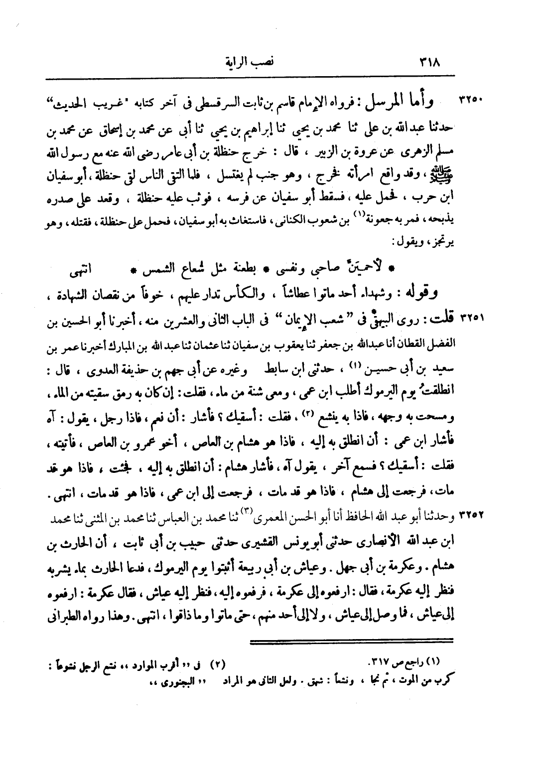 وَقَوْلُهُ: وَشُهَدَاءُ أُحُدٍ مَاتُوا عِطَاشًا، وَالْكَأْسُ تُدَارُ عَلَيْهِمْ، خَوْفًا مِنْ نُقْصَانِ الشَّهَادَةِ، قُلْت: رَوَى الْبَيْهَقِيُّ فِي "شُعَبِ الْإِيمَانِ" فِي الْبَابِ الثَّانِي وَالْعِشْرِينَ مِنْهُ، أَخْبَرَنَا أَبُو الْحَسَنِ بْنُ الْفَضْلِ الْقَطَّانُ أَنَا عَبْدُ اللَّهِ بْنُ جَعْفَرٍ ثَنَا يَعْقُوبُ بْنُ سُفْيَانَ ثَنَا عُثْمَانُ ثَنَا عَبْدُ اللَّهِ بْنُ الْمُبَارَكِ ثَنَا عُمَرُ بْنُ سَعِيدِ بْنِ أَبِي حَسَنَيْنِ1، حَدَّثَنِي ابْنُ سَابِطٍ. وَغَيْرُهُ عَنْ أَبِي جَهْمِ بْنِ حُذَيْفَةَ الْعَدَوِيِّ، قَالَ: انْطَلَقْتُ يَوْمَ الْيَرْمُوكِ أَطْلُبُ ابْنَ عَمِّي، وَمَعِي شَنَّةٌ مِنْ مَاءٍ، فَقُلْت: إنْ كَانَ بِهِ رَمَقٌ سَقَيْته مِنْ الْمَاءِ، وَمَسَحْت بِهِ وَجْهَهُ، فَإِذَا بِهِ يَنْشَعُ2، فَقُلْت: أَسْقِيك؟ فَأَشَارَ: أَنْ نَعَمْ، فَإِذَا رَجُلٌ، يَقُولُ: آهْ فَأَشَارَ ابْنُ عَمِّي: أَنْ انْطَلِقْ بِهِ إلَيْهِ، فَإِذَا هُوَ هِشَامُ بْنُ الْعَاصِ، أَخُو عَمْرِو بْنِ الْعَاصِ، فَأَتَيْته، فَقُلْت: أَسْقِيك؟ فَسَمِعَ آخَرَ، يَقُولُ آهْ، فَأَشَارَ هِشَامٌ: أَنْ انْطَلِقْ بِهِ إلَيْهِ، فَجِئْت، فَإِذَا هُوَ قَدْ مَاتَ، فَرَجَعْت إلَى هِشَامٍ، فَإِذَا هُوَ قَدْ مَاتَ، فَرَجَعْت إلَى ابْنِ عَمِّي، فَإِذَا هُوَ قَدْ مَاتَ، انْتَهَى. وَحَدَّثَنَا أَبُو عَبْدِ اللَّهِ الْحَافِظُ أَنَا أَبُو الْحَسَنِ الْعُمَرِيُّ3 ثَنَا مُحَمَّدُ بْنُ الْعَبَّاسِ ثَنَا مُحَمَّدُ بْنُ الْمُثَنَّى ثَنَا مُحَمَّدُ بْنُ عَبْدِ اللَّهِ الْأَنْصَارِيُّ حَدَّثَنِي أَبُو يُونُسَ الْقُشَيْرِيُّ حَدَّثَنِي حَبِيبُ بْنُ أَبِي ثَابِتٍ، أَنَّ الْحَارِثَ بْنَ هِشَامٍ. وَعِكْرِمَةَ بْنَ أَبِي جَهْلٍ. وَعَيَّاشَ بْنَ أَبِي رَبِيعَةَ أُثْبِتُوا يَوْمَ الْيَرْمُوكِ، فَدَعَا الْحَارِثُ بِمَاءٍ يشربه فنظر إليه عِكْرِمَةَ، فَقَالَ: ارْفَعُوهُ إلَى عِكْرِمَةَ، فَرَفَعُوهُ إلَيْهِ، فَنَظَرَ إلَيْهِ عَيَّاشٌ، فَقَالَ عِكْرِمَةُ: ارْفَعُوهُ إلَى عَيَّاشٍ، فَمَا وَصَلَ إلَى عَيَّاشٍ، وَلَا إلَى أَحَدٍ مِنْهُمْ، حَتَّى مَاتُوا وَمَا ذَاقُوا، انْتَهَى. وَهَذَا رَوَاهُ الطَّبَرَانِيُّ