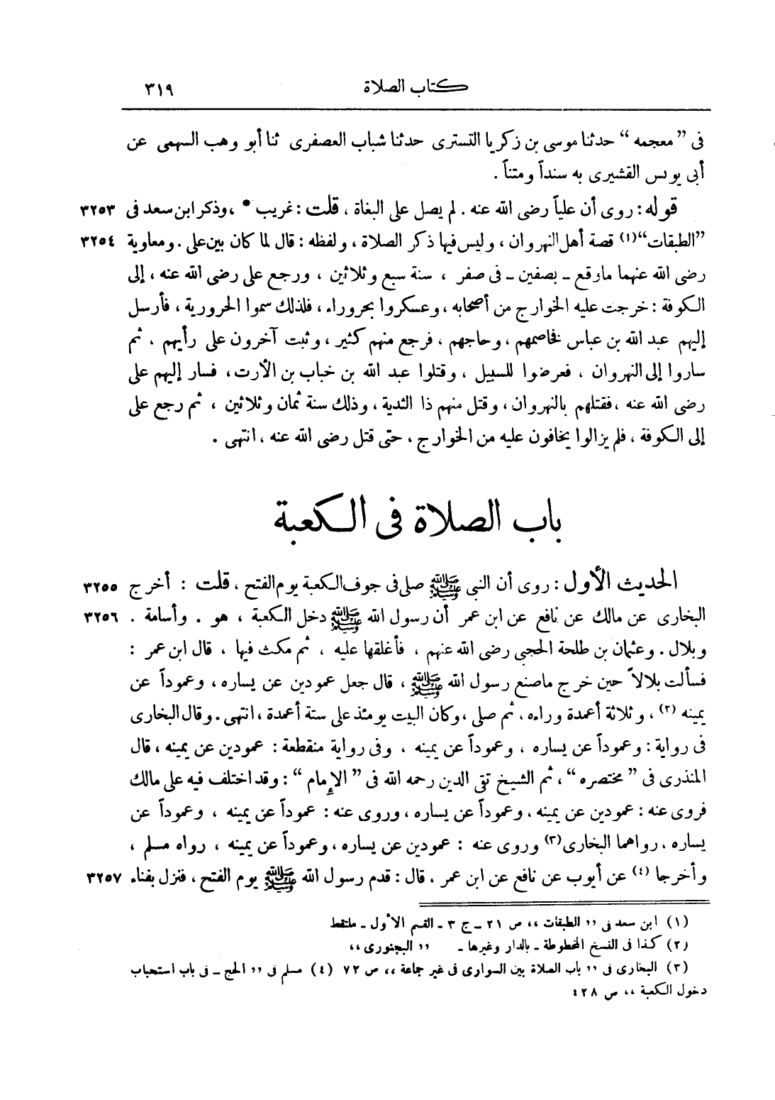 الْحَدِيثُ الْأَوَّلُ: رُوِيَ أَنَّ النَّبِيَّ صَلَّى اللَّهُ عَلَيْهِ وَسَلَّمَ صَلَّى فِي جَوْفِ الْكَعْبَةِ يَوْمَ الْفَتْحِ، قُلْت: أَخْرَجَ الْبُخَارِيُّ عَنْ مَالِكٍ عَنْ نَافِعٍ عَنْ ابْنِ عُمَرَ أَنَّ رَسُولَ اللَّهِ صَلَّى اللَّهُ عَلَيْهِ وَسَلَّمَ دَخَلَ الْكَعْبَةَ، هُوَ. وَأُسَامَةُ. وَبِلَالٌ. وَعُثْمَانُ بْنُ طَلْحَةَ الْحَجَبِيُّ رضي الله عنهم، فَأَغْلَقَهَا عَلَيْهِ، ثُمَّ مَكَثَ فِيهَا، قَالَ ابْنُ عُمَرَ: فَسَأَلْتُ بِلَالًا حِينَ خَرَجَ مَا صَنَعَ رَسُولُ اللَّهِ صَلَّى اللَّهُ عَلَيْهِ وَسَلَّمَ، قَالَ جَعَلَ عَمُودَيْنِ عَنْ يَسَارِهِ، وَعَمُودًا عَنْ يَمِينِهِ2، وَثَلَاثَةَ أَعْمِدَةٍ وَرَاءَهُ، ثُمَّ صَلَّى، وَكَانَ الْبَيْتُ يَوْمَئِذٍ عَلَى سِتَّةِ أَعْمِدَةٍ، انْتَهَى. وَقَالَ الْبُخَارِيُّ فِي رِوَايَةٍ: وَعَمُودًا عَنْ يَسَارِهِ، وَعَمُودًا عَنْ يَمِينِهِ، وَفِي رِوَايَةٍ مُنْقَطِعَةٍ: عَمُودَيْنِ عَنْ يَمِينِهِ، قَالَ الْمُنْذِرِيُّ فِي "مُخْتَصَرِهِ"، ثُمَّ الشَّيْخُ تَقِيُّ الدِّينِ رحمه الله فِي "الْإِمَامِ": وَقَدْ اُخْتُلِفَ فِيهِ عَلَى مَالِكٍ فَرُوِيَ عَنْهُ: عَمُودَيْنِ عَنْ يَمِينِهِ، وَعَمُودًا عَنْ يَسَارِهِ، وَرُوِيَ عَنْهُ: عَمُودًا عَنْ يَمِينِهِ، وَعَمُودًا عَنْ يَسَارِهِ، رَوَاهُمَا الْبُخَارِيُّ3 وَرُوِيَ عَنْهُ: عَمُودَيْنِ عَنْ يَسَارِهِ، وَعَمُودًا عَنْ يَمِينِهِ، رَوَاهُ مُسْلِمٌ، وَأَخْرَجَا4 عَنْ أَيُّوبَ عَنْ نَافِعٍ عَنْ ابْنِ عُمَرَ، قَالَ: قَدِمَ رَسُولُ اللَّهِ صَلَّى اللَّهُ عَلَيْهِ وَسَلَّمَ يَوْمَ الْفَتْحِ، فَنَزَلَ بِفِنَاءِ