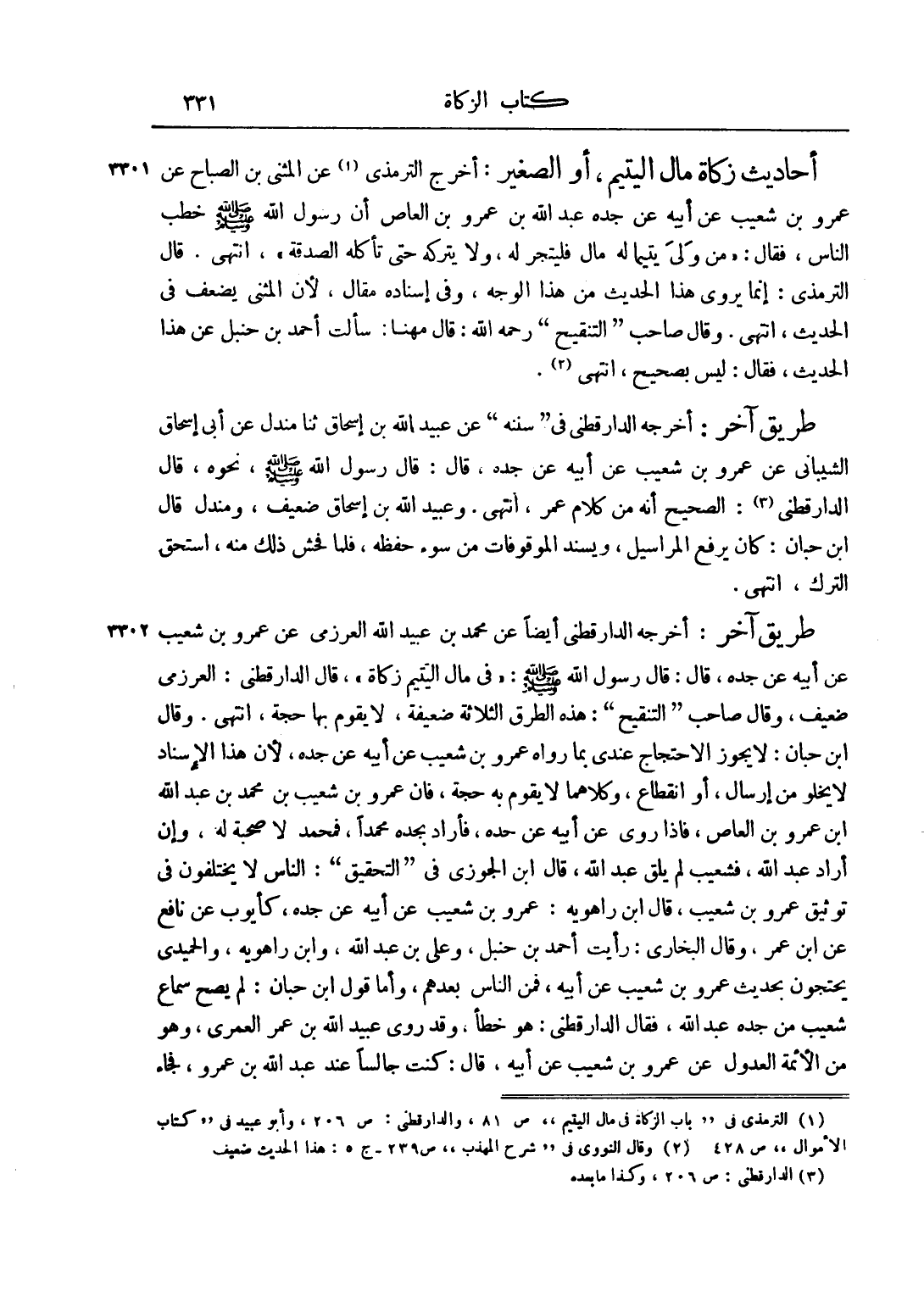 طَرِيقٌ آخَرُ: أَخْرَجَهُ الدَّارَقُطْنِيُّ أَيْضًا عَنْ مُحَمَّدِ بْنِ عُبَيْدِ اللَّهِ الْعَرْزَمِيِّ عَنْ عَمْرِو بْنِ شُعَيْبٍ عَنْ أَبِيهِ عَنْ جَدِّهِ، قَالَ: قَالَ رَسُولُ اللَّهِ صَلَّى اللَّهُ عَلَيْهِ وَسَلَّمَ: "فِي مَالِ الْيَتِيمِ زَكَاةٌ"، قَالَ الدَّارَقُطْنِيُّ: الْعَرْزَمِيُّ ضَعِيفٌ، وَقَالَ صَاحِبُ "التَّنْقِيحِ": هَذِهِ الطُّرُقُ الثَّلَاثَةُ ضَعِيفَةٌ، لَا يَقُومُ بِهَا حُجَّةٌ، انْتَهَى. وَقَالَ ابْنُ حِبَّانَ: لَا يَجُوزُ الِاحْتِجَاجُ عِنْدِي بِمَا رَوَاهُ عَمْرُو بْنُ شُعَيْبٍ عَنْ أَبِيهِ عَنْ جَدِّهِ، لِأَنَّ هَذَا الْإِسْنَادَ لَا يَخْلُو مِنْ إرْسَالٍ، أَوْ انْقِطَاعٍ، وَكِلَاهُمَا لَا يَقُومُ بِهِ حُجَّةٌ، فَإِنَّ عَمْرَو بْنَ شُعَيْبِ بْنِ مُحَمَّدِ بْنِ عَبْدِ اللَّهِ بْنِ عَمْرِو بْنِ الْعَاصِ، فَإِذَا رَوَى عَنْ أَبِيهِ عَنْ جَدِّهِ، فَأَرَادَ بِجَدِّهِ مُحَمَّدًا، فَمُحَمَّدٌ لَا صُحْبَةَ لَهُ، وَإِنْ أَرَادَ عَبْدَ اللَّهِ، فَشُعَيْبٌ لَمْ يَلْقَ عَبْدَ اللَّهِ، قَالَ ابْنُ الْجَوْزِيِّ فِي "التَّحْقِيقِ": النَّاسُ لَا يَخْتَلِفُونَ فِي تَوْثِيقِ عَمْرِو بْنِ شُعَيْبٍ، قَالَ ابْنُ رَاهْوَيْهِ: عَمْرُو بْنُ شُعَيْبٍ عَنْ أَبِيهِ عَنْ جَدِّهِ، كَأَيُّوبَ عَنْ نَافِعٍ عَنْ ابْنِ عُمَرَ، وَقَالَ الْبُخَارِيُّ: رَأَيْت أَحْمَدَ بْنَ حَنْبَلٍ، وَعَلِيَّ بْنَ عَبْدِ اللَّهِ، وَابْنَ رَاهْوَيْهِ، وَالْحُمَيْدِيَّ يَحْتَجُّونَ بِحَدِيثِ عَمْرِو بْنِ شُعَيْبٍ عَنْ أَبِيهِ، فَمَنْ النَّاسُ بَعْدَهُمْ، وَأَمَّا قَوْلُ ابْنِ حِبَّانَ: لَمْ يَصِحَّ سَمَاعُ شُعَيْبٍ مِنْ جَدِّهِ عَبْدِ اللَّهِ، فَقَالَ الدَّارَقُطْنِيُّ: هُوَ خَطَأٌ، وَقَدْ رَوَى عُبَيْدُ اللَّهِ بْنُ عُمَرَ الْعُمَرِيُّ، وَهُوَ مِنْ الْأَئِمَّةِ الْعُدُولِ عَنْ عَمْرِو بْنِ شُعَيْبٍ عَنْ أَبِيهِ، قَالَ: كُنْت جَالِسًا عِنْدَ عَبْدِ اللَّهِ بْنِ عَمْرٍو، فَجَاءَ