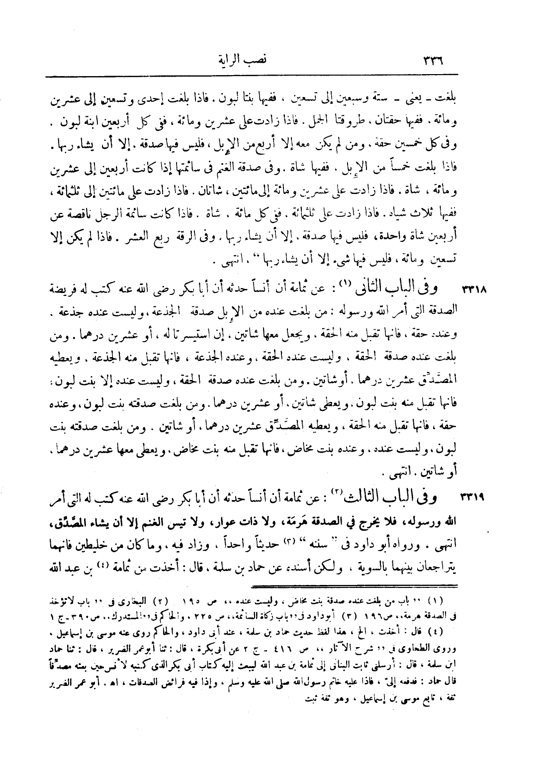 وَفِي الْبَابِ الثَّانِي 1: عَنْ ثُمَامَةَ أَنَّ أَنَسًا حَدَّثَهُ أَنَّ أَبَا بَكْرٍ رضي الله عنه كَتَبَ لَهُ فَرِيضَةَ الصَّدَقَةِ الَّتِي أَمَرَ اللَّهُ وَرَسُولُهُ: مَنْ بَلَغَتْ عِنْدَهُ مِنْ الْإِبِلِ صَدَقَةُ الْجَذَعَةِ، وَلَيْسَتْ عِنْدَهُ جَذَعَةٌ، وَعِنْدَهُ حِقَّةٌ، فَإِنَّهَا تُقْبَلُ مِنْهُ الْحِقَّةُ، وَيَجْعَلُ مَعَهَا شَاتَيْنِ، إنْ تيسرتا لَهُ، أَوْ عِشْرِينَ دِرْهَمًا، ومن بلغت عنده الْحِقَّةِ، وَلَيْسَتْ عِنْدَهُ الْحِقَّةُ، وَعِنْدَهُ الْجَذَعَةُ، فَإِنَّهَا تُقْبَلُ مِنْهُ الْجَذَعَةُ، وَيُعْطِيهِ الْمُصَدِّقُ عِشْرِينَ دِرْهَمًا أَوْ شَاتَيْنِ. وَمَنْ بَلَغَتْ عِنْدَهُ صَدَقَةُ الْحِقَّةِ، وَلَيْسَتْ عِنْدَهُ إلَّا بِنْتُ لَبُونِ، فَإِنَّهَا تُقْبَلُ مِنْهُ بِنْتُ لَبُونٍ، وَيُعْطِي شَاتَيْنِ، أَوْ عِشْرِينَ دِرْهَمًا. وَمَنْ بَلَغَتْ صَدَقَتُهُ بِنْتَ لَبُونٍ، وَعِنْدَهُ حِقَّةٌ، فَإِنَّهَا تُقْبَلُ مِنْهُ الْحِقَّةُ، وَيُعْطِيهِ الْمُصَدِّقُ عِشْرِينَ دِرْهَمًا، أَوْ شَاتَيْنِ. وَمَنْ بَلَغَتْ صَدَقَتُهُ بِنْتَ لَبُونٍ، وَلَيْسَتْ عِنْدَهُ، وَعِنْدَهُ بِنْتُ مَخَاضٍ، فَإِنَّهَا تُقْبَلُ مِنْهُ بِنْتُ مَخَاضٍ، وَيُعْطِي مَعَهَا عِشْرِينَ دِرْهَمًا، أَوْ شَاتَيْنِ، انْتَهَى.