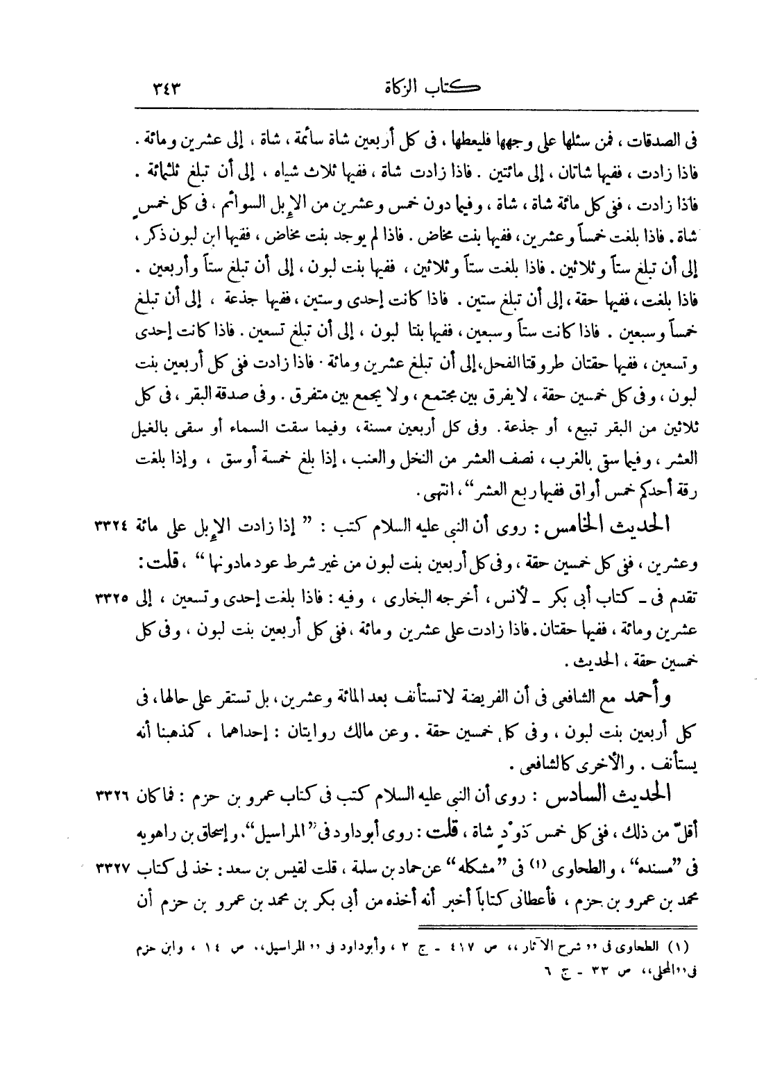 الْحَدِيثُ الْخَامِسُ: رُوِيَ أَنَّ النَّبِيَّ عليه السلام كَتَبَ: "إذَا زَادَتْ الْإِبِلُ عَلَى مِائَةٍ وَعِشْرِينَ، فَفِي كُلِّ خَمْسِينَ حِقَّةٌ، وَفِي كُلِّ أَرْبَعِينَ بِنْتُ لَبُونٍ مِنْ غَيْرِ شَرْطِ عَوْدِ مَا دُونَهَا"، قُلْت: تَقَدَّمَ فِي كِتَابِ أَبِي بَكْرٍ لِأَنَسٍ، أَخْرَجَهُ الْبُخَارِيُّ، وَفِيهِ: فَإِذَا بَلَغَتْ إحْدَى وَتِسْعِينَ، إلَى عِشْرِينَ وَمِائَةٍ، فَفِيهَا حِقَّتَانِ. فَإِذَا زَادَتْ عَلَى عِشْرِينَ وَمِائَةٍ، فَفِي كُلِّ أَرْبَعِينَ بِنْتُ لَبُونٍ، وَفِي كُلِّ خَمْسِينَ حِقَّةٌ، الْحَدِيثَ.