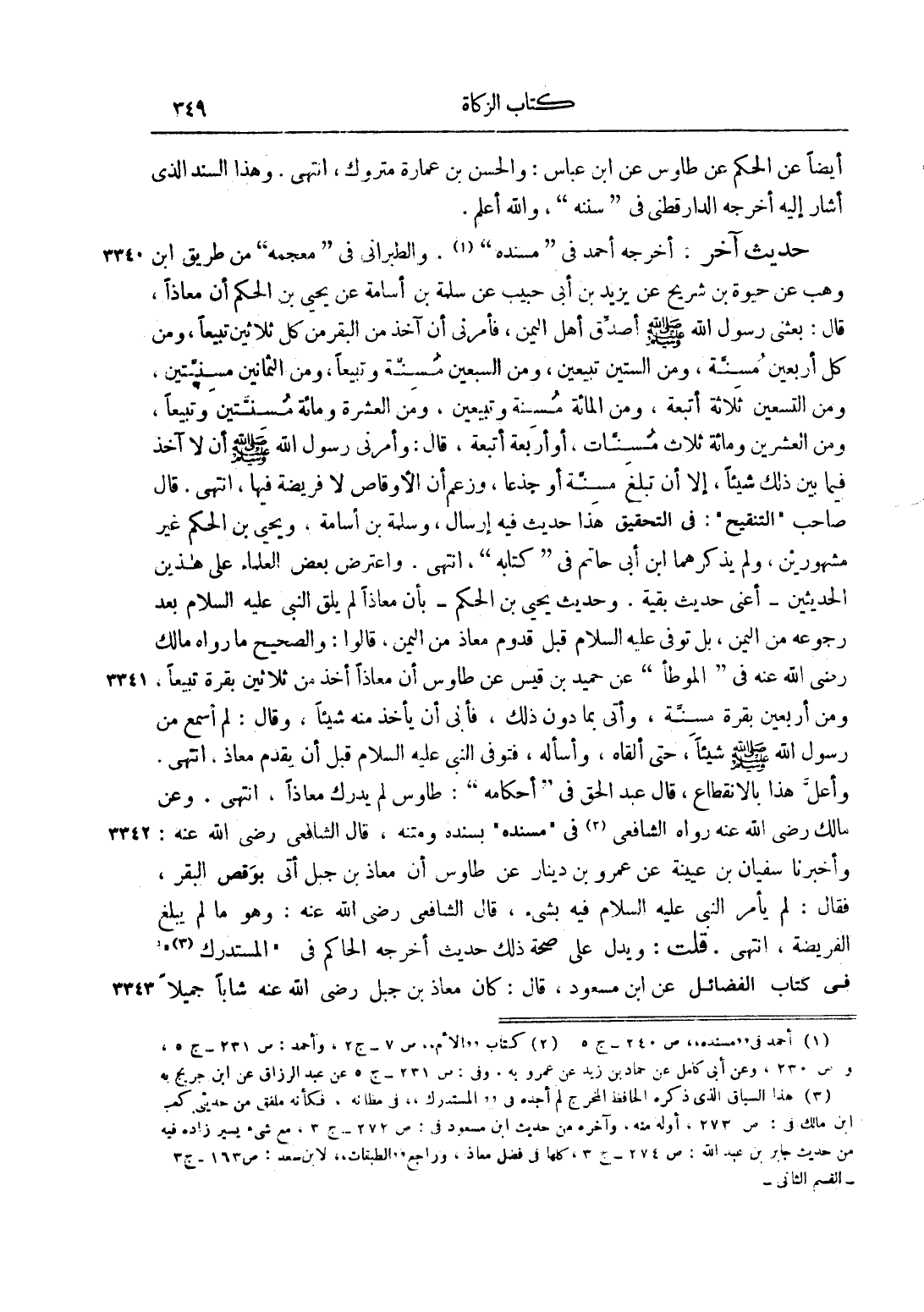 حَدِيثٌ آخَرُ: أَخْرَجَهُ أَحْمَدُ فِي "مُسْنَدِهِ"1. وَالطَّبَرَانِيُّ فِي "مُعْجَمِهِ" مِنْ طَرِيقِ ابْنِ وَهْبٍ عَنْ حَيْوَةَ بْنِ شُرَيْحٍ عَنْ يزيد بْنِ أَبِي حَبِيبٍ عَنْ سَلَمَةَ بْنِ أُسَامَةَ عَنْ يَحْيَى بْنِ الْحَكَمِ أَنَّ مُعَاذًا، قَالَ بَعَثَنِي رَسُولُ اللَّهِ صَلَّى اللَّهُ عَلَيْهِ وَسَلَّمَ أُصَدِّقُ أَهْلَ الْيَمَنِ، فَأَمَرَنِي أَنْ آخُذَ مِنْ البقرمن كُلِّ ثَلَاثِينَ تَبِيعًا، وَمِنْ كُلِّ أَرْبَعِينَ مُسِنَّةً، وَمِنْ السِّتِّينَ تَبِيعَيْنِ، وَمِنْ السَّبْعِينَ مُسِنَّةً وَتَبِيعًا، وَمِنْ الثَّمَانِينَ مُسِنَّتَيْنِ، وَمِنْ التِّسْعِينَ ثَلَاثَةَ أَتْبِعَةٍ، وَمِنْ الْمِائَةِ مُسِنَّةً وَتَبِيعَيْنِ، وَمِنْ الْعَشَرَةِ وَمِائَةٍ مُسِنَّتَيْنِ وَتَبِيعًا، وَمِنْ الْعِشْرِينَ وَمِائَةٍ ثَلَاثَ مُسِنَّاتٍ، أَوْ أَرْبَعَةَ أَتْبِعَةٍ، قَالَ: وَأَمَرَنِي رَسُولُ اللَّهِ صَلَّى اللَّهُ عَلَيْهِ وَسَلَّمَ أَنْ لَا آخُذَ فِيمَا بَيْنَ ذَلِكَ شَيْئًا، إلَّا أَنْ تَبْلُغَ مُسِنَّةً أَوْ جَذَعًا، وَزَعَمَ أَنَّ الْأَوْقَاصَ لَا فَرِيضَةَ فِيهَا، انْتَهَى. قَالَ صَاحِبُ "التَّنْقِيحِ فِي التَّحْقِيقِ": هَذَا حَدِيثٌ فِيهِ إرْسَالٌ، وَسَلَمَةُ بْنُ أُسَامَةَ، وَيَحْيَى بْنُ الْحَكَمِ غَيْرُ مَشْهُورَيْنِ، وَلَمْ يَذْكُرْهُمَا ابْنُ أَبِي حَاتِمٍ فِي "كِتَابِهِ"، انْتَهَى. وَاعْتَرَضَ بَعْضُ الْعُلَمَاءِ عَلَى هَذَيْنِ الْحَدِيثَيْنِ أَعَنَى حَدِيثَ بَقِيَّةَ. وَحَدِيثَ يَحْيَى بْنِ الْحَكَمِ بِأَنَّ مُعَاذًا لَمْ يَلْقَ النَّبِيَّ عليه السلام بَعْدَ رُجُوعِهِ مِنْ الْيَمَنِ، بَلْ تُوُفِّيَ عليه السلام قَبْلَ قُدُومِ مُعَاذٍ مِنْ الْيَمَنِ، قَالُوا: وَالصَّحِيحُ مَا رَوَاهُ مَالِكٌ رضي الله عنه فِي "الْمُوَطَّأِ" عَنْ حُمَيْدٍ بْنِ قَيْسٍ عَنْ طَاوُسٍ أَنَّ مُعَاذًا أَخَذَ مِنْ ثَلَاثِينَ بَقَرَةً تَبِيعًا، وَمِنْ أَرْبَعِينَ بَقَرَةً مُسِنَّةً، وَأُتِيَ بِمَا دُونَ ذَلِكَ، فَأَبَى أَنْ يَأْخُذَ مِنْهُ شَيْئًا، وَقَالَ: لَمْ أَسْمَعْ مِنْ رَسُولِ اللَّهِ صَلَّى اللَّهُ عَلَيْهِ وَسَلَّمَ شَيْئًا، حَتَّى أَلْقَاهُ، وَأَسْأَلَهُ، فَتُوُفِّيَ النَّبِيُّ عليه السلام قَبْلَ أَنْ يَقْدَمَ مُعَاذٌ، انْتَهَى. وَأُعِلَّ هَذَا بِالِانْقِطَاعِ، قَالَ عَبْدُ الْحَقِّ فِي "أَحْكَامِهِ": طَاوُسٌ لَمْ يُدْرِكْ مُعَاذًا، انْتَهَى. وَعَنْ مَالِكٍ رضي الله عنه رَوَاهُ الشَّافِعِيُّ2 فِي "سننه" بسنده وَمَتْنُهُ، قَالَ الشَّافِعِيُّ رضي الله عنه: وَأَخْبَرَنَا سُفْيَانُ بْنُ عُيَيْنَةَ عَنْ عَمْرِو بْنِ دِينَارٍ عَنْ طَاوُسٍ أَنَّ مُعَاذَ بْنَ جَبَلٍ أُتِيَ بِوَقْصِ الْبَقَرِ، فَقَالَ: لَمْ يَأْمُرْ النَّبِيُّ عليه السلام فِيهِ بِشَيْءٍ، قَالَ الشَّافِعِيُّ رضي الله عنه: وَهُوَ مَا لَمْ يَبْلُغْ الْفَرِيضَةَ، انْتَهَى. قُلْت: وَيَدُلُّ عَلَى صِحَّةِ ذَلِكَ حَدِيثٌ أَخْرَجَهُ الْحَاكِمُ فِي "الْمُسْتَدْرَكِ3 فِي كِتَابِ الْفَضَائِلِ" عَنْ ابْنِ مَسْعُودٍ، قَالَ: كَانَ مُعَاذُ بْنُ جَبَلٍ رضي الله عنه شَابًّا جَمِيلًا