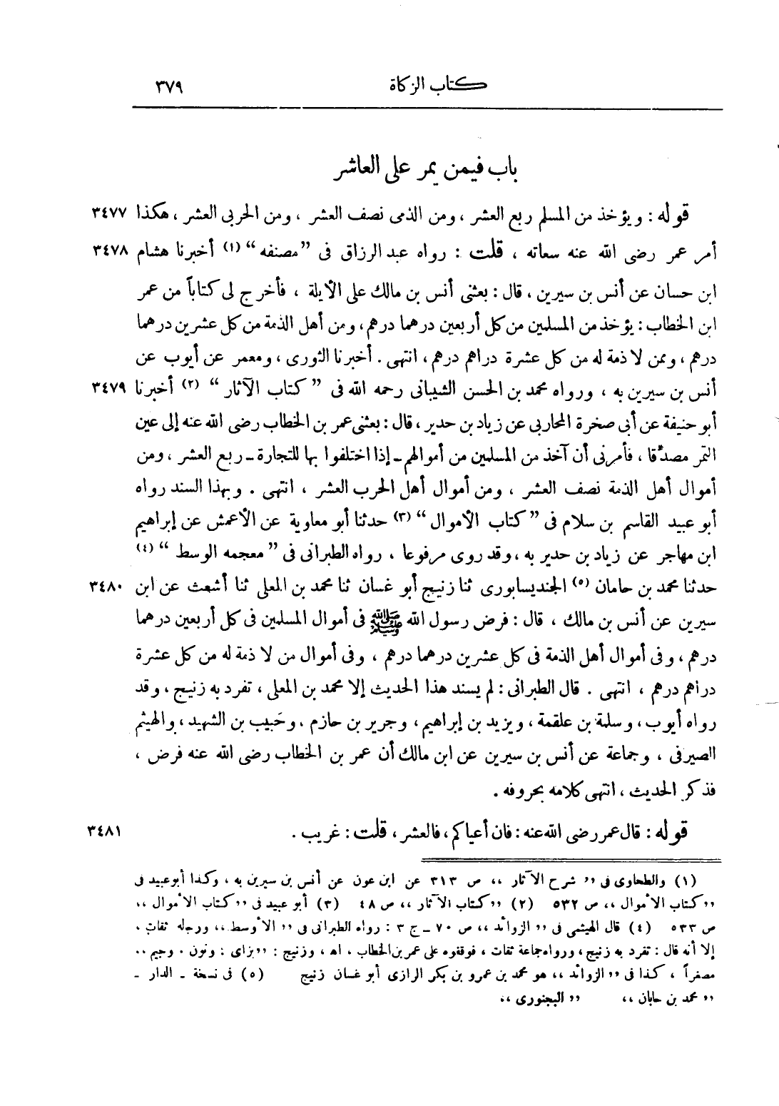 قَوْلُهُ: وَيُؤْخَذُ مِنْ الْمُسْلِمِ رُبْعُ الْعُشْرِ، وَمِنْ الذِّمِّيِّ نِصْفُ الْعُشْرِ، وَمِنْ الْحَرْبِيِّ، هَكَذَا أَمَرَ عُمَرُ رضي الله عنه سُعَاتَهُ، قُلْت: رَوَاهُ عَبْدُ الرَّزَّاقِ فِي "مُصَنَّفِهِ"1 أَخْبَرَنَا هِشَامُ بْنُ حَسَّانَ عَنْ أَنَسِ بْنِ سِيرِينَ، قَالَ: بَعَثَنِي أَنَسُ بْنُ مَالِكٍ عَلَى الْأَيْلَةِ، فَأَخْرَجَ لِي كِتَابًا مِنْ عُمَرَ بْنِ الْخَطَّابِ: يُؤْخَذُ مِنْ الْمُسْلِمِينَ مِنْ كُلِّ أَرْبَعِينَ دِرْهَمًا دِرْهَمٌ، وَمِنْ أَهْلِ الذِّمَّةِ مِنْ كُلِّ عِشْرِينَ دِرْهَمًا دِرْهَمٌ، وَمِمَّنْ لَا ذِمَّةَ لَهُ مِنْ كُلِّ عَشَرَةِ دَرَاهِمَ دِرْهَمٌ، انْتَهَى. أَخْبَرَنَا الثَّوْرِيُّ، وَمَعْمَرٌ عَنْ أَيُّوبَ عَنْ أَنَسِ بْنِ سِيرِينَ بِهِ، وَرَوَاهُ مُحَمَّدُ بْنُ الْحَسَنِ الشَّيْبَانِيُّ رحمه الله فِي "كِتَابِ الْآثَارِ"2 أَخْبَرَنَا أَبُو حَنِيفَةَ عَنْ أَبِي صَخْرَةَ الْمُحَارِبِيِّ عَنْ زِيَادِ بْنِ حُدَيْرٍ، قَالَ: بَعَثَنِي عُمَرُ بْنُ الْخَطَّابِ رضي الله عنه إلَى عَيْنِ التَّمْرِ مُصَدِّقًا، فَأَمَرَنِي أَنْ آخُذَ مِنْ الْمُسْلِمِينَ مِنْ أَمْوَالِهِمْ إذَا اخْتَلَفُوا بِهَا لِلتِّجَارَةِ رُبْعَ الْعُشْرِ، وَمِنْ أَمْوَالِ أَهْلِ الذِّمَّةِ نِصْفَ الْعُشْرِ، وَمِنْ أَمْوَالِ أَهْلِ الْحَرْبِ الْعُشْرَ، انْتَهَى. وَبِهَذَا السَّنَدِ رَوَاهُ أَبُو عُبَيْدٍ الْقَاسِمُ بْنُ سَلَّامٍ فِي "كِتَابِ الْأَمْوَالِ"3 حَدَّثَنَا أَبُو مُعَاوِيَةَ عَنْ الْأَعْمَشِ عَنْ إبْرَاهِيمَ بْنِ مُهَاجِرٍ عَنْ زِيَادِ بْنِ حُدَيْرٍ بِهِ، وَقَدْ رُوِيَ مَرْفُوعًا، رَوَاهُ الطَّبَرَانِيُّ فِي "معجمه الوسط"4 حَدَّثَنَا مُحَمَّدُ بْنُ حَامَانَ5 الجند يسابوري ثَنَا زُنَيْجٌ أَبُو غَسَّانَ ثَنَا مُحَمَّدُ بْنُ الْمُعَلَّى ثَنَا أَشْعَثُ عَنْ ابْنِ سِيرِينَ عَنْ أَنَسِ بْنِ مَالِكٍ، قَالَ: فَرَضَ رَسُولُ اللَّهِ صَلَّى اللَّهُ عَلَيْهِ وَسَلَّمَ فِي أَمْوَالِ الْمُسْلِمِينَ فِي كُلِّ أَرْبَعِينَ دِرْهَمًا دِرْهَمٌ، وَفِي أَمْوَالِ أَهْلِ الذِّمَّةِ فِي كُلِّ عِشْرِينَ دِرْهَمًا دِرْهَمٌ , وَفِي أَمْوَالِ مَنْ لَا ذِمَّةَ لَهُ مِنْ كُلِّ عَشَرَةِ دَرَاهِمَ دِرْهَمٌ} . انْتَهَى. قَالَ الطَّبَرَانِيُّ: لَمْ يُسْنِدْ هَذَا الْحَدِيثَ إلَّا مُحَمَّدُ بْنُ الْمُعَلَّى، تَفَرَّدَ بِهِ زُنَيْجٌ، وَقَدْ رَوَاهُ أَيُّوبُ، وَسَلَمَةُ بْنُ عَلْقَمَةَ، وَيَزِيدُ بْنُ إبْرَاهِيمَ، وَجَرِيرُ بْنُ حَازِمٍ، وَخُبَيْبُ بْنُ الشَّهِيدِ، وَالْهَيْثَمُ الصَّيْرَفِيُّ، وَجَمَاعَةٌ عَنْ أَنَسِ بْنِ سِيرِينَ عَنْ ابْنِ مَالِكٍ أَنَّ عُمَرَ بْنَ الْخَطَّابِ رضي الله عنه فَرَضَ، فَذَكَرَ الْحَدِيثَ، انْتَهَى كَلَامُهُ بِحُرُوفِهِ.
