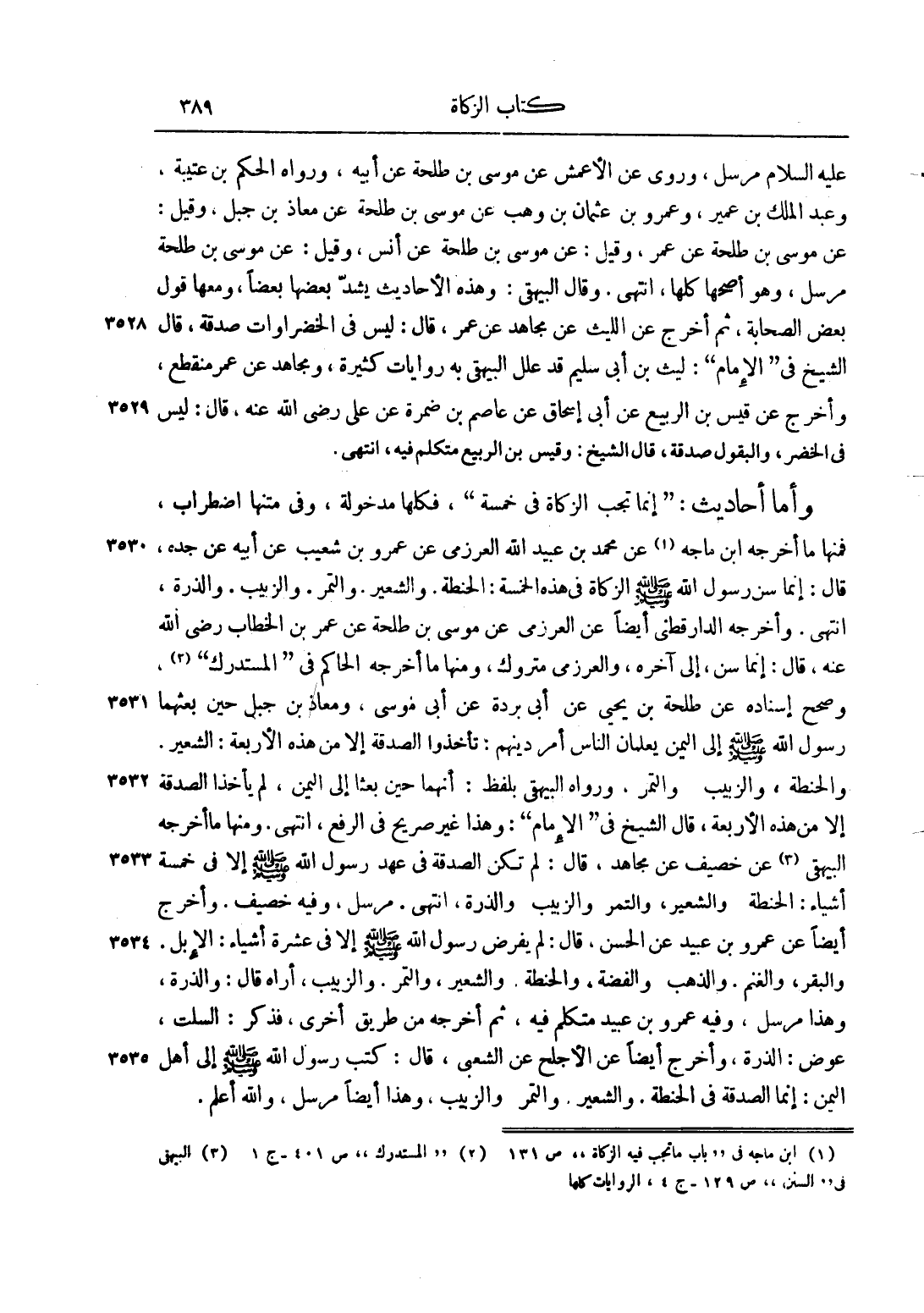 عليه السلام مُرْسَلٌ، وَرُوِيَ عَنْ الْأَعْمَشِ عَنْ مُوسَى بْنِ طَلْحَةَ عَنْ أَبِيهِ، وَرَوَاهُ الْحَكَمُ بْنُ عُتَيْبَةَ، وَعَبْدِ الْمَلِكِ بْنِ عُمَيْرٍ، وَعَمْرِو بْنِ عُثْمَانَ بْنِ وَهْبٍ عَنْ مُوسَى بْنِ طَلْحَةَ عَنْ مُعَاذِ بْنِ جَبَلٍ، وَقِيلَ: عَنْ مُوسَى بْنَ طَلْحَةَ عَنْ عُمَرَ، وَقِيلَ: عَنْ مُوسَى بْنِ طَلْحَةَ عَنْ أَنَسٍ، وَقِيلَ: عَنْ مُوسَى بْنِ طَلْحَةَ مُرْسَلٌ، وَهُوَ أَصَحُّهَا كُلِّهَا، انْتَهَى. وَقَالَ الْبَيْهَقِيُّ: وَهَذِهِ الْأَحَادِيثُ يَشُدُّ بَعْضُهَا بَعْضًا، وَمَعَهَا قَوْلُ بَعْضِ الصَّحَابَةِ، ثُمَّ أَخْرَجَ عَنْ اللَّيْثِ عَنْ مُجَاهِدٍ عَنْ عُمَرَ، قَالَ: لَيْسَ فِي الْخَضْرَاوَاتِ صَدَقَةٌ، قَالَ الشَّيْخُ فِي "الْإِمَامِ": لَيْثُ بْنُ أَبِي سُلَيْمٍ قَدْ عَلَّلَ الْبَيْهَقِيُّ بِهِ رِوَايَاتٍ كَثِيرَةٍ، وَمُجَاهِدٌ عَنْ عُمَرَ مُنْقَطِعٌ، وَأَخْرَجَ عَنْ قَيْسِ بْنِ الرَّبِيعِ عَنْ أَبِي إسْحَاقِ عَنْ عَاصِمِ بْنِ ضَمْرَةَ عَنْ عَلِيٍّ رضي الله عنه، قَالَ: لَيْسَ فِي الْخَضْرَاوَاتِ، وَالْبُقُولِ صَدَقَةٌ، قَالَ الشَّيْخُ: وَقَيْسُ بْنُ الرَّبِيعِ مُتَكَلَّمٌ فِيهِ، انْتَهَى.