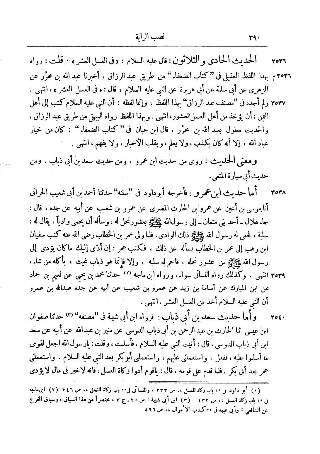 أَمَّا حَدِيثُ ابْنِ عَمْرٍو: فَأَخْرَجَهُ أَبُو دَاوُد1 فِي "سُنَنِهِ" حَدَّثَنَا أَحْمَدُ بْنُ أَبِي شُعَيْبٍ الْحَرَّانِيِّ أَنَا مُوسَى بْنُ أَعْيَنَ عَنْ عَمْرِو بْنِ الْحَارِثِ الْمِصْرِيِّ عَنْ عَمْرِو بْنِ شُعَيْبٍ عَنْ أَبِيهِ عَنْ جَدِّهِ، قَالَ: جَاءَ هِلَالٌ أَحَدُ بَنِي مُتْعَانَ إلَى رَسُولِ اللَّهِ صَلَّى اللَّهُ عَلَيْهِ وَسَلَّمَ بِعُشُورِ نَحْلٍ لَهُ، وَسَأَلَهُ أَنْ يَحْمِيَ وَادِيًا، يُقَالُ لَهُ: سَلَبَةُ، فَحَمَى لَهُ رَسُولُ اللَّهِ صَلَّى اللَّهُ عَلَيْهِ وَسَلَّمَ ذَلِكَ الْوَادِيَ، فَلَمَّا وَلِيَ عُمَرُ بْنُ الْخَطَّابِ رضي الله عنه كَتَبَ سُفْيَانُ بْنُ وَهْبٍ إلَى عُمَرَ بْنِ الْخَطَّابِ يَسْأَلُهُ عَنْ ذَلِكَ، فَكَتَبَ عُمَرُ: إنْ أَدَّى إلَيْك مَا كَانَ يُؤَدِّي إلَى رَسُولِ اللَّهِ صَلَّى اللَّهُ عَلَيْهِ وَسَلَّمَ مِنْ عُشُورِ نَحْلِهِ، فَاحْمِ لَهُ سَلَبَةَ، وَإِلَّا فَإِنَّمَا هُوَ ذُبَابُ غَيْثٍ، يَأْكُلُهُ مَنْ شَاءَ، انْتَهَى. وَكَذَلِكَ رَوَاهُ النَّسَائِيّ سَوَاءً، وَرَوَاهُ ابْنُ مَاجَهْ2 حَدَّثَنَا مُحَمَّدُ بْنُ يَحْيَى عَنْ نُعَيْمِ بْنِ حَمَّادٍ عَنْ ابْنِ الْمُبَارَكِ عَنْ أُسَامَةَ بْنِ زَيْدٍ عَنْ عَمْرِو بْنِ شُعَيْبٍ عَنْ أَبِيهِ عَنْ جَدِّهِ عَنْ عَبْدِ اللَّهِ بْنِ عَمْرٍو أَنَّ النَّبِيَّ عليه السلام أَخَذَ مِنْ الْعَسَلِ الْعُشْرَ، انْتَهَى.