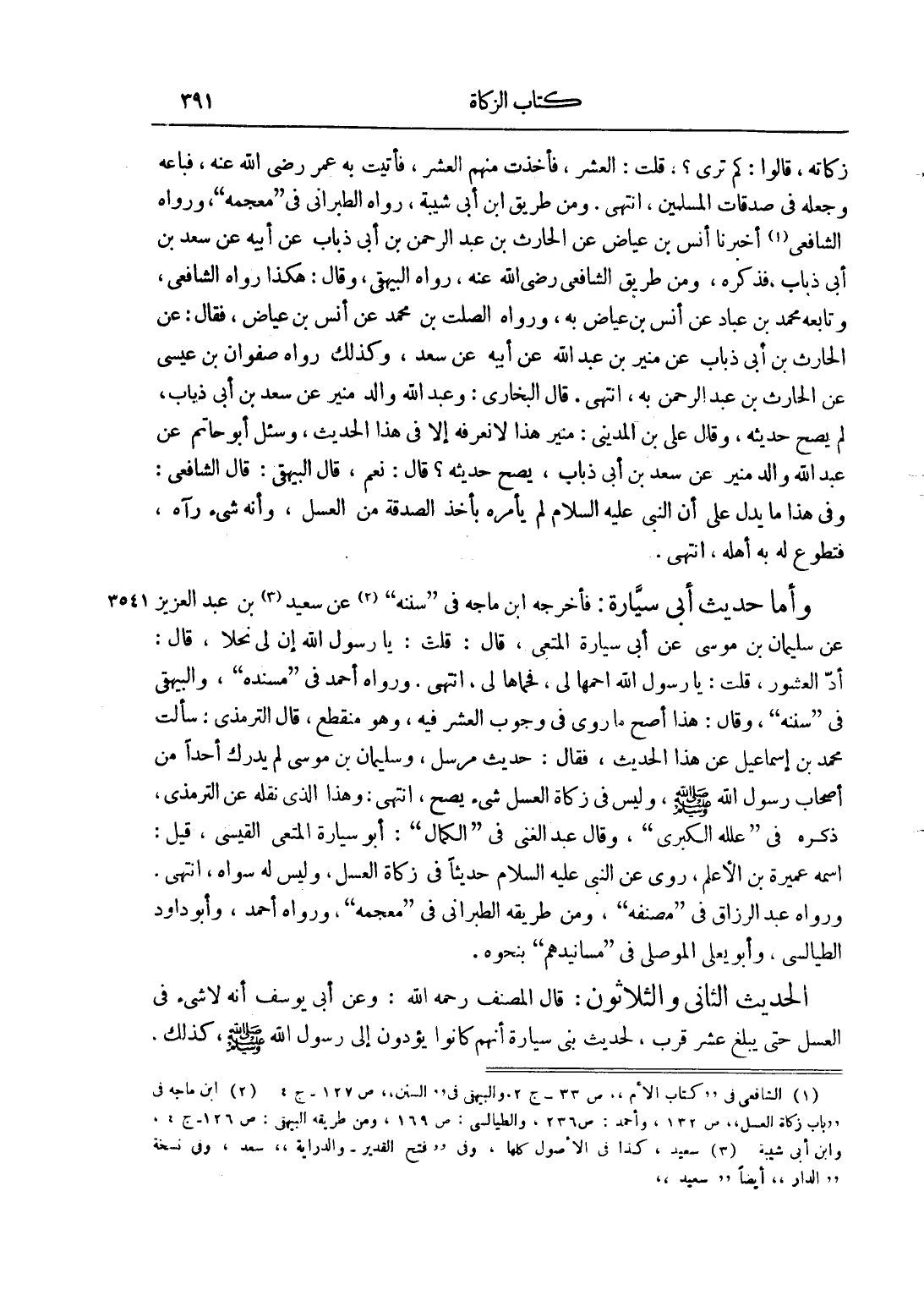 2 ابن ماجه في "باب زكاة العسل" ص 132، وأحمد: ص 236، والطيالسي: ص 169، ومن طريقه البيهقي: ص 126 ج 4، وابن أبي شيبة.