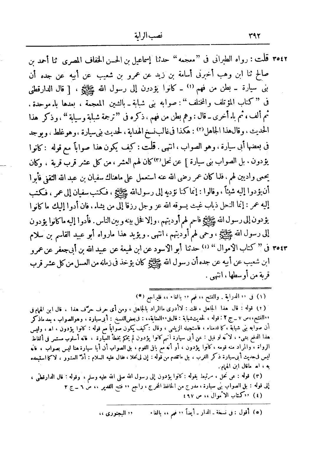 قُلْت: رَوَاهُ الطَّبَرَانِيُّ فِي "مُعْجَمِهِ" حَدَّثَنَا إسْمَاعِيلُ بْنُ الْحَسَنِ الْخَفَّافُ الْمِصْرِيُّ ثَنَا أَحْمَدُ بْنُ صَالِحٍ ثَنَا ابْنُ وَهْبٍ أَخْبَرَنِي أُسَامَةُ بْنُ زَيْدٍ عَنْ عَمْرِو بْنِ شُعَيْبٍ عَنْ أَبِيهِ عَنْ جَدِّهِ أَنَّ بَنِي سَيَّارَةَ بَطْنٌ مِنْ فَهْمٍ1 كَانُوا يُؤَدُّونَ إلَى رَسُولِ اللَّهِ صَلَّى اللَّهُ عَلَيْهِ وَسَلَّمَ، [قَالَ الدَّارَقُطْنِيُّ فِي "كِتَابِ الْمُؤْتَلِفِ وَالْمُخْتَلِفِ": صَوَابُهُ بَنِي شَبَّابَةَ بِالشِّينِ الْمُعْجَمَةِ، بَعْدَهَا بَاءٌ مُوَحَّدَةٌ، ثُمَّ أَلِفٌ، ثُمَّ بَاءٌ أُخْرَى قَالَ: وَهُمْ بَطْنٌ مِنْ فَهْمٍ، ذَكَرَهُ فِي "تَرْجَمَةِ شَبَّابَةَ وَسَيَّابَةَ"، وَذَكَرَ هَذَا الْحَدِيثَ، وَقَالَ هَذَا الْجَاهِلُ2: هَكَذَا فِي غَالِبِ نُسَخِ الْهِدَايَةِ، لِحَدِيثِ بَنِي سَيَّارَةَ، وَهُوَ غَلَطٌ، وَيُوجَدُ فِي بَعْضِهَا أَبِي سَيَّارَةَ، وَهُوَ الصَّوَابُ، انْتَهَى. قُلْت: كَيْفَ يَكُونُ هَذَا صَوَابًا مَعَ قَوْلِهِ: كَانُوا يُؤَدُّونَ، بَلْ الصَّوَابُ بَنِي سَيَّارَةَ] عَنْ نَحْلٍ3 كَانَ لَهُمْ الْعُشْرَ، مِنْ كُلِّ عَشْرِ قِرَبٍ قِرْبَةً، وَكَانَ يَحْمِي وَادِيَيْنِ لَهُمْ، فَلَمَّا كَانَ عُمَرُ رضي الله عنه اسْتَعْمَلَ عَلَى مَا هُنَاكَ سُفْيَانَ بْنَ عَبْدِ اللَّهِ الثَّقَفِيَّ فَأَبَوْا أَنْ يُؤَدُّوا إلَيْهِ شَيْئًا، وَقَالُوا: إنَّمَا كُنَّا نُؤَدِّيهِ إلَى رَسُولِ اللَّهِ صَلَّى اللَّهُ عَلَيْهِ وَسَلَّمَ، فَكَتَبَ سُفْيَانُ إلَى عُمَرَ، فَكَتَبَ إلَيْهِ عُمَرُ: إنَّمَا النَّحْلُ ذُبَابُ غَيْثٍ يَسُوقُهُ اللَّهُ عَزَّ وَجَلَّ رِزْقًا إلَى مَنْ يَشَاءُ، فَإِنْ أَدُّوا إلَيْك مَا كَانُوا يُؤَدُّونَ إلَى رَسُولِ اللَّهِ صَلَّى اللَّهُ عَلَيْهِ وَسَلَّمَ، فَاحْمِ لَهُمْ أَوْدِيَتَهُمْ، وَإِلَّا فَخَلِّ بَيْنَهُ وَبَيْنَ النَّاسِ. فَأَدَّوْا إلَيْهِ مَا كَانُوا يُؤَدُّونَ إلَى رَسُولِ اللَّهِ صَلَّى اللَّهُ عَلَيْهِ وَسَلَّمَ، وَحَمَى لَهُمْ أَوْدِيَتَهُمْ، انْتَهَى. وَيُؤَيِّدُ هَذَا مَا رَوَاهُ أَبُو عُبَيْدٍ الْقَاسِمُ بْنُ سَلَّامٍ فِي "كِتَابِ الْأَمْوَالِ"4 حَدَّثَنَا أَبُو الْأَسْوَدِ عَنْ ابْنِ لَهِيعَةَ عَنْ عُبَيْدِ اللَّهِ بْنِ أَبِي جَعْفَرٍ عَنْ عَمْرِو بْنِ شُعَيْبٍ عَنْ أَبِيهِ عَنْ جَدِّهِ أَنَّ رَسُولَ اللَّهِ صَلَّى اللَّهُ عَلَيْهِ وَسَلَّمَ كَانَ يُؤْخَذُ فِي زَمَانِهِ مِنْ الْعَسَلِ مِنْ كُلِّ عَشْرِ قِرَبٍ قِرْبَةً مِنْ أَوْسَطِهَا، انْتَهَى.