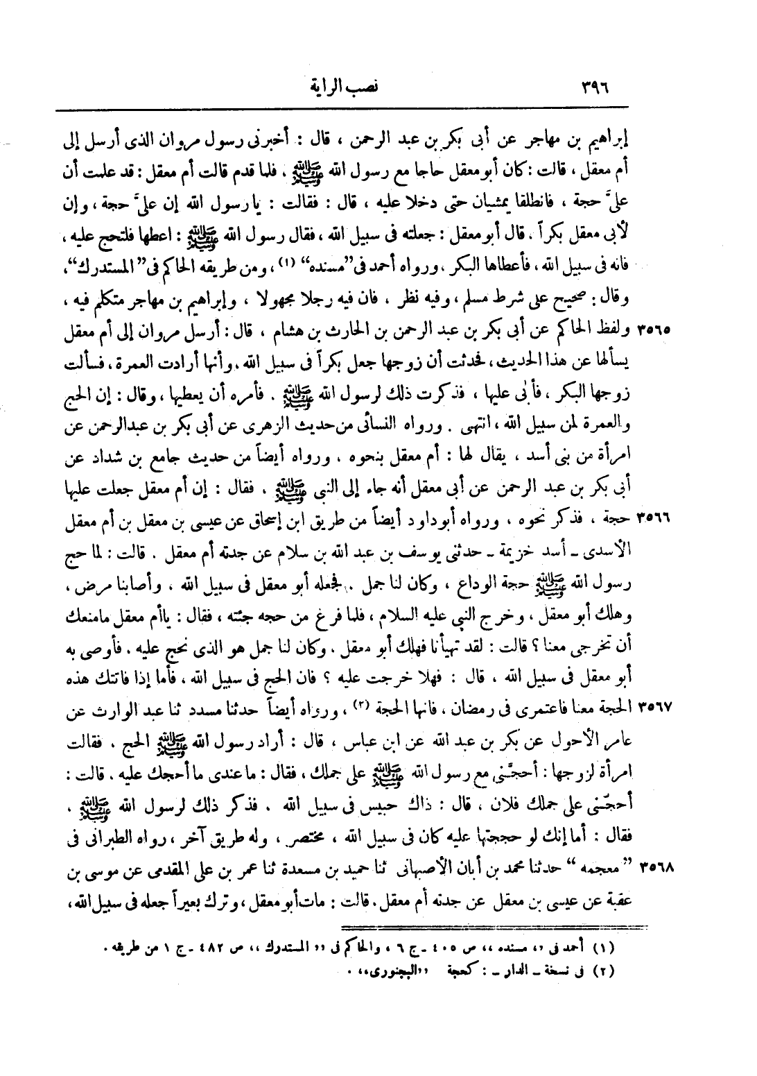 إبْرَاهِيمَ بْنِ مُهَاجِرٍ عَنْ أَبِي بَكْرِ بْنِ عَبْدِ الرَّحْمَنِ، قَالَ: أَخْبَرَنِي رَسُولُ مَرْوَانَ الَّذِي أُرْسِلَ إلَى أُمِّ مَعْقِلٍ، قَالَتْ: كَانَ أَبُو مَعْقِلٍ حَاجًّا مَعَ رَسُولِ اللَّهِ صَلَّى اللَّهُ عَلَيْهِ وَسَلَّمَ، فَلَمَّا قَدِمَ قَالَتْ أُمُّ مَعْقِلٍ: قَدْ عَلِمْت أَنَّ عَلَيَّ حَجَّةً، فَانْطَلَقَا يَمْشِيَانِ حَتَّى دَخَلَا عَلَيْهِ، قَالَ: فَقَالَتْ: يَا رَسُولَ اللَّهِ إنَّ عَلَيَّ حَجَّةً، وَإِنَّ لِأَبِي مَعْقِلٍ بَكْرًا، قَالَ أَبُو مَعْقِلٍ: جَعَلْتُهُ فِي سَبِيلِ اللَّهِ، فَقَالَ رَسُولُ اللَّهِ صَلَّى اللَّهُ عَلَيْهِ وَسَلَّمَ: "أَعْطِهَا فَلْتَحُجَّ عَلَيْهِ، فَإِنَّهُ فِي سَبِيلِ اللَّهِ"، فَأَعْطَاهَا الْبَكْرَ، وَرَوَاهُ أَحْمَدُ فِي "مُسْنَدِهِ"1، وَمِنْ طَرِيقِهِ الْحَاكِمُ فِي "الْمُسْتَدْرَكِ"، وَقَالَ: صَحِيحٌ عَلَى شَرْطِ مُسْلِمٍ، وَفِيهِ نَظَرٌ، فَإِنَّ فِيهِ رَجُلًا مَجْهُولًا، وَإِبْرَاهِيمُ بْنُ مُهَاجِرٍ مُتَكَلَّمٌ فِيهِ، وَلَفْظُ الْحَاكِمِ عَنْ أَبِي بَكْرِ بْنِ عَبْدِ الرَّحْمَنِ بْنِ الْحَارِثِ بْنِ هِشَامٍ، قَالَ: أَرْسَلَ مَرْوَانُ إلَى أُمِّ مَعْقِلٍ يَسْأَلُهَا عَنْ هَذَا الْحَدِيثِ، فَحَدَّثَتْ أَنَّ زَوْجَهَا جَعَلَ بَكْرًا فِي سَبِيلِ اللَّهِ، وَأَنَّهَا أَرَادَتْ الْعُمْرَةَ، فَسَأَلَتْ زَوْجَهَا الْبَكْرَ، فَأَبَى عَلَيْهَا، فَذَكَرَتْ ذَلِكَ لِرَسُولِ اللَّهِ صَلَّى اللَّهُ عَلَيْهِ وَسَلَّمَ، فَأَمَرَهُ أَنْ يُعْطِيَهَا، وَقَالَ: "إنَّ الْحَجَّ وَالْعُمْرَةَ لَمِنْ سَبِيلِ اللَّهِ"، انْتَهَى. وَرَوَاهُ النَّسَائِيّ مِنْ حَدِيثِ الزُّهْرِيِّ عَنْ أَبِي بَكْرِ بْنِ عَبْدِ الرَّحْمَنِ عَنْ امْرَأَةٍ مِنْ بَنِي أَسَدٍ، يُقَالُ لَهَا: أُمُّ مَعْقِلٍ بِنَحْوِهِ، وَرَوَاهُ أَيْضًا مِنْ حَدِيثِ جَامِعِ بْنِ شَدَّادٍ عَنْ أَبِي بَكْرِ بْنِ عَبْدِ الرَّحْمَنِ عَنْ أَبِي مَعْقِلٍ أَنَّهُ جَاءَ إلَى النَّبِيِّ صَلَّى اللَّهُ عَلَيْهِ وَسَلَّمَ، فَقَالَ: إنَّ أُمَّ مَعْقِلٍ جَعَلَتْ عَلَيْهَا حَجَّةً، فَذَكَرَ نَحْوَهُ، وَرَوَاهُ أَبُو دَاوُد أَيْضًا مِنْ طَرِيقِ ابْنِ إسْحَاقَ عَنْ عِيسَى بْنِ مَعْقِلِ بْنِ أُمِّ مَعْقِلٍ الْأَسَدِيِّ أَسَدُ خُزَيْمَةَ حَدَّثَنِي يُوسُفُ بْنُ عَبْدِ اللَّهِ بْنِ سَلَّامٍ عَنْ جَدَّتِهِ أُمِّ مَعْقِلٍ، قَالَتْ: لَمَّا حَجَّ رَسُولُ اللَّهِ صَلَّى اللَّهُ عَلَيْهِ وَسَلَّمَ حَجَّةَ الْوَدَاعِ، وَكَانَ لَنَا جَمَلٌ، فَجَعَلَهُ أَبُو مَعْقِلٍ فِي سَبِيلِ اللَّهِ، وَأَصَابَنَا مَرَضٌ، وَهَلَكَ أَبُو مَعْقِلٍ، وَخَرَجَ النَّبِيُّ عليه السلام، فَلَمَّا فَرَغَ مِنْ حَجِّهِ جِئْتُهُ، فَقَالَ: "يَا أُمَّ مَعْقِلٍ مَا مَنَعَك أَنْ تَخْرُجِي مَعَنَا؟ " قَالَتْ: لَقَدْ تَهَيَّأْنَا فَهَلَكَ أَبُو مَعْقِلٍ، وَكَانَ لَنَا جَمَلٌ هُوَ الَّذِي نَحُجُّ عَلَيْهِ، فَأَوْصَى بِهِ أَبُو مَعْقِلٍ فِي سَبِيلِ اللَّهِ، قَالَ: "فَهَلَّا خَرَجْت عَلَيْهِ؟ فَإِنَّ الْحَجَّ فِي سَبِيلِ اللَّهِ، فَأَمَّا إذَا فَاتَتْك هَذِهِ الْحَجَّةِ مَعَنَا فَاعْتَمِرِي فِي رَمَضَانَ، فَإِنَّهَا الْحَجَّةُ" 2، وَرَوَاهُ أَيْضًا حَدَّثَنَا مُسَدَّدٌ ثَنَا عَبْدُ الْوَارِثِ عَنْ عَامِرٍ الْأَحْوَلِ عَنْ بَكْرِ بْنِ عَبْدِ اللَّهِ عَنْ ابْنِ عَبَّاسٍ، قَالَ: أَرَادَ رَسُولُ اللَّهِ صَلَّى اللَّهُ عَلَيْهِ وَسَلَّمَ الْحَجَّ، فَقَالَتْ امْرَأَةٌ لِزَوْجِهَا: أَحِجَّنِي مَعَ رَسُولِ اللَّهِ صَلَّى اللَّهُ عَلَيْهِ وَسَلَّمَ عَلَى جَمَلِك، فَقَالَ: مَا عِنْدِي مَا أُحِجَّكِ عَلَيْهِ، قَالَتْ: أَحِجَّنِي عَلَى جَمَلِك فلان، قال: ذاك حَبِيسٌ فِي سَبِيلِ اللَّهِ، فَذُكِرَ ذَلِكَ لِرَسُولِ اللَّهِ صَلَّى اللَّهُ عَلَيْ