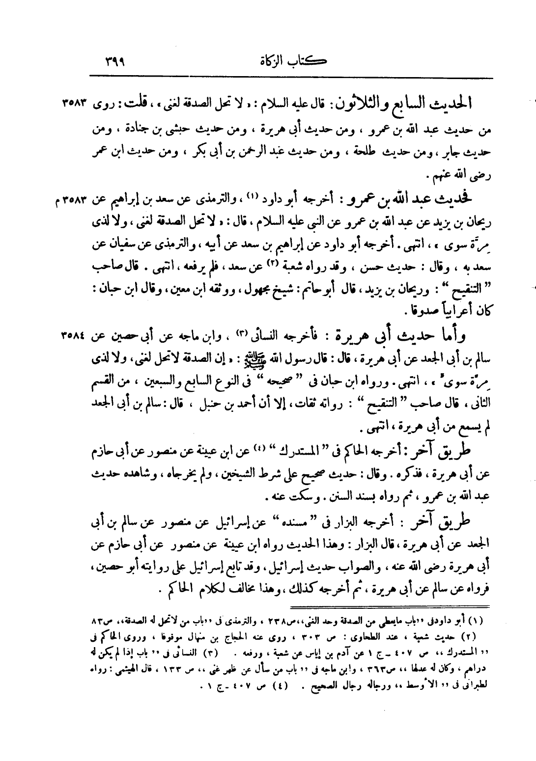 الْحَدِيثُ السَّابِعُ وَالثَّلَاثُونَ: قَالَ عليه السلام: "لَا تَحِلُّ الصَّدَقَةُ لِغَنِيٍّ"، قُلْت: رُوِيَ مِنْ حَدِيثِ عَبْدِ اللَّهِ بْنِ عَمْرٍو، وَمِنْ حَدِيثِ أَبِي هُرَيْرَةَ، وَمِنْ حَدِيثِ حَبَشِيِّ بْنِ جُنَادَةَ، وَمِنْ حَدِيثِ جَابِرٍ، وَمِنْ حَدِيثِ طَلْحَةَ، وَمِنْ حَدِيثِ عَبْدِ الرَّحْمَنِ بْنِ أَبِي بَكْرٍ، وَمِنْ حَدِيثِ ابْنِ عُمَرَ رضي الله عنهم.