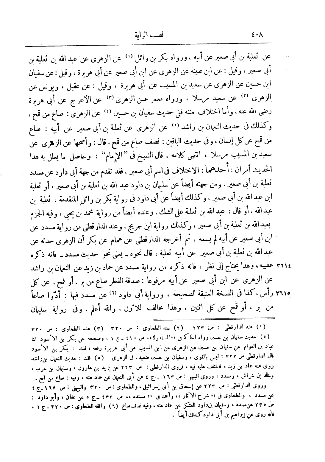عَنْ ثَعْلَبَةَ بْنِ أَبِي صُعَيْرٍ عَنْ أَبِيهِ، وَرَوَاهُ بَكْرُ بْنِ وَائِلٍ1 عَنْ الزُّهْرِيِّ عَنْ عَبْدِ اللَّهِ بْنِ ثَعْلَبَةَ بْنِ أَبِي صُعَيْرٍ، وَقِيلَ: عَنْ ابْنِ عُيَيْنَةَ عَنْ الزُّهْرِيِّ عَنْ ابْنِ أَبِي صُعَيْرٍ عَنْ أَبِي هُرَيْرَةَ، وَقِيلَ: عَنْ سُفْيَانَ بْنِ حُسَيْنٍ عَنْ الزُّهْرِيِّ عَنْ سَعِيدِ بْنِ الْمُسَيِّبِ عَنْ أَبِي هُرَيْرَةَ، وَقِيلَ: عَنْ عُقَيْلٍ، وَيُونُسَ عَنْ الزُّهْرِيِّ2 عَنْ سَعِيدٍ مُرْسَلًا، ورواه معمر على الزُّهْرِيِّ3 عَنْ الْأَعْرَجِ عَنْ أَبِي هُرَيْرَةَ رضي الله عنه، وَأَمَّا اخْتِلَافُ مَتْنِهِ فَفِي حَدِيثِ سُفْيَانَ بْنِ حُسَيْنٍ4 عَنْ الزُّهْرِيِّ: صَاعٌ مِنْ قَمْحٍ، وَكَذَلِكَ فِي حَدِيثِ النُّعْمَانِ بْنِ رَاشِدٍ5 عَنْ الزُّهْرِيِّ عَنْ ثَعْلَبَةَ بْنِ أَبِي صُعَيْرٍ عَنْ أَبِيهِ: صَاعٌ مِنْ قَمْحٍ عَنْ كُلِّ إنْسَانٍ، وَفِي حَدِيثِ الْبَاقِينَ: نِصْفُ صَاعٍ مِنْ قَمْحٍ، قَالَ: وَأَصَحُّهَا عَنْ الزُّهْرِيِّ عَنْ سَعِيدِ بْنِ الْمُسَيِّبِ مُرْسَلًا، انْتَهَى كَلَامُهُ. قَالَ الشَّيْخُ فِي "الْإِمَامِ": وَحَاصِلُ مَا يُعَلَّلُ بِهِ هَذَا الْحَدِيثُ أَمْرَانِ: أَحَدُهُمَا: الِاخْتِلَافُ فِي اسْمِ أَبِي صُعَيْرٍ، فَقَدْ تَقَدَّمَ مِنْ جِهَةِ أَبِي دَاوُد عَنْ مُسَدَّدٍ ثَعْلَبَةُ بْنِ أَبِي صُعَيْرٍ، وَمِنْ جِهَتِهِ أَيْضًا عَنْ سُلَيْمَانَ بْنِ دَاوُد عَبْدُ اللَّهِ بْنُ ثَعْلَبَةَ بْنِ أَبِي صُعَيْرٍ، أَوْ ثَعْلَبَةُ بْنُ عَبْدِ اللَّهِ بْنِ أَبِي صُعَيْرٍ، وَكَذَلِكَ أَيْضًا عَنْ أَبِي داود رِوَايَةِ بَكْرِ بْنِ وَائِلٍ الْمُتَقَدِّمَةِ , ثَعْلَبَةُ بْنُ عَبْدِ اللَّهِ , أَوْ قَالَ: عَبْدُ اللَّهِ بْنُ ثَعْلَبَةَ عَلَى الشَّكِّ , وَعِنْدَهُ أَيْضًا مِنْ رِوَايَةِ مُحَمَّدِ بْنِ يَحْيَى، وَفِيهِ الْجَزْمُ بِعَبْدِ اللَّهِ بْنِ ثَعْلَبَةَ بْنِ أَبِي صُعَيْرٍ، وَكَذَلِكَ رِوَايَةُ ابْنِ جُرَيْجٍ، وَعِنْدَ الدَّارَقُطْنِيِّ مِنْ رِوَايَةِ مُسَدَّدٍ عَنْ ابْنِ أَبِي صُعَيْرٍ عَنْ أَبِيهِ لَمْ يُسَمِّهِ، ثُمَّ أَخْرَجَهُ الدَّارَقُطْنِيُّ عَنْ هَمَّامٍ عَنْ بَكْرٍ أَنَّ الزُّهْرِيَّ حَدَّثَهُ عَنْ عَبْدِ اللَّهِ بْنِ ثَعْلَبَةَ بْنِ أَبِي صُعَيْرٍ عَنْ أَبِيهِ ثَعْلَبَةَ، قَالَ نَحْوَهُ يَعْنِي نَحْوَ حَدِيثِ مُسَدَّدٍ فَإِنَّهُ ذَكَرَهُ عَقِيبَهُ، وَهَذَا يَحْتَاجُ إلَى نَظَرٍ، فَإِنَّهُ ذَكَرَهُ مِنْ رِوَايَةِ مُسَدَّدٍ عَنْ حَمَّادِ بْنِ زَيْدٍ عَنْ النُّعْمَانِ بْنِ راشد الزُّهْرِيِّ عَنْ ابْنِ أَبِي صُعَيْرٍ عَنْ أَبِيهِ مَرْفُوعًا: صَدَقَةُ الْفِطْرِ صَاعٌ مِنْ بُرٍّ، أَوْ قَمْحٍ، عَنْ كُلِّ رَأْسٍ، كَذَا فِي النُّسْخَةِ الْعَتِيقَةِ الصَّحِيحَةِ، وَرِوَايَةُ أَبِي دَاوُد6 عَنْ مُسَدَّدٍ فِيهَا: أَدُّوا صَاعًا مِنْ بُرٍّ، أَوْ قَمْحٍ عَنْ كُلِّ اثْنَيْنِ، وَهَذَا مُخَالِفٌ لِلْأَوَّلِ، وَاَللَّهُ أَعْلَمُ. وَفِي رِوَايَةِ سُلَيْمَانَ