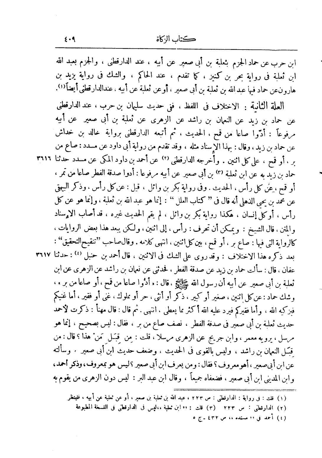 الْعِلَّةُ الثَّانِيَةُ: الِاخْتِلَافُ فِي اللَّفْظِ، فَفِي حَدِيثِ سُلَيْمَانَ بْنِ حَرْبٍ، عِنْدَ الدَّارَقُطْنِيِّ عَنْ حَمَّادِ بْنِ زَيْدٍ عَنْ النُّعْمَانِ بْنِ رَاشِدٍ عَنْ الزُّهْرِيِّ عَنْ ثَعْلَبَةَ بْنِ أَبِي صُعَيْرٍ عَنْ أَبِيهِ مَرْفُوعًا: "أَدُّوا صَاعًا مِنْ قَمْحٍ"، الْحَدِيثَ، ثُمَّ أَتْبَعَهُ الدَّارَقُطْنِيُّ بِرِوَايَةِ خَالِدِ بْنِ خِدَاشٍ عَنْ حَمَّادِ بْنِ زَيْدٍ، وَقَالَ: بِهَذَا الْإِسْنَادِ مِثْلَهُ، وَقَدْ تَقَدَّمَ مِنْ رِوَايَةِ أَبِي دَاوُد عَنْ مُسَدَّدٍ: صَاعٌ مِنْ بُرٍّ، أَوْ قَمْحٍ، عَلَى كُلِّ اثْنَيْنِ. وَأَخْرَجَهُ الدَّارَقُطْنِيُّ2 عَنْ أَحْمَدَ بْنِ دَاوُد الْمَكِّيِّ عَنْ مُسَدَّدٍ حدثنا حماد بن زييد بِهِ عَنْ ابْنِ ثَعْلَبَةَ3 بْنِ أَبِي صُعَيْرٍ عَنْ أَبِيهِ مَرْفُوعًا: "أَدُّوا صَدَقَةَ الْفِطْرِ صَاعًا مِنْ تَمْرٍ، أَوْ قَمْحٍ، عَنْ كُلِّ رَأْسٍ"، الْحَدِيثَ. وَفِي رِوَايَةِ بَكْرِ بْنِ وَائِلٍ، قِيلَ: عَنْ كُلِّ رَأْسٍ، وَذَكَرَ الْبَيْهَقِيُّ عَنْ مُحَمَّدِ بْنِ يَحْيَى الذُّهْلِيِّ أَنَّهُ قَالَ فِي "كِتَابِ الْعِلَلِ": إنَّمَا هُوَ عَبْدُ اللَّهِ بْنُ ثَعْلَبَةَ، وَإِنَّمَا هُوَ عَنْ كُلِّ رَأْسٍ، أَوْ كُلِّ إنْسَانٍ، هَكَذَا رِوَايَةُ بَكْرِ بْنِ وَائِلٍ، لَمْ يُقِمْ الْحَدِيثَ غَيْرُهُ، قَدْ أَصَابَ الْإِسْنَادَ وَالْمَتْنَ، قَالَ الشَّيْخُ: وَيُمْكِنُ أَنْ تُحَرَّفَ: رَأْسٌ، إلَى اثْنَيْنِ، وَلَكِنْ يُبْعِدُ هَذَا بَعْضُ الرِّوَايَاتِ، كَالرِّوَايَةِ الَّتِي فِيهَا: صَاعُ بُرٍّ، أَوْ قَمْحٍ، بَيْنَ كُلِّ اثْنَيْنِ، انْتَهَى كَلَامُهُ. وَقَالَ صَاحِبُ "تَنْقِيحِ التَّحْقِيقِ" بَعْدَ ذِكْرِهِ هَذَا الِاخْتِلَافَ: وَقَدْ رُوِيَ عَلَى الشَّكِّ فِي الِاثْنَيْنِ، قَالَ أَحْمَدُ بْنُ حَنْبَلٍ4: حَدَّثَنَا عَفَّانَ، قَالَ: سَأَلْت حَمَّادَ بْنَ زَيْدٍ عَنْ صَدَقَةِ الْفِطْرِ، فَحَدَّثَنِي عَنْ نُعْمَانَ بْنِ رَاشِدٍ الزُّهْرِيِّ عَنْ ابْنِ ثَعْلَبَةَ بْنِ أَبِي صُعَيْرٍ عَنْ أَبِيهِ أَنَّ رَسُولَ اللَّهِ صَلَّى اللَّهُ عَلَيْهِ وَسَلَّمَ، قَالَ: "أَدُّوا صَاعًا مِنْ قَمْحٍ، أَوْ صَاعًا مِنْ بُرٍّ"، وَشَكَّ حَمَّادٌ: عَنْ كُلِّ اثْنَيْنِ، صَغِيرٍ أَوْ كَبِيرٍ، ذَكَرٍ أَوْ أُنْثَى، حُرٍّ أَوْ مَمْلُوكٍ، غَنِيٍّ أَوْ فَقِيرٍ، أَمَّا غَنِيُّكُمْ فَيُزَكِّيهِ اللَّهُ، وَأَمَّا فَقِيرُكُمْ فَيَرُدُّ عَلَيْهِ اللَّهُ أَكْثَرَ مِمَّا يُعْطِي، انْتَهَى. ثُمَّ قَالَ: قَالَ مُهَنَّا: ذَكَرْت لِأَحْمَدَ حَدِيثَ ثَعْلَبَةَ بْنِ أَبِي صُعَيْرٍ فِي صَدَقَةِ الْفِطْرِ، نِصْفُ صَاعٍ مِنْ بُرٍّ، فَقَالَ: لَيْسَ بِصَحِيحٍ، إنَّمَا هُوَ مُرْسَلٌ، يَرْوِيهِ مَعْمَرٌ، وَابْنُ جُرَيْجٍ عَنْ الزُّهْرِيِّ مُرْسَلًا، قُلْت: مِنْ قِبَلِ مَنْ هَذَا؟ قَالَ: مِنْ قِبَلِ النُّعْمَانِ بْنِ رَاشِدٍ، وَلَيْسَ بِالْقَوِيِّ فِي الْحَدِيثِ، وَضَعَّفَ حَدِيثَ ابْنِ أَبِي صُعَيْرٍ، وَسَأَلْته عَنْ ابْنِ أَبِي صُعَيْرٍ، أَهُوَ مَعْرُوفٌ؟ فَقَالَ: وَمَنْ يَعْرِفُ ابْنَ أَبِي صُعَيْرٍ؟ لَيْسَ هُوَ مَعْرُوفٌ، وَذَكَرَ أَحْمَدُ، وَابْنُ الْمَدِينِيِّ بْنَ أَبِي صُعَيْرٍ، فَضَعَّفَاهُ جَمِيعًا، وَقَالَ ابْنُ عَبْدِ الْبَرِّ: لَيْسَ دُونَ الزُّهْرِيِّ مَنْ يَقُومُ بِهِ
