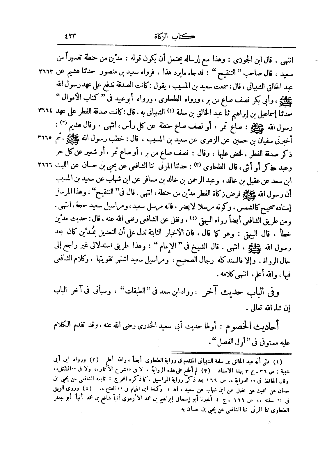 انْتَهَى. قَالَ ابْنُ الْجَوْزِيِّ: وَهَذَا مَعَ إرْسَالِهِ يَحْتَمِلُ أَنْ يَكُونَ قَوْلُهُ: مُدَّيْنِ مِنْ حِنْطَةٍ تَفْسِيرًا مِنْ سَعِيدٍ، قَالَ صَاحِبُ "التَّنْقِيحِ": قَدْ جَاءَ مَا يَرُدُّ هَذَا، فَرَوَاهُ سَعِيدُ بْنُ مَنْصُورٍ حَدَّثَنَا هُشَيْمِ عَنْ عَبْدِ الْخَالِقِ الشَّيْبَانِيِّ، قَالَ: سَمِعْت سَعِيدَ بْنَ الْمُسَيِّبِ، يَقُولُ: كَانَتْ الصَّدَقَةُ تُدْفَعُ عَلَى عَهْدِ رَسُولِ اللَّهِ صَلَّى اللَّهُ عَلَيْهِ وَسَلَّمَ، وَأَبِي بَكْرٍ نِصْفَ صَاعٍ مِنْ بُرٍّ، وَرَوَاهُ الطَّحَاوِيُّ، وَرَوَاهُ أَبُو عُبَيْدٍ فِي "كِتَابِ الْأَمْوَالِ" حَدَّثَنَا إسْمَاعِيلُ بْنُ إبْرَاهِيمَ ثَنَا عَبْدُ الْخَالِقِ بْنُ سَلَمَةَ1 الشَّيْبَانِيُّ بِهِ، قَالَ: كَانَتْ صَدَقَةُ الْفِطْرِ عَلَى عَهْدِ رَسُولِ اللَّهِ صَلَّى اللَّهُ عَلَيْهِ وَسَلَّمَ: صَاعَ تَمْرٍ، أَوْ نِصْفَ صَاعِ حِنْطَةٍ عَنْ كُلِّ رَأْسٍ، انْتَهَى. وَقَالَ هُشَيْمِ2: أَخْبَرَنِي سُفْيَانُ بْنُ حُسَيْنٍ عَنْ الزُّهْرِيِّ عَنْ سَعِيدِ بْنِ الْمُسَيِّبِ، قَالَ: خَطَبَ رَسُولُ اللَّهِ صَلَّى اللَّهُ عَلَيْهِ وَسَلَّمَ، ثُمَّ ذَكَرَ صَدَقَةَ الْفِطْرِ، فَحَضَّ عَلَيْهَا، وَقَالَ: "نِصْفُ صَاعٍ مِنْ بُرٍّ، أَوْ صَاعُ تَمْرٍ، أَوْ شَعِيرٍ عَنْ كُلِّ حُرٍّ وَعَبْدٍ، ذَكَرٍ أَوْ أُنْثَى"، قَالَ الطَّحَاوِيُّ3: حَدَّثَنَا الْمُزَنِيّ ثَنَا الشَّافِعِيُّ عَنْ يَحْيَى بْنِ حَسَّانَ عَنْ اللَّيْثِ بْنِ سَعْدٍ عَنْ عُقَيْلِ بْنِ خَالِدٍ، وَعَبْدِ الرَّحْمَنِ بْنِ خَالِدِ بْنِ مُسَافِرٍ عَنْ ابْنِ شِهَابٍ عَنْ سَعِيدِ بْنِ الْمُسَيِّبِ أَنَّ رَسُولَ اللَّهِ صَلَّى اللَّهُ عَلَيْهِ وَسَلَّمَ فَرَضَ زَكَاةَ الْفِطْرِ مَدَّيْنِ مِنْ حِنْطَةٍ، انْتَهَى. قَالَ فِي "التَّنْقِيحِ": وَهَذَا الْمُرْسَلُ إسْنَادُهُ صَحِيحٌ كَالشَّمْسِ، وَكَوْنُهُ مُرْسَلًا لَا يَضُرُّ، فَإِنَّهُ مُرْسَلُ سَعِيدٍ، وَمَرَاسِيلُ سَعِيدٍ حُجَّةٌ، انْتَهَى. وَمِنْ طَرِيقِ الشَّافِعِيِّ أَيْضًا رَوَاهُ الْبَيْهَقِيُّ4، وَنَقَلَ عَنْ الشَّافِعِيِّ رضي الله عنه، قَالَ: حَدِيثُ مُدَّيْنِ خَطَأٌ، قَالَ الْبَيْهَقِيُّ: وَهُوَ كَمَا قَالَ، فَإِنَّ الْأَخْبَارَ الثَّابِتَةَ تَدُلُّ عَلَى أَنَّ التَّعْدِيلَ بِمُدَّيْنِ كَانَ بَعْدَ رَسُولِ اللَّهِ صَلَّى اللَّهُ عَلَيْهِ وَسَلَّمَ، انْتَهَى. قَالَ الشَّيْخُ فِي "الْإِمَامِ": وَهَذَا طَرِيقٌ اسْتِدْلَالِيٌّ غَيْرُ رَاجِعٍ إلَى حَالِ الرُّوَاةِ، وَإِلَّا فَالسَّنَدُ كُلُّهُ رِجَالُ الصَّحِيحِ، وَمَرَاسِيلُ سَعِيدٍ اُشْتُهِرَ تَقْوِيَتُهَا، وَكَلَامُ الشَّافِعِيِّ فِيهَا، وَاَللَّهُ أَعْلَمُ، انْتَهَى كَلَامُهُ.