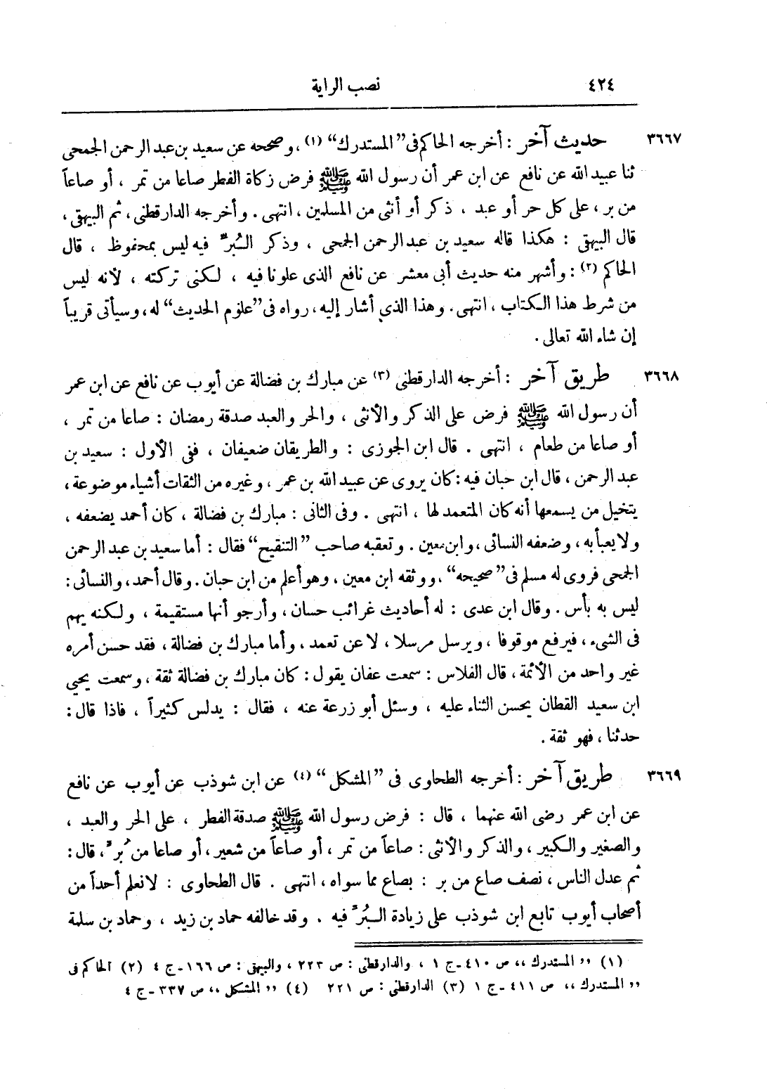 طَرِيقٌ آخَرُ: أَخْرَجَهُ الدَّارَقُطْنِيُّ3 عَنْ مُبَارَكِ بْنِ فَضَالَةَ عَنْ أَيُّوبَ عَنْ نَافِعٍ عَنْ ابْنِ عُمَرَ أَنَّ رَسُولَ اللَّهِ صَلَّى اللَّهُ عَلَيْهِ وَسَلَّمَ فَرَضَ عَلَى الذَّكَرِ وَالْأُنْثَى، وَالْحُرِّ وَالْعَبْدِ صَدَقَةَ رَمَضَانَ: صَاعًا مِنْ تَمْرٍ، أَوْ صَاعًا مِنْ طَعَامٍ، انْتَهَى. قَالَ ابْنُ الْجَوْزِيِّ: وَالطَّرِيقَانِ ضَعِيفَانِ، فَفِي الْأَوَّلِ: سَعِيدُ بْنُ عَبْدِ الرَّحْمَنِ، قَالَ ابْنُ حِبَّانَ فِيهِ: كَانَ يَرْوِي عَنْ عُبَيْدِ اللَّهِ بْنِ عُمَرَ، وَغَيْرِهِ مِنْ الثِّقَاتِ أَشْيَاءَ مَوْضُوعَةً، يَتَخَيَّلُ مَنْ يَسْمَعُهَا أَنَّهُ كَانَ المتعمد لَهَا، انْتَهَى. وَفِي الثَّانِي: مُبَارَكُ بْنُ فَضَالَةَ، كَانَ أَحْمَدُ يُضَعِّفُهُ، وَلَا يَعْبَأُ بِهِ، وَضَعَّفَهُ النَّسَائِيُّ، وَابْنُ مَعِينٍ. وَتَعَقَّبَهُ صَاحِبُ "التَّنْقِيحِ" فَقَالَ: أَمَّا سَعِيدُ بْنُ عَبْدِ الرَّحْمَنِ الْجُمَحِيُّ فَرَوَى لَهُ مُسْلِمٌ فِي "صَحِيحِهِ"، وَوَثَّقَهُ ابْنُ مَعِينٍ، وَهُوَ أَعْلَمُ مِنْ ابْنِ حِبَّانَ. وَقَالَ أَحْمَدُ، وَالنَّسَائِيُّ: لَيْسَ بِهِ بَأْسٌ. وَقَالَ ابْنُ عَدِيٍّ: لَهُ أَحَادِيثُ غَرَائِبُ حِسَانٌ، وَأَرْجُو أَنَّهَا مُسْتَقِيمَةٌ، وَلَكِنَّهُ يَهِمُ فِي الشَّيْءِ، فَيَرْفَعُ مَوْقُوفًا، وَيُرْسِلُ مُرْسَلًا، لَا عَنْ تَعَمُّدٍ، وَأَمَّا مُبَارَكُ بْنُ فَضَالَةَ، فَقَدْ حَسَّنَ أَمْرَهُ غَيْرُ وَاحِدٍ مِنْ الْأَئِمَّةِ، قَالَ الْفَلَّاسُ: سَمِعْت عَفَّانَ يَقُولُ: كَانَ مُبَارَكُ بْنُ فَضَالَةَ ثِقَةً، وَسَمِعْت يَحْيَى بْنَ سَعِيدٍ الْقَطَّانَ يُحْسِنُ الثَّنَاءَ عَلَيْهِ، وَسُئِلَ أَبُو زُرْعَةَ عَنْهُ، فَقَالَ: يُدَلِّسُ كَثِيرًا، فَإِذَا قَالَ: حَدَّثَنَا، فَهُوَ ثِقَةٌ.
