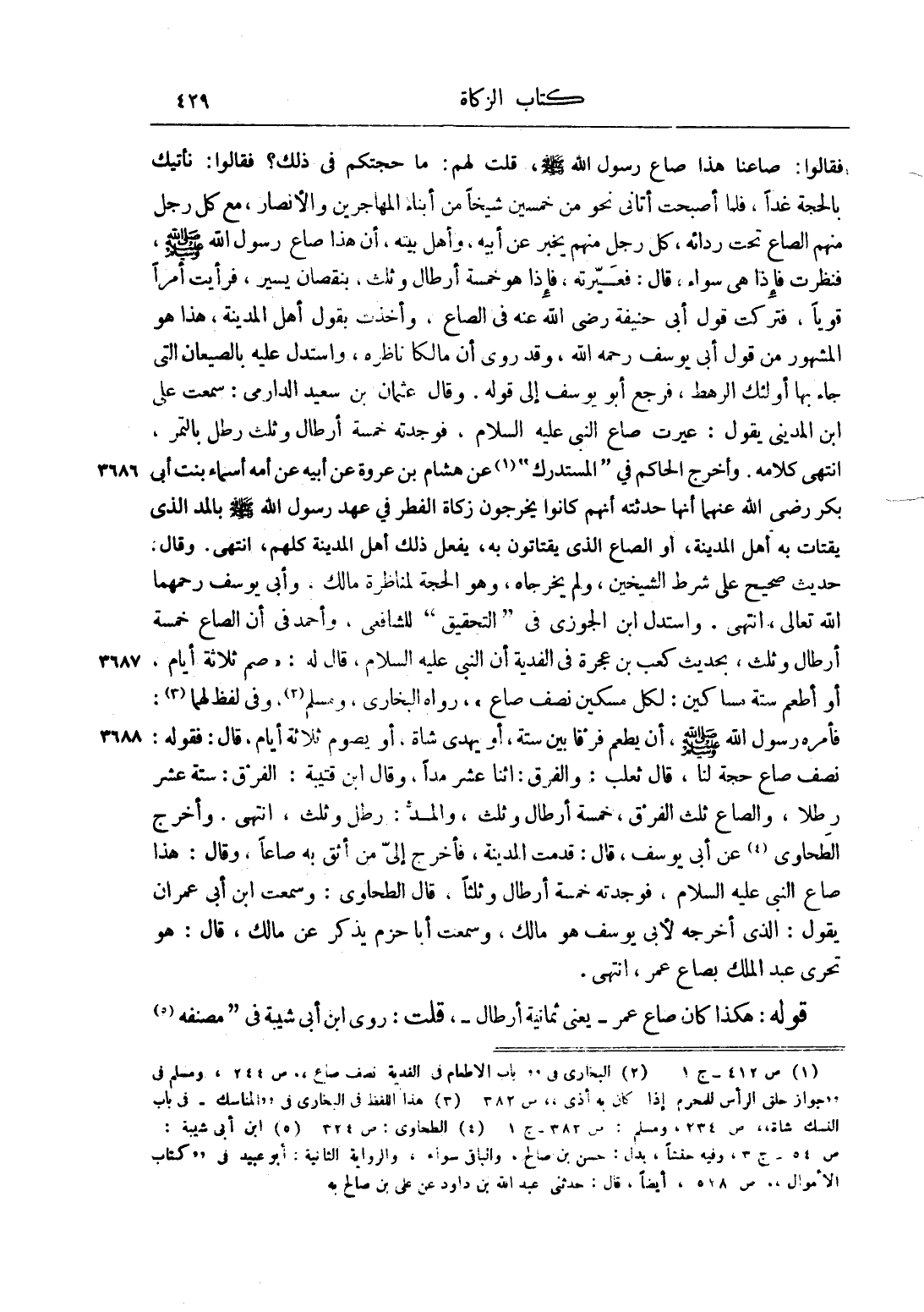 فَقَالَ: صَاعُنَا هَذَا صَاعُ رَسُولِ اللَّهِ صَلَّى اللَّهُ عَلَيْهِ وَسَلَّمَ، قُلْت لَهُمْ: مَا حُجَّتُكُمْ فِي ذَلِكَ؟ فَقَالُوا: نَأْتِيك بِالْحُجَّةِ غَدًا، فَلَمَّا أَصْبَحْت أَتَانِي نَحْوٌ مِنْ خَمْسِينَ شَيْخًا مِنْ أَبْنَاءِ الْمُهَاجِرِينَ وَالْأَنْصَارِ، مَعَ كُلِّ رَجُلٍ مِنْهُمْ الصَّاعُ تَحْتَ رِدَائِهِ، كُلُّ رَجُلٍ مِنْهُمْ يُخْبِرُ عَنْ أَبِيهِ، وَأَهْلِ بَيْتِهِ، أَنَّ هَذَا صَاعُ رَسُولِ اللَّهِ صَلَّى اللَّهُ عَلَيْهِ وَسَلَّمَ، فَنَظَرْت فَإِذَا هِيَ سَوَاءٌ، قَالَ: فَعَيَّرْته، فَإِذَا هُوَ خَمْسَةُ أَرْطَالٍ وَثُلُثٌ، بِنُقْصَانٍ يَسِيرٍ، فَرَأَيْت أَمْرًا قَوِيًّا، فَتَرَكْت قَوْلَ أَبِي حَنِيفَةَ رضي الله عنه فِي الصَّاعِ، وَأَخَذْت بِقَوْلِ أَهْلِ الْمَدِينَةِ، هَذَا هُوَ الْمَشْهُورُ مِنْ قَوْلِ أَبِي يُوسُفَ رحمه الله، وَقَدْ رُوِيَ أَنَّ مَالِكًا ناظره، واستدل عليه بالصيعان الَّتِي جَاءَ بِهَا أُولَئِكَ الرَّهْطُ، فَرَجَعَ أَبُو يُوسُفَ إلَى قَوْلِهِ. وَقَالَ عُثْمَانُ بن سعيد الدرامي: سَمِعْت عَلِيَّ بْنَ الْمَدِينِيِّ يَقُولُ: عَيَّرْت صَاعَ النَّبِيِّ عليه السلام، فَوَجَدْته خَمْسَةَ أَرْطَالٍ وَثُلُثَ رِطْلٍ بِالتَّمْرِ، انْتَهَى كَلَامُهُ. وَأَخْرَجَ الْحَاكِمُ فِي "الْمُسْتَدْرَكِ"1 عَنْ هِشَامِ بْنِ عُرْوَةَ عَنْ أُمِّهِ أَسْمَاءَ بِنْتِ أَبِي بَكْرٍ رضي الله عنهما أَنَّهَا حَدَّثَتْهُ أَنَّهُمْ كَانُوا يُخْرِجُونَ زَكَاةَ الْفِطْرِ فِي عَهْدِ رَسُولِ اللَّهِ صَلَّى اللَّهُ عَلَيْهِ وَسَلَّمَ بِالْمُدِّ الَّذِي يَقْتَاتُ بِهِ أَهْلُ الْمَدِينَةِ، أَوْ الصَّاعِ الَّذِي يُقْتَاتُ بِهِ، يَفْعَلُ ذَلِكَ أَهْلُ الْمَدِينَةِ كُلُّهُمْ، انْتَهَى. وَقَالَ: حَدِيثٌ صَحِيحٌ عَلَى شَرْطِ الشَّيْخَيْنِ، وَلَمْ يُخْرِجَاهُ، وَهُوَ الْحُجَّةُ لِمُنَاظَرَةِ مَالِكٍ، وَأَبِي يُوسُفَ رَحِمَهُمَا اللَّهُ تَعَالَى، انْتَهَى. وَاسْتَدَلَّ ابْنُ الْجَوْزِيِّ فِي "التَّحْقِيقِ" لِلشَّافِعِيِّ، وَأَحْمَدَ فِي أَنَّ الصَّاعَ خَمْسَةُ أَرْطَالٍ وَثُلُثٌ، بِحَدِيثِ كَعْبِ بْنِ عُجْرَةَ فِي الْفِدْيَةِ أَنَّ النَّبِيَّ عليه السلام، قَالَ لَهُ: "صُمْ ثَلَاثَةَ أَيَّامٍ، أَوْ أَطْعِمْ سِتَّةَ مَسَاكِينَ: لِكُلِّ مِسْكِينٍ نِصْفُ صَاعٍ"، رَوَاهُ الْبُخَارِيُّ، وَمُسْلِمٌ2، وَفِي لَفْظٍ لَهُمَا3: فَأَمَرَهُ رَسُولُ اللَّهِ صَلَّى اللَّهُ عَلَيْهِ وَسَلَّمَ، أَنْ يُطْعِمَ فَرْقًا بَيْنَ سِتَّةٍ، أَوْ يُهْدِي شَاةً، أَوْ يَصُومَ ثَلَاثَةَ أَيَّامٍ، قَالَ: فَقَوْلُهُ: نِصْفُ صَاعٍ حُجَّةٌ لَنَا، قَالَ ثَعْلَبٌ: وَالْفَرْقُ: اثْنَا عَشَرَ مُدًّا، وَقَالَ ابْنُ قُتَيْبَةَ: الْفَرْقُ: سِتَّةَ عَشَرَ رِطْلًا، وَالصَّاعُ ثُلُثُ الْفَرْقِ، خَمْسَةُ أَرْطَالٍ وَثُلُث، وَالْمُدُّ: رِطْلٌ وَثُلُثٌ، انْتَهَى. وَأَخْرَجَ الطَّحَاوِيُّ4 عَنْ أَبِي يُوسُفَ، قَالَ: قَدِمَتْ الْمَدِينَةَ، فَأَخْرَجَ إلَيَّ مَنْ أَثِقُ بِهِ صَاعًا، وَقَالَ: هَذَا صَاعُ النَّبِيِّ عليه السلام، فَوَجَدْته خَمْسَةَ أَرْطَالٍ وَثُلُثًا، قَالَ الطَّحَاوِيُّ: وَسَمِعْت ابْنَ أَبِي عِمْرَانَ يَقُولُ: الَّذِي أَخْرَجَهُ لِأَبِي يُوسُفَ هُوَ مَالِكٌ، وَسَمِعْت أَبَا حَزْمٍ يَذْكُرُ عَنْ مَالِكٍ، قَالَ: هُوَ تَحَرِّي عَبْدِ الْمَلِكِ بِصَاعِ عُمَرَ، انْتَهَى.