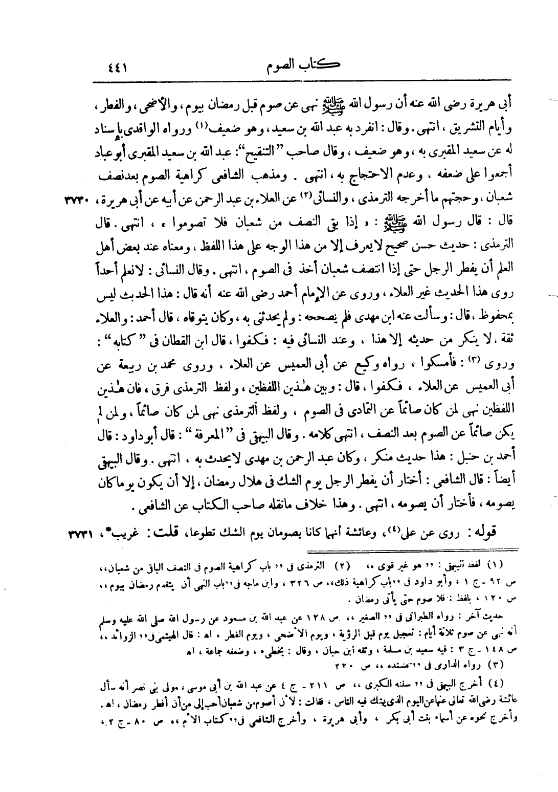 أَبِي هُرَيْرَةَ رضي الله عنه أَنَّ رَسُولَ اللَّهِ صَلَّى اللَّهُ عَلَيْهِ وَسَلَّمَ نَهَى عَنْ صَوْمٍ قَبْلَ رَمَضَانَ بِيَوْمٍ، وَالْأَضْحَى، وَالْفِطْرِ، وَأَيَّامِ التَّشْرِيقِ، انْتَهَى. وَقَالَ: انْفَرَدَ بِهِ عَبْدُ اللَّهِ بْنُ سَعِيدٍ، وَهُوَ ضَعِيفٌ1 وَرَوَاهُ الْوَاقِدِيُّ بِإِسْنَادٍ لَهُ عَنْ سَعِيدٍ الْمَقْبُرِيِّ بِهِ، وَهُوَ ضَعِيفٌ، وَقَالَ صَاحِبُ "التَّنْقِيحِ": عَبْدُ اللَّهِ بْنُ سَعِيدٍ الْمَقْبُرِيُّ أَبُو عَبَّادٍ أَجْمَعُوا عَلَى ضَعْفِهِ، وَعَدَمِ الِاحْتِجَاجِ بِهِ، انْتَهَى. وَمَذْهَبُ الشَّافِعِيِّ كَرَاهِيَةُ الصَّوْمِ بَعْدَ نِصْفِ شَعْبَانَ، وَحُجَّتُهُمْ مَا أَخْرَجَهُ التِّرْمِذِيُّ، وَالنَّسَائِيُّ2 عَنْ الْعَلَاءِ بْنِ عَبْدِ الرَّحْمَنِ عَنْ أَبِيهِ عَنْ أَبِي هُرَيْرَةَ، قَالَ: قَالَ رَسُولُ اللَّهِ صَلَّى اللَّهُ عَلَيْهِ وَسَلَّمَ: "إذَا بَقِيَ النِّصْفُ مِنْ شَعْبَانَ فَلَا تَصُومُوا"، انْتَهَى. قَالَ التِّرْمِذِيُّ: حَدِيثٌ حَسَنٌ صَحِيحٌ لَا يُعْرَفُ إلَّا مِنْ هَذَا الْوَجْهِ عَلَى هَذَا اللَّفْظِ، وَمَعْنَاهُ عِنْدَ بَعْضِ أَهْلِ الْعِلْمِ أَنْ يُفْطِرَ الرَّجُلُ حَتَّى إذَا انْتَصَفَ شَعْبَانُ أَخَذَ فِي الصَّوْمِ، انْتَهَى. وَقَالَ النَّسَائِيّ: لَا نَعْلَمُ أَحَدًا رَوَى هَذَا الْحَدِيثَ غَيْرَ الْعَلَاءِ، وَرُوِيَ عَنْ الْإِمَامِ أَحْمَدَ رضي الله عنه أَنَّهُ قَالَ: هَذَا الْحَدِيثُ لَيْسَ بِمَحْفُوظٍ، قَالَ: وَسَأَلْت عَنْهُ ابْنَ مَهْدِيٍّ فَلَمْ يُصَحِّحْهُ: وَلَمْ يُحَدِّثْنِي بِهِ، وَكَانَ يَتَوَقَّاهُ، قَالَ أَحْمَدُ: وَالْعَلَاءُ ثِقَةٌ، لاينكر مِنْ حَدِيثِهِ إلَّا هَذَا، وَعِنْدَ النَّسَائِيّ فِيهِ: فَكُفُّوا، قَالَ ابْنُ الْقَطَّانِ فِي "كِتَابِهِ": وَرُوِيَ3: فَأَمْسِكُوا، رَوَاهُ وَكِيعٌ عَنْ أَبِي الْعُمَيْسِ عَنْ الْعَلَاءِ، وَرَوَى مُحَمَّدُ بْنُ رَبِيعَةَ عَنْ أَبِي الْعُمَيْسِ عَنْ الْعَلَاءِ، فَكُفُّوا، قَالَ: وَبَيْنَ هَذَيْنِ اللَّفْظَيْنِ، وَلَفْظِ التِّرْمِذِيِّ فَرْقٌ، فَإِنَّ هَذَيْنِ اللَّفْظَيْنِ نَهْيٌ لِمَنْ كَانَ صَائِمًا عَنْ التَّمَادِي فِي الصَّوْمِ، وَلَفْظُ التِّرْمِذِيِّ نَهْيٌ لِمَنْ كَانَ صَائِمًا، وَلِمَنْ لَمْ يَكُنْ صَائِمًا عَنْ الصَّوْمِ بَعْدَ النِّصْفِ، انْتَهَى كَلَامُهُ. وَقَالَ الْبَيْهَقِيُّ فِي "الْمَعْرِفَةِ": قَالَ أَبُو دَاوُد: قَالَ أَحْمَدُ بْنُ حَنْبَلٍ: هَذَا حَدِيثٌ مُنْكَرٌ، وَكَانَ عَبْدُ الرَّحْمَنِ بْنُ مَهْدِيٍّ لَا يُحَدِّثُ بِهِ، انْتَهَى. وَقَالَ الْبَيْهَقِيُّ أَيْضًا: قَالَ الشَّافِعِيُّ: أَخْتَارُ أَنْ يُفْطِرَ الرَّجُلُ يَوْمَ الشَّكِّ فِي هِلَالِ رَمَضَانَ، إلَّا أَنْ يَكُونَ يَوْمًا كَانَ يَصُومُهُ، فَأَخْتَارُ أَنْ يَصُومَهُ، انْتَهَى. وَهَذَا خِلَافُ مَا نَقَلَهُ صَاحِبُ الْكِتَابِ عَنْ الشَّافِعِيِّ.