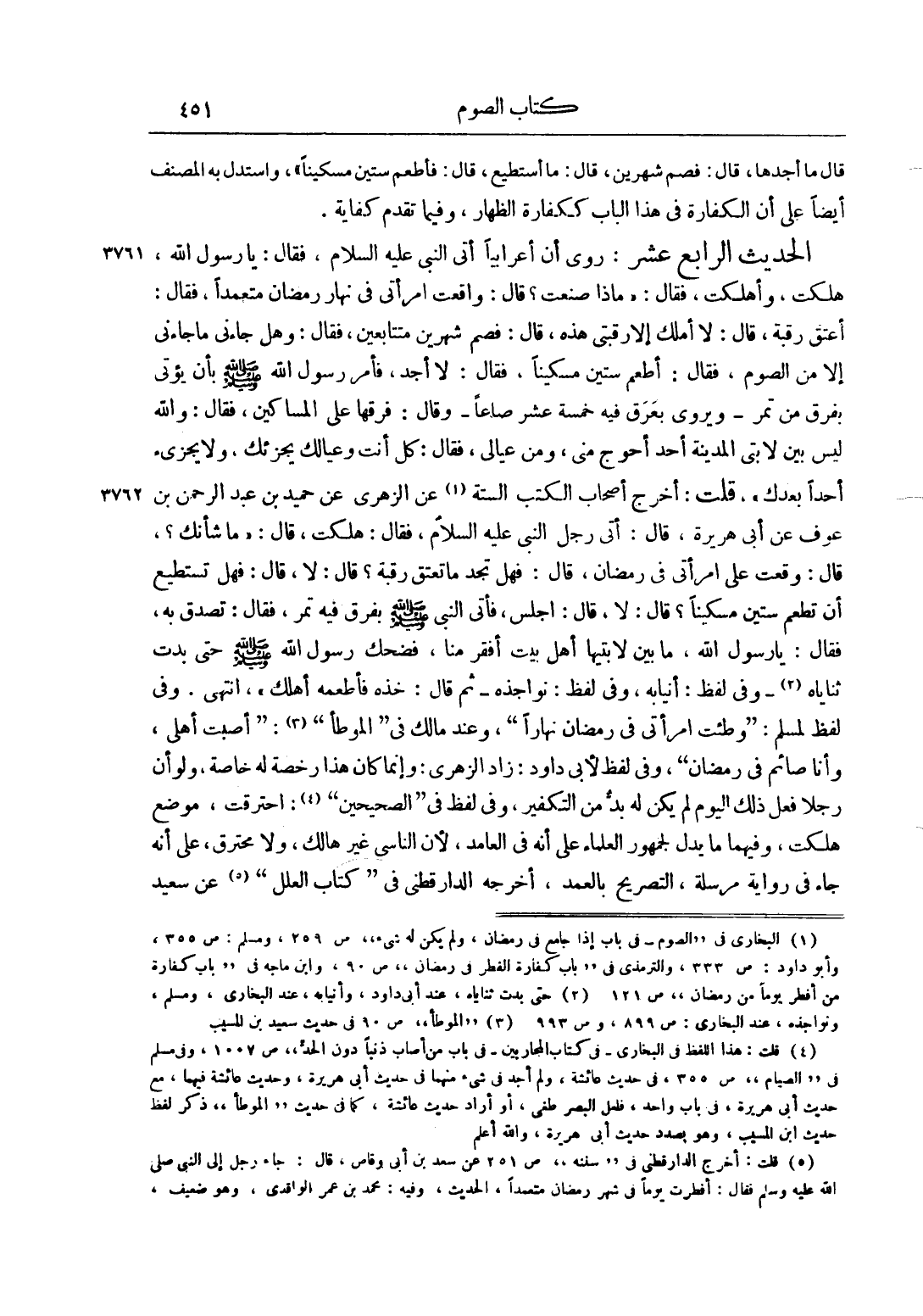 1 البخاري في "الصوم في باب إذا جامع في رمضان، ولم يكن له شيء" ص 259، ومسلم: ص 355، وأبو داود: ص 333، والترمذي في "باب كفارة الفطر في رمضان" ص 90، وابن ماجه في "باب كفارة من أفطر يوماً من رمضان" ص 121.
