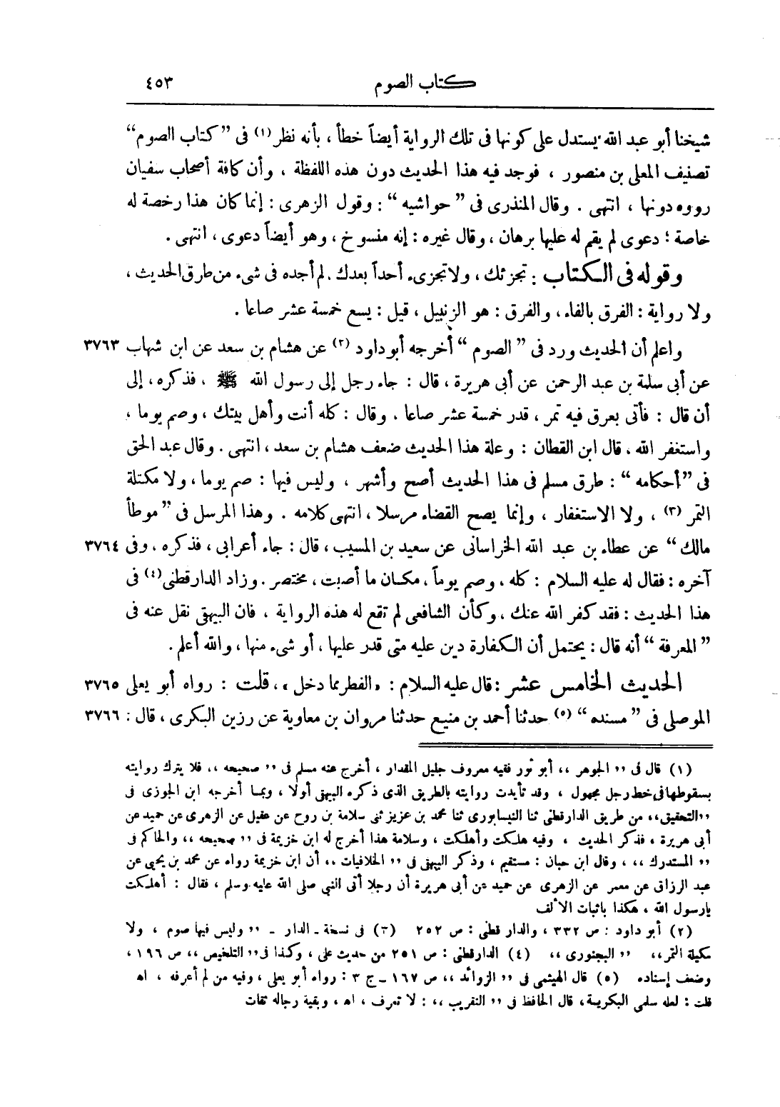 شَيْخُنَا أَبُو عَبْدِ اللَّهِ يَسْتَدِلُّ عَلَى كَوْنِهَا فِي تِلْكَ الرِّوَايَةِ أَيْضًا خَطَأً، بِأَنَّهُ نَظَرَ1 فِي "كِتَابِ الصَّوْمِ" تَصْنِيفِ الْمُعَلَّى بْنِ مَنْصُورٍ، فَوَجَدَ فِيهِ هَذَا الْحَدِيثَ دُونَ هَذِهِ اللَّفْظَةِ، وَأَنَّ كَافَّةَ أَصْحَابِ سُفْيَانِ رَوَوْهُ دُونَهَا، انْتَهَى. وَقَالَ الْمُنْذِرِيُّ فِي "حَوَاشِيهِ": وَقَوْلُ الزُّهْرِيِّ: إنَّمَا كَانَ هَذَا رُخْصَةً لَهُ خَاصَّةً، دَعْوَى لَمْ يَقُمْ لَهُ عَلَيْهَا بُرْهَانٌ، وَقَالَ غَيْرُهُ: إنَّهُ مَنْسُوخٌ، وَهُوَ أَيْضًا دَعْوَى، انْتَهَى.