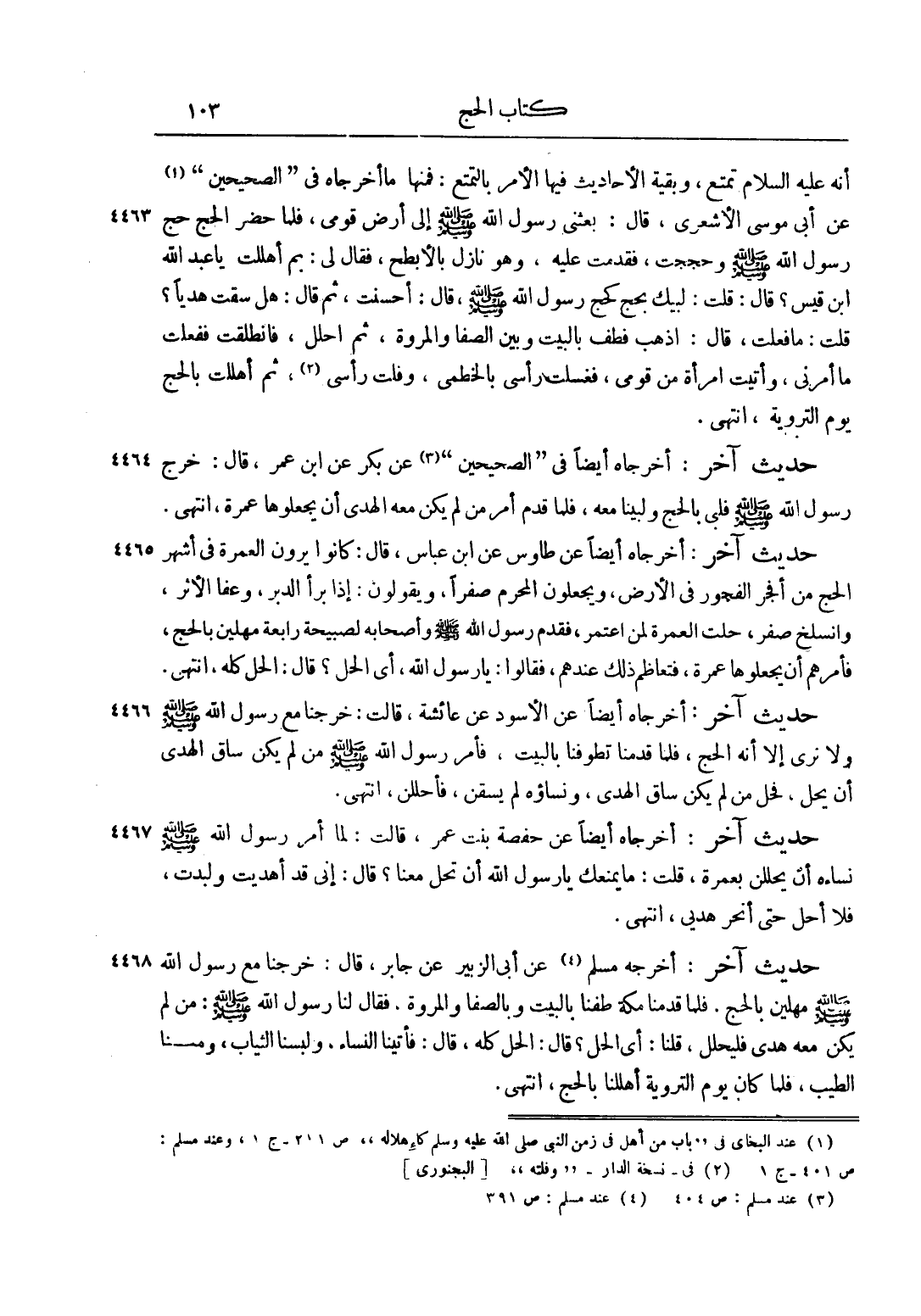 حَدِيثٌ آخَرُ: أَخْرَجَهُ مُسْلِمٌ 4 عَنْ أَبِي الزُّبَيْرِ عَنْ جَابِرٍ، قَالَ: خَرَجْنَا مَعَ رَسُولِ اللَّهِ صَلَّى اللَّهُ عَلَيْهِ وَسَلَّمَ مُهِلِّينَ بِالْحَجِّ. فَلَمَّا قَدِمْنَا مَكَّةَ طُفْنَا بِالْبَيْتِ وَبِالصَّفَا وَالْمَرْوَةِ، فَقَالَ لَنَا رَسُولُ اللَّهِ صَلَّى اللَّهُ عَلَيْهِ وَسَلَّمَ: " مَنْ لَمْ يَكُنْ مَعَهُ هَدْيٌ فَلْيَحْلُلْ، قُلْنَا: أَيُّ الْحِلِّ؟ قَالَ: الْحِلُّ كُلُّهُ"، قَالَ: فَأَتَيْنَا النِّسَاءَ، وَلَبِسْنَا الثِّيَابَ، وَمَسَسْنَا الطِّيبَ، فَلَمَّا كَانَ يَوْمُ التَّرْوِيَةِ أَهْلَلْنَا بِالْحَجِّ، انْتَهَى.