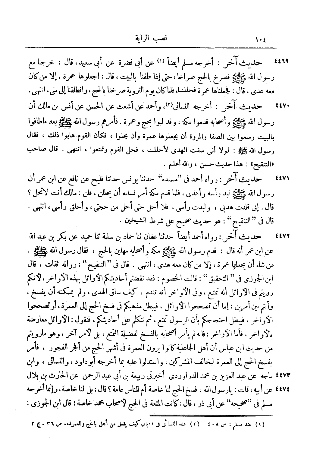 حَدِيثٌ آخَرُ: رَوَاهُ أَحْمَدُ أَيْضًا حَدَّثَنَا عَفَّانَ ثَنَا حَمَّادُ بْنُ سَلَمَةَ ثَنَا حُمَيْدٍ عَنْ بَكْرِ بْنِ عَبْدِ اللَّهِ عَنْ ابْنِ عُمَرَ أَنَّهُ قَالَ: قَدِمَ رَسُولُ اللَّهِ صَلَّى اللَّهُ عَلَيْهِ وَسَلَّمَ مَكَّةَ وَأَصْحَابُهُ مُهِلِّينَ بِالْحَجِّ، فَقَالَ رَسُولُ اللَّهِ صَلَّى اللَّهُ عَلَيْهِ وَسَلَّمَ: "مَنْ شَاءَ أَنْ يَجْعَلَهَا عُمْرَةً، إلَّا مَنْ كَانَ مَعَهُ هَدْيٌ"، انْتَهَى. قَالَ فِي "التَّنْقِيحِ": رُوَاتُهُ ثِقَاتٌ، قَالَ ابْنُ الْجَوْزِيِّ فِي "التَّحْقِيقِ": قَالَتْ الْخُصُومُ: فَقَدْ نَقَضْتُمْ أَحَادِيثَكُمْ الْأَوَائِلَ بِهَذِهِ الْأَوَاخِرِ، لِأَنَّكُمْ رَوَيْتُمْ فِي الْأَوَائِلِ أَنَّهُ تَمَتَّعَ، وَفِي الْأَوَاخِرِ أَنَّهُ تَنَدَّمَ، كَيْفَ سَاقَ الْهَدْيَ، وَلَمْ يُمْكِنْهُ أَنْ يَفْسَخَ، وَأَنْتُمْ بَيْنَ أَمْرَيْنِ: إمَّا أَنْ تُصَحِّحُوا الْأَوَائِلَ، فَيَبْطُلَ مَذْهَبُكُمْ فِي فَسْخِ الْحَجِّ إلَى الْعُمْرَةِ، أَوْ تُصَحِّحُوا الْأَوَاخِرَ، فَيَبْطُلَ احْتِجَاجُكُمْ بِأَنَّ الرَّسُولَ تَمَتَّعَ، ثُمَّ نَتَكَلَّمُ عَلَى أَحَادِيثِكُمْ، فَنَقُولُ: الْأَوَائِلُ مُعَارَضَةٌ بِالْأَوَاخِرِ، فَأَمَّا الْأَوَاخِرُ: فَإِنَّهُ لَمْ يَأْمُرْ أَصْحَابَهُ بِالْفَسْخِ لِفَضِيلَةِ التَّمَتُّعِ، بَلْ لِأَمْرٍ آخَرَ، وَهُوَ مَا رَوَيْتُمْ مِنْ حَدِيثِ ابْنِ عَبَّاسٍ أَنَّ أَهْلَ الْجَاهِلِيَّةِ كَانُوا يَرَوْنَ الْعُمْرَةَ فِي أَشْهُرِ الْحَجِّ مِنْ أَفْجَرِ الْفُجُورِ، فَأَمَرَ بِفَسْخِ الْحَجِّ إلَى الْعُمْرَةِ لِيُخَالِفَ الْمُشْرِكِينَ، وَاسْتَدَلُّوا عَلَيْهِ بِمَا أَخْرَجَهُ أَبُو دَاوُد، وَالنَّسَائِيُّ، وَابْنُ مَاجَهْ عَنْ عَبْدِ الْعَزِيزِ بْنِ مُحَمَّدٍ الدَّرَاوَرْدِيِّ أَخْبَرَنِي رَبِيعَةُ بْنُ أَبِي عَبْدِ الرَّحْمَنِ عَنْ الْحَارِثِ بْنِ بِلَالٍ عَنْ أَبِيهِ، قُلْت: يَا رَسُولَ اللَّهِ، فَسْخُ الْحَجِّ لَنَا خَاصَّةً أَمْ لِلنَّاسِ عَامَّةً؟ قَالَ: بَلْ لَنَا خَاصَّةً، وَإِنَّمَا أَخْرَجَهُ مُسْلِمٌ فِي "صَحِيحِهِ" عَنْ أَبِي ذَرٍّ، قَالَ: كَانَتْ الْمُتْعَةُ فِي الْحَجِّ لِأَصْحَابِ مُحَمَّدٍ خَاصَّةً، قَالَ ابْنُ الْجَوْزِيِّ: