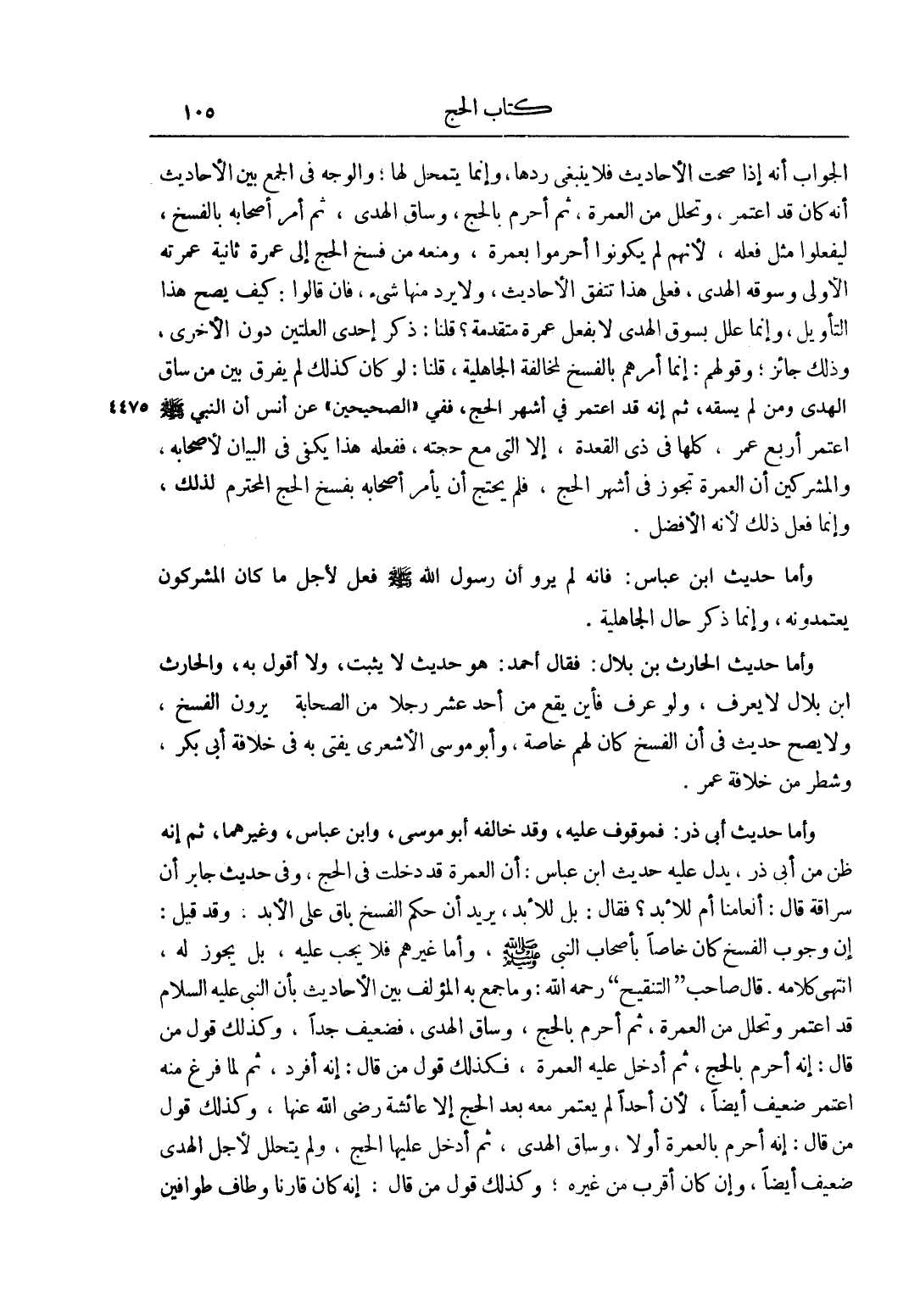 وَأَمَّا حَدِيثُ الْحَارِثِ بْنِ بِلَالٍ: فَقَالَ أَحْمَدُ: هُوَ حَدِيثٌ لَا يَثْبُتُ، وَلَا أَقُولُ بِهِ، وَالْحَارِثُ بْنُ بِلَالٍ لَا يُعْرَفُ، وَلَوْ عُرِفَ فَأَيْنَ يَقَعُ مِنْ أَحَدَ عَشَرَ رَجُلًا مِنْ الصَّحَابَةِ، يَرَوْنَ الْفَسْخَ، وَلَا يَصِحُّ حَدِيثٌ فِي أَنَّ الْفَسْخَ كَانَ لَهُمْ خَاصَّةً، وَأَبُو مُوسَى الْأَشْعَرِيُّ يُفْتِي بِهِ فِي خِلَافَةِ أَبِي بَكْرٍ، وَشَطْرٍ مِنْ خِلَافَةِ عُمَرَ.