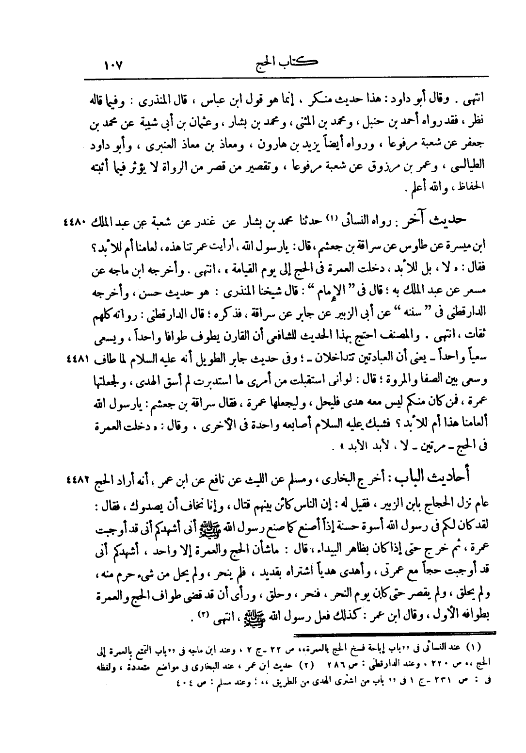 حَدِيثٌ آخَرُ: رَوَاهُ النَّسَائِيّ 1 حَدَّثَنَا مُحَمَّدُ بْنُ بَشَّارٍ عَنْ غُنْدَرٍ عَنْ شُعْبَةَ عَنْ عَبْدِ الْمَلِكِ بْنِ مَيْسَرَةَ عَنْ طَاوُسٍ عَنْ سُرَاقَةَ بْنِ جُعْشُمٍ، قَالَ: يَا رَسُولَ اللَّهِ، رَأَيْت عُمْرَتَنَا هَذِهِ، لِعَامِنَا أَمْ لِلْأَبَدِ؟ فَقَالَ: "لَا، بَلْ لِلْأَبَدِ، دَخَلَتْ الْعُمْرَةُ فِي الْحَجِّ إلَى يَوْمِ الْقِيَامَةِ"، انْتَهَى. وَأَخْرَجَهُ ابْنُ مَاجَهْ عَنْ مِسْعَرٍ عَنْ عَبْدِ الْمَلِكِ بِهِ، قَالَ فِي "الْإِمَامِ": قَالَ شَيْخُنَا الْمُنْذِرِيُّ: هُوَ حَدِيثٌ حَسَنٌ، وَأَخْرَجَهُ الدَّارَقُطْنِيُّ فِي "سُنَنِهِ" عَنْ أَبِي الزُّبَيْرِ عَنْ جَابِرٍ عَنْ سُرَاقَةَ، فَذَكَرَهُ، قَالَ الدَّارَقُطْنِيُّ: رُوَاتُهُ كُلُّهُمْ ثِقَاتٌ، انْتَهَى. وَالْمُصَنِّفُ احْتَجَّ بِهَذَا الْحَدِيثِ لِلشَّافِعِيِّ أَنَّ الْقَارِنَ يَطُوفُ طَوَافًا وَاحِدًا، وَيَسْعَى سعياً وحداً - يَعْنِي أَنَّ الْعِبَادَتَيْنِ تَتَدَاخَلَانِ - وَفِي حَدِيثِ جَابِرٍ الطَّوِيلِ أَنَّهُ عليه السلام لَمَّا طَافَ وَسَعَى بَيْنَ الصَّفَا وَالْمَرْوَةِ، قَالَ: " إنِّي لَوْ اسْتَقْبَلْت مِنْ أَمْرِي مَا اسْتَدْبَرْت لَمْ أَسُقْ الْهَدْيَ، وَلَجَعَلْتهَا عُمْرَةً، فَمَنْ كَانَ مِنْكُمْ لَيْسَ مَعَهُ هَدْيٌ فَلْيَحِلَّ، وَلْيَجْعَلْهَا عُمْرَةً"، فَقَالَ سُرَاقَةُ بْنُ جُعْشُمٍ: يَا رَسُولَ اللَّهِ أَلِعَامِنَا هَذَا أَمْ لِلْأَبَدِ؟ فَشَبَّكَ عليه السلام أَصَابِعَهُ وَاحِدَةً فِي الْأُخْرَى، وَقَالَ: " دَخَلَتْ الْعُمْرَةُ فِي الْحَجِّ - مَرَّتَيْنِ - لَا، بَلْ لِلْأَبَدِ".