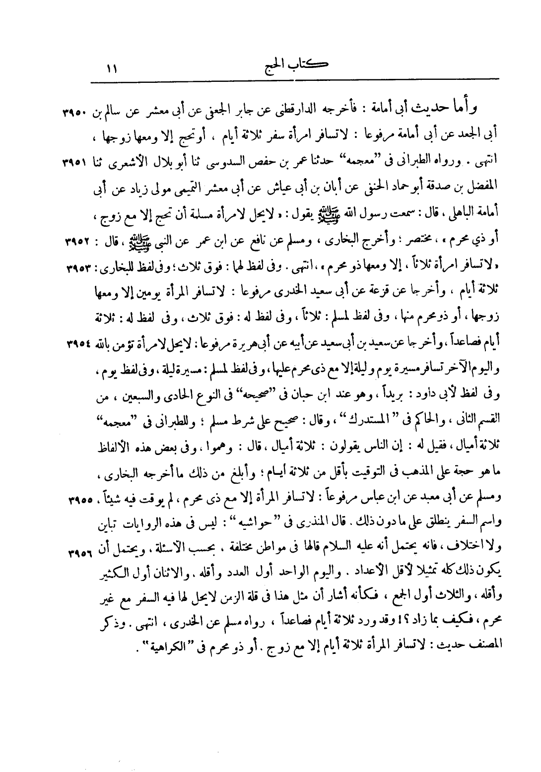 وَأَمَّا حَدِيثُ أَبِي أُمَامَةَ: فَأَخْرَجَهُ الدَّارَقُطْنِيُّ عَنْ جَابِرٍ الْجُعْفِيِّ عَنْ أَبِي مَعْشَرٍ عَنْ سَالِمِ بْنِ أَبِي الْجَعْدِ عَنْ أَبِي أُمَامَةَ مَرْفُوعًا، لَا تُسَافِرْ امْرَأَةٌ سَفَرَ ثَلَاثَةِ أَيَّامٍ، أَوْ تَحُجَّ إلَّا وَمَعَهَا زَوْجُهَا، انْتَهَى. وَرَوَاهُ الطَّبَرَانِيُّ فِي "مُعْجَمِهِ" حَدَّثَنَا عُمَرُ بْنُ حَفْصٍ السَّدُوسِيُّ ثَنَا أَبُو بِلَالٍ الْأَشْعَرِيُّ ثَنَا الْمُفَضَّلُ بْنُ صَدَقَةَ أَبُو حَمَّادٍ الْحَنَفِيُّ عَنْ أَبَانَ بْنِ أَبِي عَيَّاشٍ عَنْ أَبِي مَعْشَرٍ التَّمِيمِيِّ مَوْلَى زِيَادٍ عَنْ أَبِي أُمَامَةَ الْبَاهِلِيِّ، قَالَ: سَمِعْت رَسُولَ اللَّهِ صَلَّى اللَّهُ عَلَيْهِ وَسَلَّمَ يَقُولُ: "لَا يَحِلُّ لِامْرَأَةٍ مُسْلِمَةٍ أَنْ تَحُجَّ إلَّا مَعَ زوج، أو ذو مَحْرَمٍ"، مُخْتَصَرٌ، وَأَخْرَجَ الْبُخَارِيُّ، وَمُسْلِمٌ عَنْ نَافِعٍ عَنْ ابْنِ عُمَرَ عَنْ النَّبِيِّ صَلَّى اللَّهُ عَلَيْهِ وَسَلَّمَ، قَالَ: "لَا تُسَافِرْ امْرَأَةٌ ثَلَاثًا، إلَّا وَمَعَهَا ذُو مَحْرَمٍ"، انْتَهَى. وَفِي لَفْظٍ لَهُمَا: فَوْقَ ثَلَاثٍ، وَفِي لَفْظٍ لِلْبُخَارِيِّ: ثَلَاثَةَ أَيَّامٍ، وَأَخْرَجَا عَنْ قَزَعَةَ عَنْ أَبِي سَعِيدٍ الْخُدْرِيِّ مَرْفُوعًا: "لَا تُسَافِرْ الْمَرْأَةُ يَوْمَيْنِ إلَّا وَمَعَهَا زَوْجُهَا، أَوْ ذُو مَحْرَمٍ مِنْهَا"، وَفِي لَفْظٍ لِمُسْلِمٍ: ثَلَاثًا، وَفِي لَفْظٍ لَهُ: فَوْقَ ثَلَاثٍ، وَفِي لَفْظٍ لَهُ: ثَلَاثَةَ أَيَّامٍ فَصَاعِدًا، وَأَخْرَجَا عَنْ سَعِيدِ بْنِ أَبِي سَعِيدٍ عَنْ أَبِيهِ عَنْ أَبِي هُرَيْرَةَ مَرْفُوعًا: "لَا يَحِلُّ لِامْرَأَةٍ تُؤْمِنُ بِاَللَّهِ وَالْيَوْمِ الْآخِرِ تُسَافِرُ مَسِيرَةَ يَوْمٍ وَلَيْلَةٍ إلَّا مَعَ ذِي مَحْرَمٍ عَلَيْهَا"، وَفِي لَفْظٍ لِمُسْلِمٍ: "مَسِيرَةَ لَيْلَةٍ"، وَفِي لَفْظٍ يَوْمٍ، وَفِي لَفْظٍ لِأَبِي دَاوُد: بَرِيدًا، وَهُوَ عِنْدَ ابْنِ حِبَّانَ فِي "صَحِيحِهِ" فِي النَّوْعِ الْحَادِي وَالسَّبْعِينَ، مِنْ الْقِسْمِ الثَّانِي، وَالْحَاكِمِ فِي "الْمُسْتَدْرَكِ"، وَقَالَ: صَحِيحٌ عَلَى شَرْطِ مُسْلِمٍ، وَلِلطَّبَرَانِيِّ فِي "مُعْجَمِهِ" ثَلَاثَةَ أَمْيَالٍ، فَقِيلَ لَهُ: إنَّ الناس يقولون: ثلاثة أيام، قَالَ: وَهَمُوا، وَفِي بَعْضِ هَذِهِ الْأَلْفَاظِ مَا هُوَ حُجَّةٌ عَلَى الْمَذْهَبِ فِي التَّوْقِيتِ بِأَقَلَّ مِنْ ثَلَاثَةِ أَيَّامٍ، وَأَبْلَغُ مِنْ ذَلِكَ مَا أَخْرَجَهُ الْبُخَارِيُّ، وَمُسْلِمٌ عَنْ أَبِي مَعْبَدٍ عَنْ ابْنِ عَبَّاسٍ مَرْفُوعًا: "لَا تُسَافِرْ الْمَرْأَةُ إلَّا مَعَ ذي محرم"، لم يُوَقِّتْ فِيهِ شَيْئًا، وَاسْمُ السَّفَرِ يَنْطَلِقُ عَلَى مَا دُونَ ذَلِكَ، قَالَ الْمُنْذِرِيُّ فِي "حَوَاشِيهِ": لَيْسَ فِي هَذِهِ الرِّوَايَاتِ تَبَايُنٌ وَلَا اخْتِلَافٌ، فَإِنَّهُ يُحْتَمَلُ أَنَّهُ عليه السلام قَالَهَا فِي مَوَاطِنَ مُخْتَلِفَةٍ، بِحَسْبِ الْأَسْئِلَةِ، وَيُحْتَمَلُ أَنْ يَكُونَ ذَلِكَ كُلُّهُ تَمْثِيلًا لِأَقَلِّ الْأَعْدَادِ، وَالْيَوْمُ الْوَاحِدُ أَوَّلُ الْعَدَدِ وَأَقَلُّهُ، وَالِاثْنَانِ أَوَّلُ الْكَثِيرِ وَأَقَلُّهُ، وَالثَّلَاثُ أَوَّلُ الْجَمْعِ، فَكَأَنَّهُ أَشَارَ أَنَّ مِثْلَ هَذَا فِي قِلَّةِ الزَّمَنِ لَا يَحِلُّ لَهَا فِيهِ السَّفَرُ مَعَ غَيْرِ مَحْرَمٍ، فَكَيْفَ بِمَا زَادَ؟! وَقَدْ وَرَدَ ثَلَاثَةُ أَيَّامٍ فَصَاعِدًا، رَوَاهُ مُسْلِمٌ عَنْ الْخُدْرِيِّ، انْتَهَى. وَذَكَرَ الْمُصَنِّفُ حَدِيثَ: "لَا تُسَافِرْ الْمَرْأَةُ ثَلَاثَةَ أَيَّامٍ إلَّا مَعَ زَوْجٍ، أو ذو مَحْرَمٍ " فِي الْكَرَاهِيَةِ.