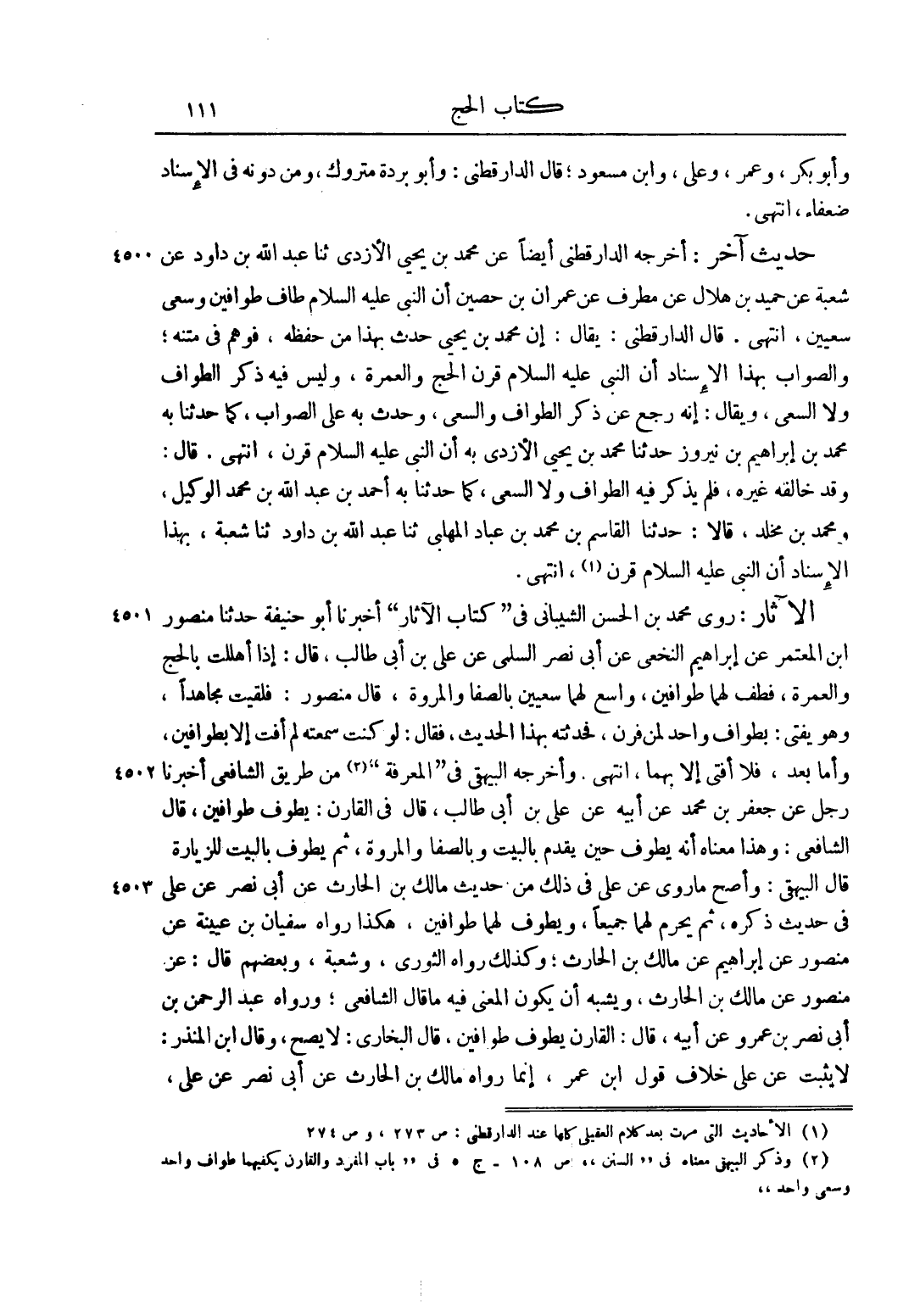 الْآثَارُ: رَوَى مُحَمَّدُ بْنُ الْحَسَنِ الشَّيْبَانِيُّ فِي "كِتَابِ الْآثَارِ" أَخْبَرَنَا أَبُو حَنِيفَةَ حَدَّثَنَا مَنْصُورُ بْنُ الْمُعْتَمِرِ عَنْ إبْرَاهِيمَ النَّخَعِيّ عَنْ أَبِي نَصْرٍ السُّلَمِيُّ عَنْ عَلِيِّ بْنِ أَبِي طَالِبٍ، قَالَ: إذَا أَهْلَلْت للحج وَالْعُمْرَةِ، فَطُفْ لَهُمَا طَوَافَيْنِ، وَاسْعَ لَهُمَا سَعْيَيْنِ بِالصَّفَا وَالْمَرْوَةِ، قَالَ مَنْصُورٌ: فَلَقِيت مُجَاهِدًا، وَهُوَ يُفْتِي: بِطَوَافٍ وَاحِدٍ لِمَنْ قَرَنَ، فَحَدَّثْته بِهَذَا الْحَدِيثِ، فَقَالَ: لَوْ كُنْت سَمِعْته لَمْ أُفْتِ إلَّا بِطَوَافَيْنِ، وَأَمَّا بَعْدُ، فَلَا أُفْتِي إلَّا بِهِمَا، انْتَهَى. وَأَخْرَجَهُ الْبَيْهَقِيُّ فِي "الْمَعْرِفَةِ" 2 مِنْ طَرِيقِ الشَّافِعِيِّ أَخْبَرَنَا رَجُلٌ عَنْ جَعْفَرِ بْنِ مُحَمَّدٍ عَنْ أَبِيهِ عَنْ عَلِيِّ بْنِ أَبِي طَالِبٍ، قَالَ فِي الْقَارِنِ: يَطُوفُ طَوَافَيْنِ، قَالَ الشَّافِعِيُّ: وَهَذَا مَعْنَاهُ أَنَّهُ يَطُوفُ حين تقدم بِالْبَيْتِ وَبِالصَّفَا وَالْمَرْوَةِ، ثُمَّ يَطُوفُ بِالْبَيْتِ لِلزِّيَارَةِ قَالَ الْبَيْهَقِيُّ: وَأَصَحُّ مَا رُوِيَ عَنْ عَلِيٍّ فِي ذَلِكَ مِنْ حَدِيثِ مَالِكِ بْنِ الْحَارِثِ عَنْ أَبِي نَصْرٍ عَنْ عَلِيٍّ فِي حَدِيثٍ ذَكَرَهُ، ثُمَّ يُحْرِمُ لَهُمَا جَمِيعًا، وَيَطُوفُ لَهُمَا طَوَافَيْنِ، هَكَذَا رَوَاهُ سُفْيَانُ بْنُ عُيَيْنَةَ عَنْ مَنْصُورٍ عَنْ إبْرَاهِيمَ عَنْ مَالِكِ بْنِ الْحَارِثِ، وَكَذَلِكَ رَوَاهُ الثَّوْرِيُّ، وَشُعْبَةُ، وَبَعْضُهُمْ قَالَ: عَنْ مَنْصُورٍ عَنْ مَالِكِ بْنِ الْحَارِثِ، وَيُشْبِهُ أَنْ يَكُونَ الْمَعْنَى فِيهِ مَا قَالَ الشَّافِعِيُّ، وَرَوَاهُ عَبْدُ الرَّحْمَنِ بْنِ أَبِي نَصْرِ بْنِ عَمْرٍو عَنْ أَبِيهِ، قَالَ: الْقَارِنُ يَطُوفُ طَوَافَيْنِ، قَالَ الْبُخَارِيُّ: لَا يَصِحُّ، وَقَالَ ابْنُ الْمُنْذِرِ: لَا يَثْبُتُ عَنْ عَلِيٍّ خِلَافَ قَوْلِ ابْنِ عُمَرَ، إنَّمَا رَوَاهُ مَالِكُ بْنُ الْحَارِثِ عَنْ أَبِي نَصْرٍ عَنْ عَلِيٍّ،