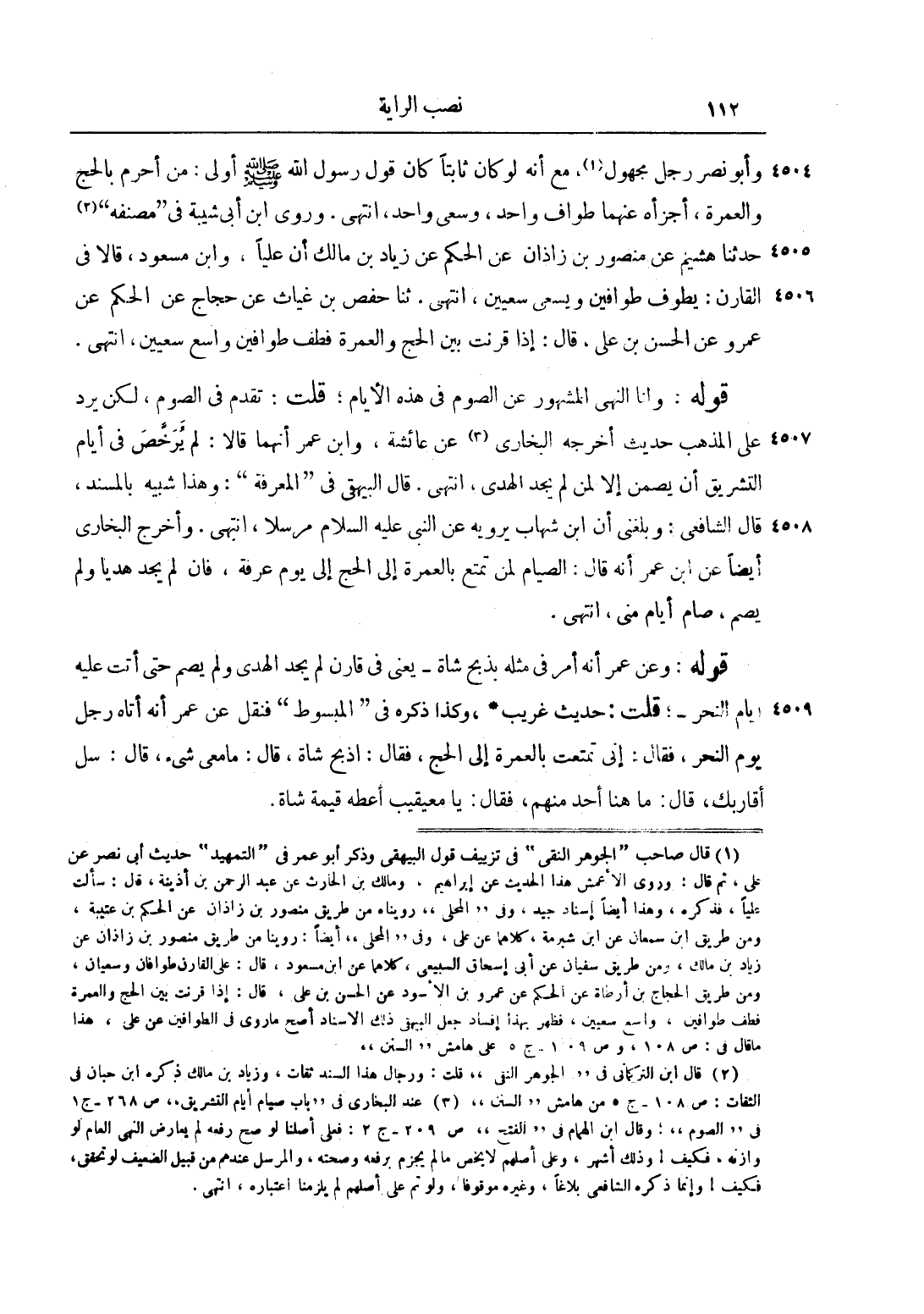 1 قال صاحب "الجوهر النقي - في تزييف قول البيهقي": وذكر أبو عمر في "التمهيد" حديث أبي نصر عن علي، ثم قال: وروى الأعمش هذا الحديث عن إبراهيم، ومالك بن الحارث عن عبد الرحمن بن أذينة، قال: سألت علياً، فذكره، وهذا أيضاً إسناد جيد، وفي "المحلى" رويناه من طريق منصور بن زاذان عن الحكم بن عتيبة، ومن طريق ابن سمعان عن ابن شبرمة، كلاهما عن علي، وفي "المحلى" أيضاً: روينا من طريق منصور بن زاذان عن زياد بن مالك، ومن طريق سفيان عن أبي إسحاق السبيعي، كلاهما عن ابن مسعود، قال: على القارن طوافان وسعيان، ومن طريق الحجاج بن أرطاة عن الحكم عن عمرو بن الأسود عن الحسن بن علي، قال: إذا قرنت بين الحج والعمرة فطف طوافين، واسع سعيين، فظهر بهذا إفساد جعل البيهقي ذلك الإسناد أصح ما روي في الطوافين عن علي، هذا ما قال في: ص 108، وص 109 - ج 5 على هامش "السنن".