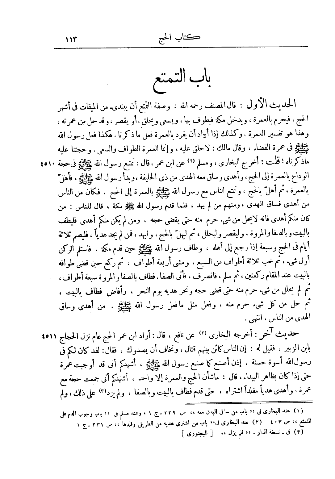 الْحَدِيثُ الْأَوَّلُ: قَالَ الْمُصَنِّفُ رحمه الله: وَصِفَةُ التَّمَتُّعِ أَنْ يَبْتَدِئَ مِنْ الْمِيقَاتِ فِي أَشْهُرِ الْحَجِّ، فَيُحْرِمَ بِالْعُمْرَةِ، وَيَدْخُلَ مَكَّةَ فَيَطُوفَ بِهَا، وَيَسْعَى، وَيَحْلِقَ، أَوْ يُقَصِّرَ، وَقَدْ حَلَّ مِنْ عُمْرَتِهِ، وَهَذَا هُوَ تَفْسِيرُ الْعُمْرَةِ، وَكَذَلِكَ إذَا أَرَادَ أَنْ يُفْرِدَ بِالْعُمْرَةِ فَعَلَ مَا ذَكَرْنَا، هَكَذَا فَعَلَ رَسُولُ اللَّهِ صَلَّى اللَّهُ عَلَيْهِ وَسَلَّمَ فِي عُمْرَةِ الْقَضَاءِ، وَقَالَ مَالِكٌ: لَا حَلْقَ عَلَيْهِ، وَإِنَّمَا الْعُمْرَةُ الطَّوَافُ وَالسَّعْيُ. وَحُجَّتُنَا عَلَيْهِ مَا ذَكَرْنَاهُ، قُلْت: أَخْرَجَ الْبُخَارِيُّ، وَمُسْلِمٌ 1 عَنْ ابْنِ عُمَرَ، قَالَ: تَمَتَّعَ رَسُولُ اللَّهِ صَلَّى اللَّهُ عَلَيْهِ وَسَلَّمَ فِي حَجَّةِ الْوَدَاعِ بِالْعُمْرَةِ إلَى الْحَجِّ، وَأَهْدَى وَسَاقَ مَعَهُ الْهَدْيَ مِنْ ذِي الْحُلَيْفَةِ، وَبَدَأَ رَسُولُ اللَّهِ صَلَّى اللَّهُ عَلَيْهِ وَسَلَّمَ، فَأَهَلَّ بِالْعُمْرَةِ، ثُمَّ أَهَلَّ بِالْحَجِّ، وَتَمَتَّعَ النَّاسُ مَعَ رَسُولِ اللَّهِ صَلَّى اللَّهُ عَلَيْهِ وَسَلَّمَ بِالْعُمْرَةِ إلَى الْحَجِّ , فَكَانَ مِنْ النَّاسِ مَنْ أَهْدَى فَسَاقَ الْهَدْيَ , وَمِنْهُمْ مَنْ لَمْ يُهْدِ , فَلَمَّا قَدِمَ رَسُولُ اللَّهِ صَلَّى اللَّهُ عَلَيْهِ وَسَلَّمَ مِنْ مَكَّةَ، قَالَ لِلنَّاسِ: " مَنْ كَانَ مِنْكُمْ أَهْدَى فَإِنَّهُ لَا يَحِلُّ مِنْ شَيْءٍ حَرُمَ مِنْهُ حَتَّى يَقْضِيَ حَجَّهُ، وَمَنْ لَمْ يَكُنْ مِنْكُمْ أَهْدَى فَلْيَطُفْ بِالْبَيْتِ وَبِالصَّفَا وَالْمَرْوَةِ، وَلِيُقَصِّرْ وَلْيَحْلُلْ، ثُمَّ لِيُهِلَّ بِالْحَجِّ، وَلْيَهْدِ، فَمَنْ لَمْ يَجِدْ هَدْيًا، فَلْيَصُمْ ثَلَاثَةَ أَيَّامٍ فِي الْحَجِّ وَسَبْعَةً إذَا رَجَعَ إلَى أَهْلِهِ"، وَطَافَ رَسُولُ اللَّهِ صَلَّى اللَّهُ عَلَيْهِ وَسَلَّمَ حِينَ قَدِمَ مَكَّةَ، فَاسْتَلَمَ الرُّكْنَ أَوَّلَ شَيْءٍ، ثُمَّ خَبَّ ثَلَاثَةَ أَطْوَافٍ مِنْ السَّبْعِ، وَمَشَى أَرْبَعَةَ أَطْوَافٍ، ثُمَّ رَكَعَ حِينَ قَضَى طَوَافَهُ بِالْبَيْتِ عِنْدَ الْمَقَامِ رَكْعَتَيْنِ، ثُمَّ سَلَّمَ، فَانْصَرَفَ، فَأَتَى الصَّفَا، فَطَافَ بِالصَّفَا وَالْمَرْوَةِ سَبْعَةَ أَطْوَافٍ، ثُمَّ لَمْ يَحْلِلْ مِنْ شَيْءٍ حَرُمَ مِنْهُ حَتَّى قَضَى حَجَّهُ وَنَحَرَ هَدْيَهُ يَوْمَ النَّحْرِ، وَأَفَاضَ فَطَافَ بِالْبَيْتِ، ثُمَّ حَلَّ مِنْ كُلِّ شَيْءٍ حَرُمَ مِنْهُ، وَفَعَلَ مِثْلَ مَا فَعَلَ رَسُولُ اللَّهِ صَلَّى اللَّهُ عَلَيْهِ وَسَلَّمَ، مَنْ أَهْدَى وَسَاقَ الْهَدْيَ مِنْ النَّاسِ، انْتَهَى.
