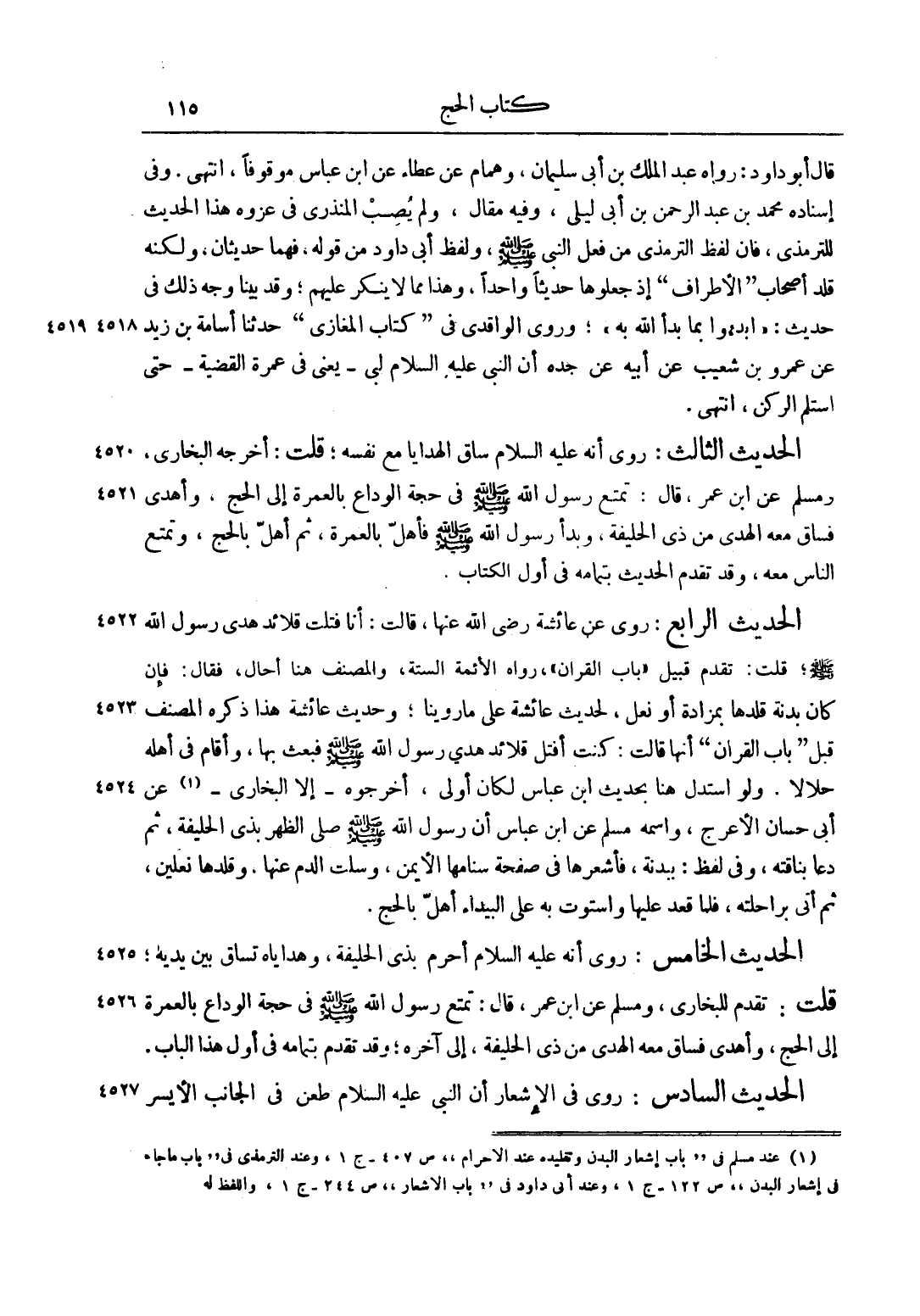 الْحَدِيثُ الْخَامِسُ: رُوِيَ أَنَّهُ عليه السلام أَحْرَمَ بِذِي الْحُلَيْفَةِ، وَهَدَايَاهُ تُسَاقُ بَيْنَ يَدَيْهِ، قُلْت: تَقَدَّمَ لِلْبُخَارِيِّ، وَمُسْلِمٍ عَنْ ابْنِ عُمَرَ، قَالَ: تَمَتَّعَ رَسُولُ اللَّهِ صَلَّى اللَّهُ عَلَيْهِ وَسَلَّمَ فِي حَجَّةِ الْوَدَاعِ بِالْعُمْرَةِ إلَى الْحَجِّ، وَأَهْدَى فَسَاقَ مَعَهُ الْهَدْيَ مِنْ ذِي الْحُلَيْفَةِ، إلَى آخِرِهِ، وَقَدْ تَقَدَّمَ بِتَمَامِهِ فِي أَوَّلِ هَذَا الْبَابِ.