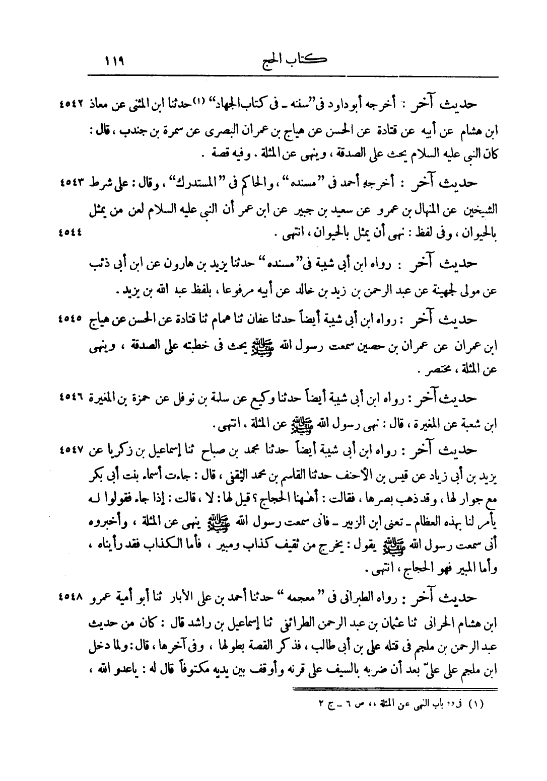 حَدِيثٌ آخَرَ: أَخْرَجَهُ أَبُو دَاوُد فِي "سُنَنِهِ - فِي كِتَابِ الْجِهَادِ"1 حَدَّثَنَا ابْنُ الْمُثَنَّى عَنْ مُعَاذِ بْنِ هِشَامٍ عَنْ أَبِيهِ عَنْ قَتَادَةَ عَنْ الْحَسَنِ عَنْ هَيَّاجِ بْنِ عِمْرَانَ الْبَصْرِيِّ عَنْ سَمُرَةَ بْنِ جُنْدُبٍ، قَالَ: كَانَ النَّبِيُّ عليه السلام يَحُثُّ عَلَى الصَّدَقَةِ، وَيَنْهَى عَنْ الْمُثْلَةِ، وَفِيهِ قِصَّةٌ.